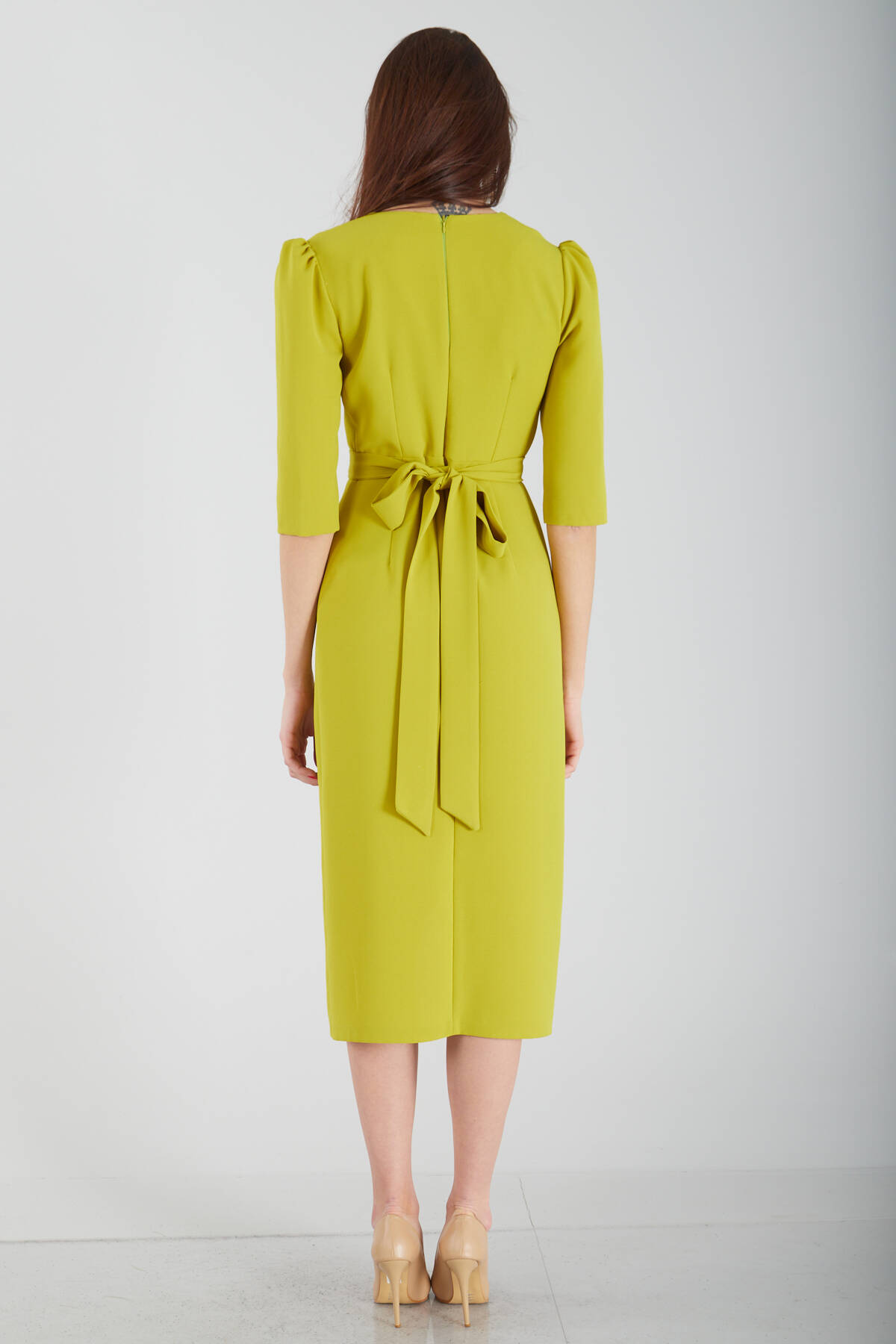 Fıstık Kruvaze Yaka Midi Boy Krep Elbise 0104010.22