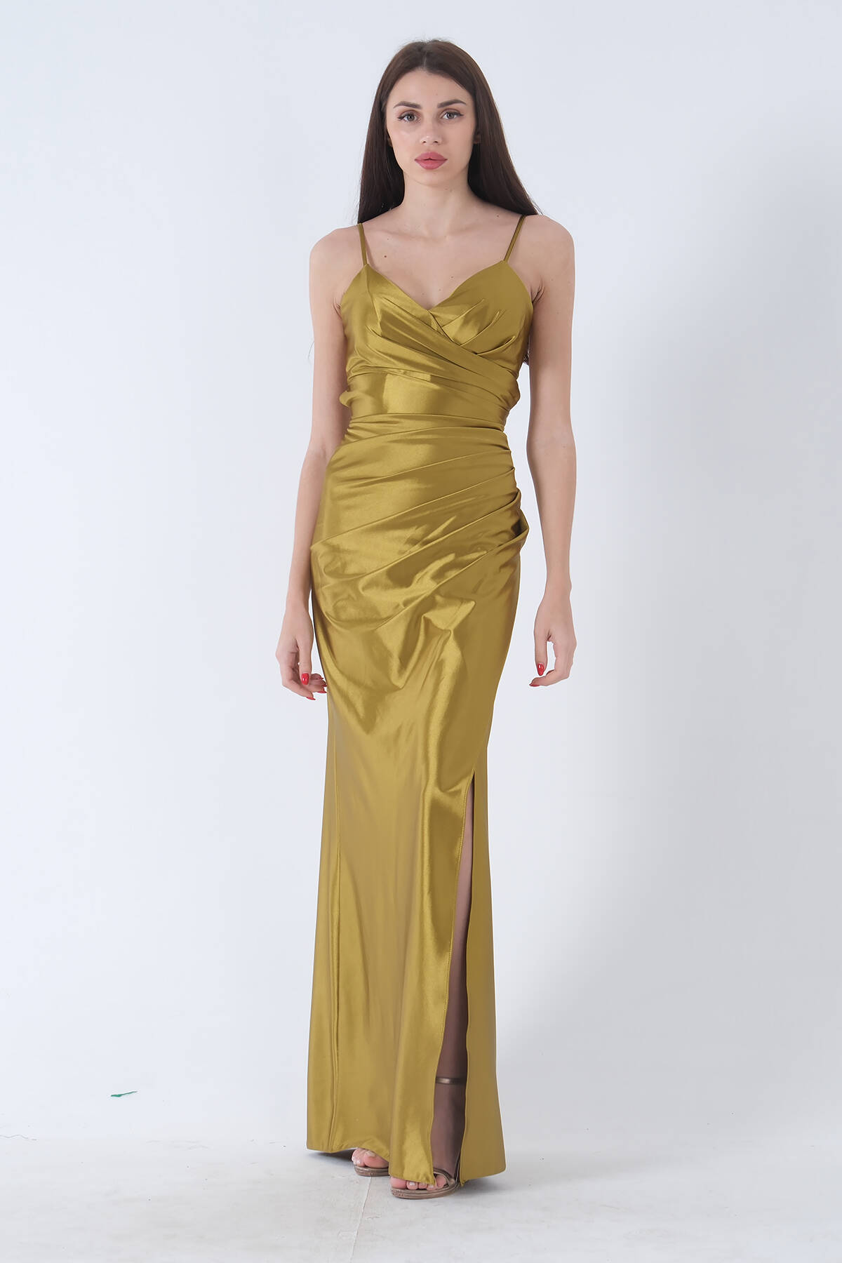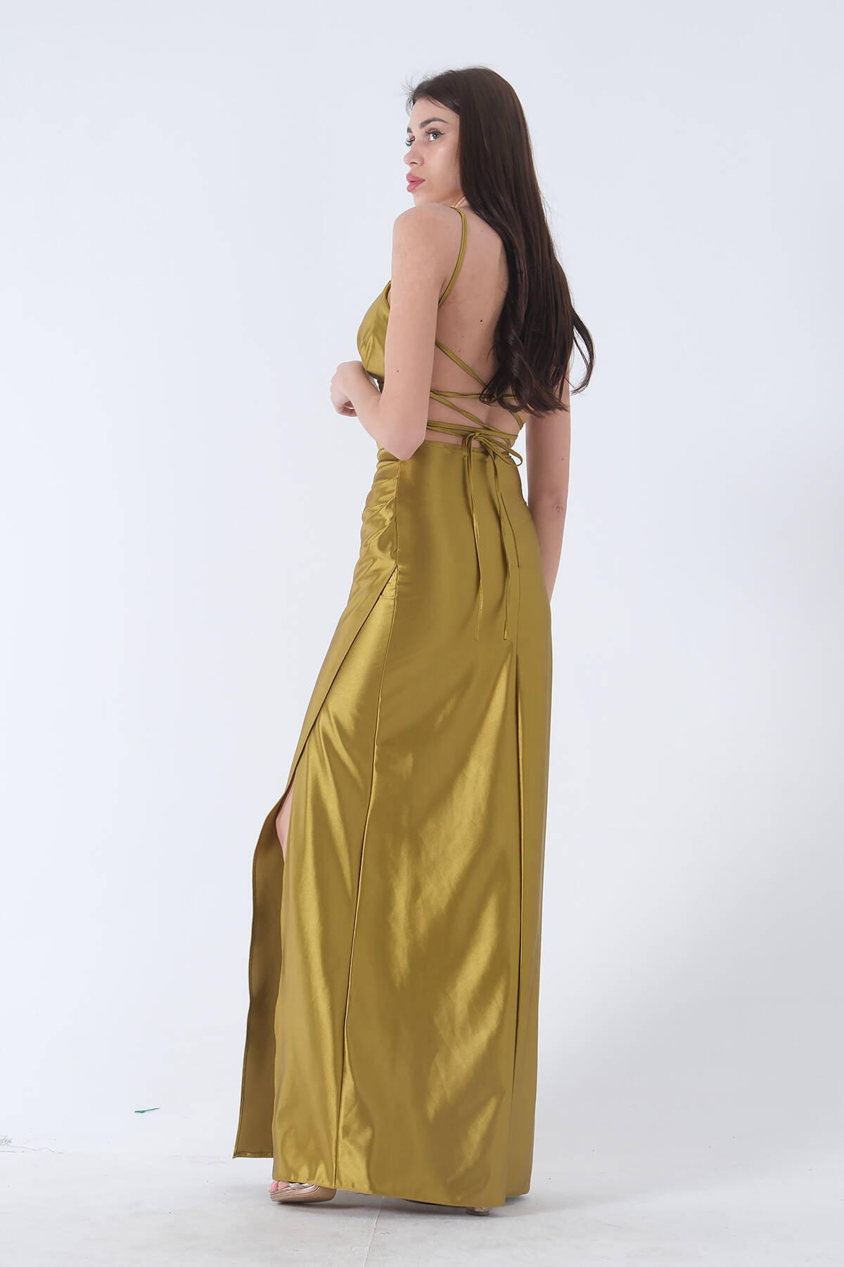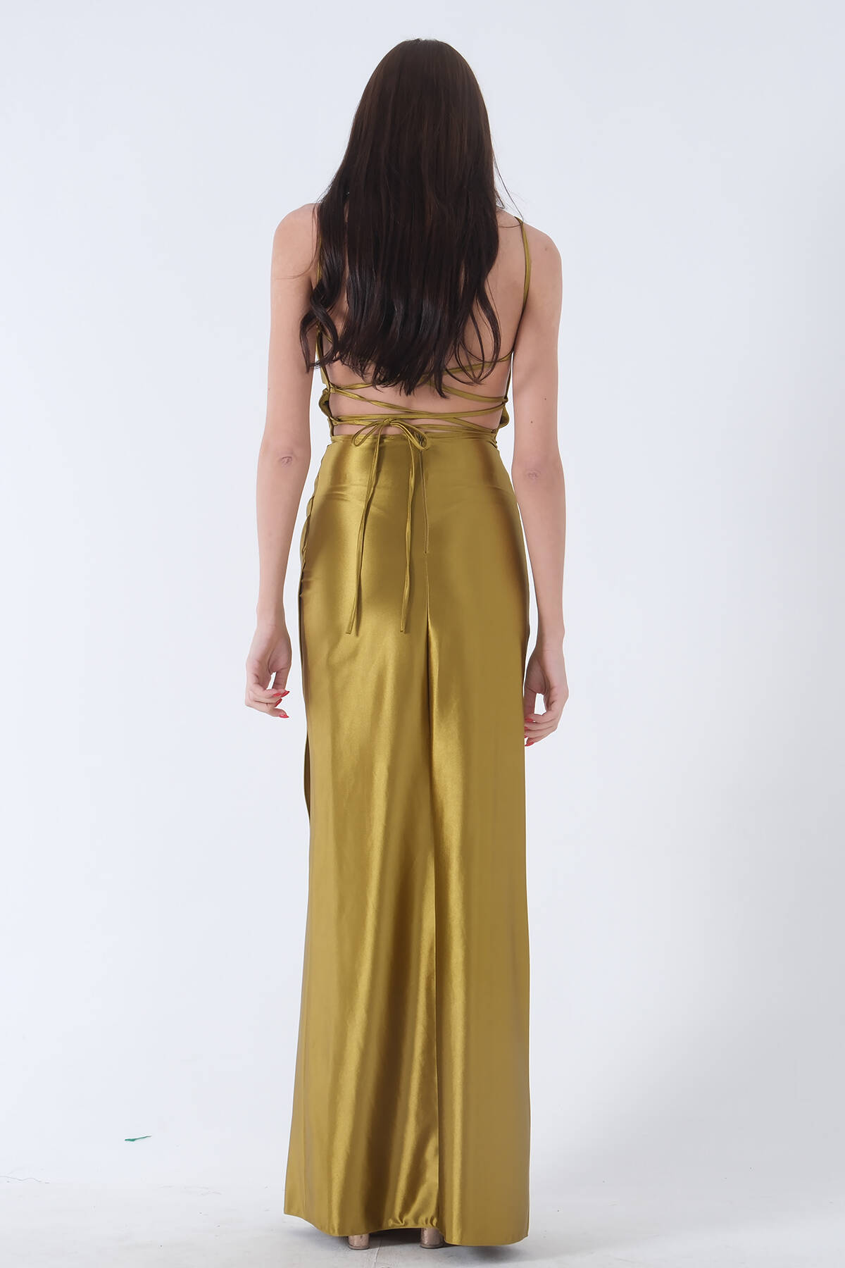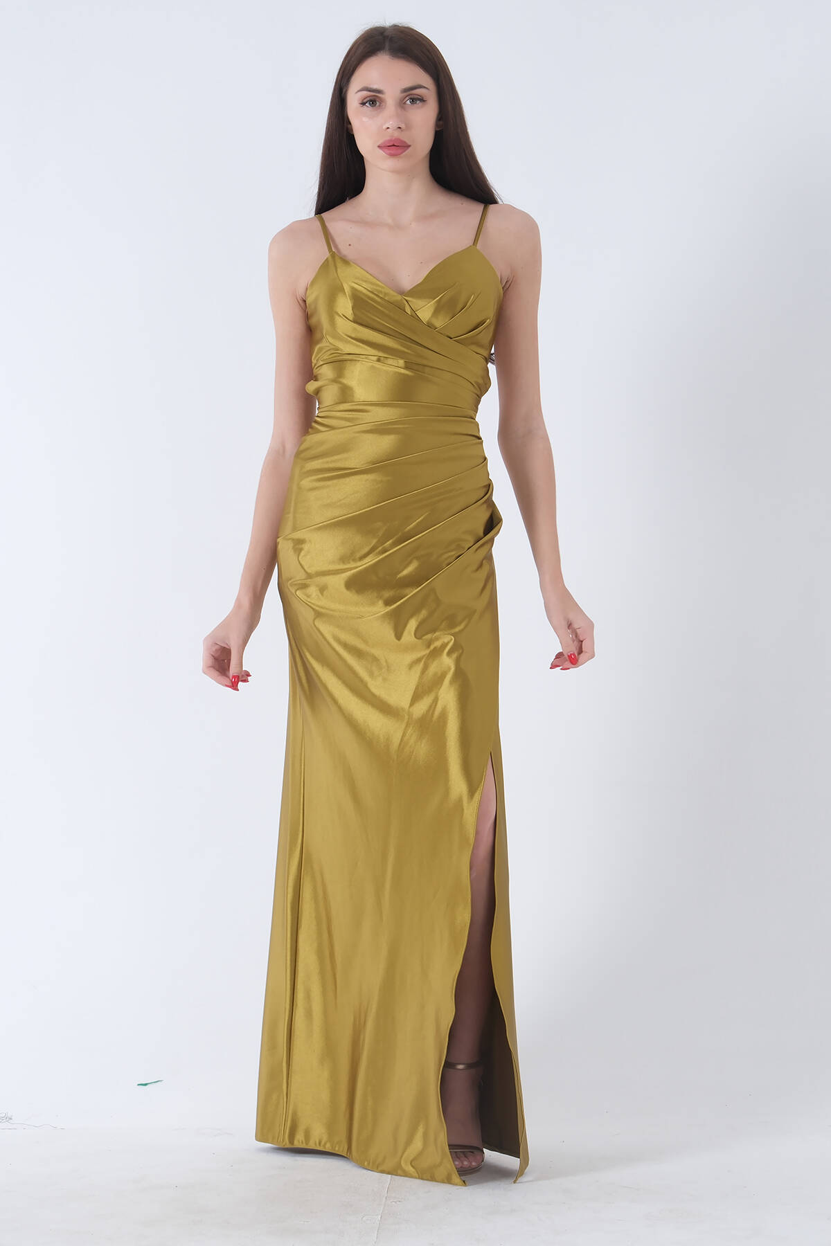Modelin Ölçüleri : Boy: 1.80 cm / Göğüs: 88 cm / Bel: 69 cm /Basen : 94 cm Mankenin Üzerindeki Ürün 38/M Bedendir %100 Polyester İnce Askılı V Yaka Drape Detaylı Sırt Dekoltesi Bedene Göre Ayarlanabilir Bağcıklı Yırtmaçlı Saten Abiye Elbise Ürün Boyu : 150 cm Stüdyo Çekimlerinde Renkler Işık Farklılıgından Dolayı Değişiklik Gösterebilir (Dikkat! Ürünlerimiz güvenlik bandı ile gönderilmektedir . Güvenlik bandı olmayan ürünlerin iadesi kabul edilmeyecektir)