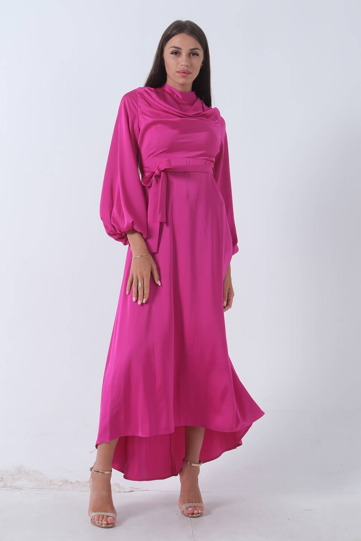 Fuşya Degaje Saten Balon Kol Tesettür Elbise 5305035.12