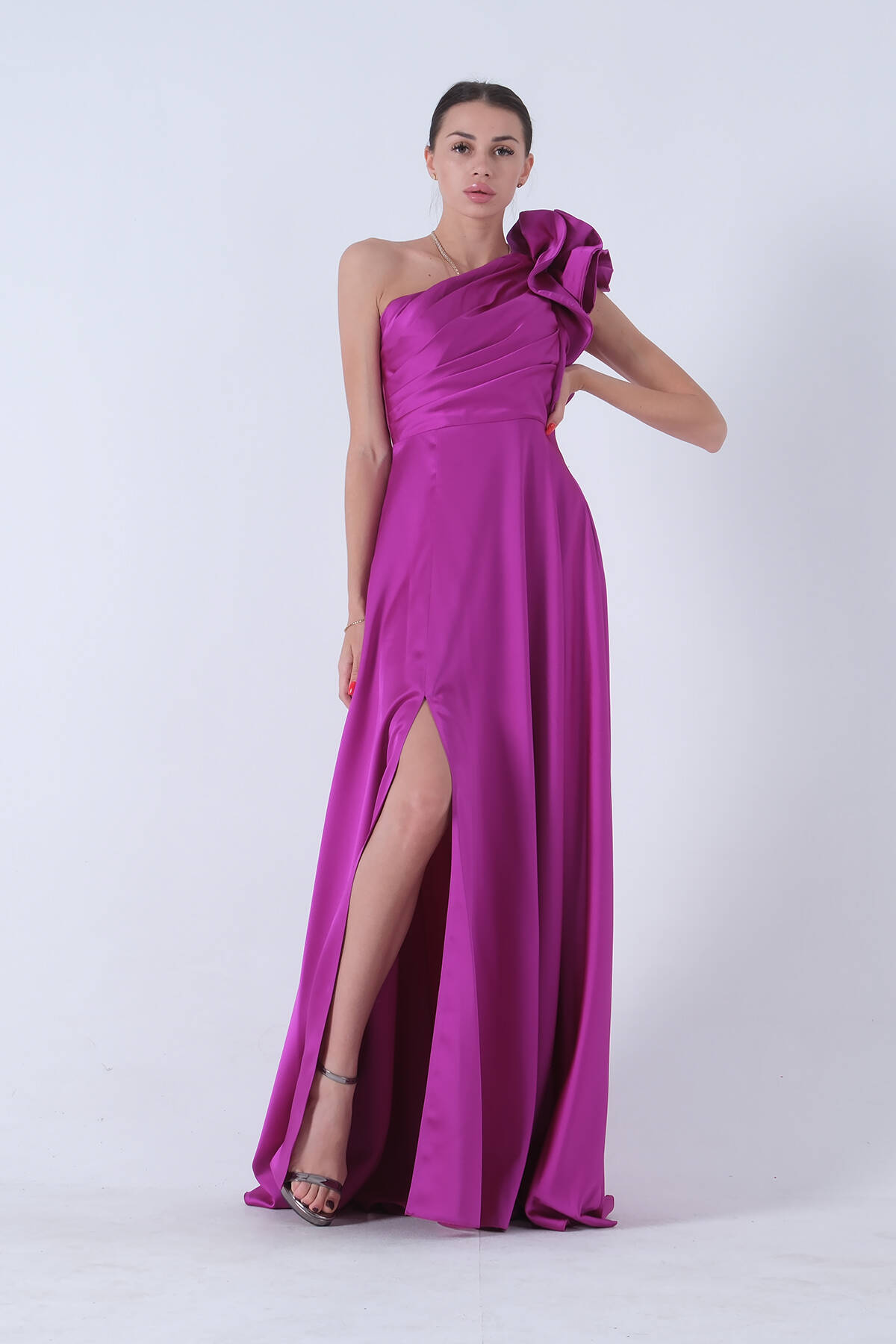 Fuşya Saten Omuz Fiyonklu Abiye Elbise 1302192.12