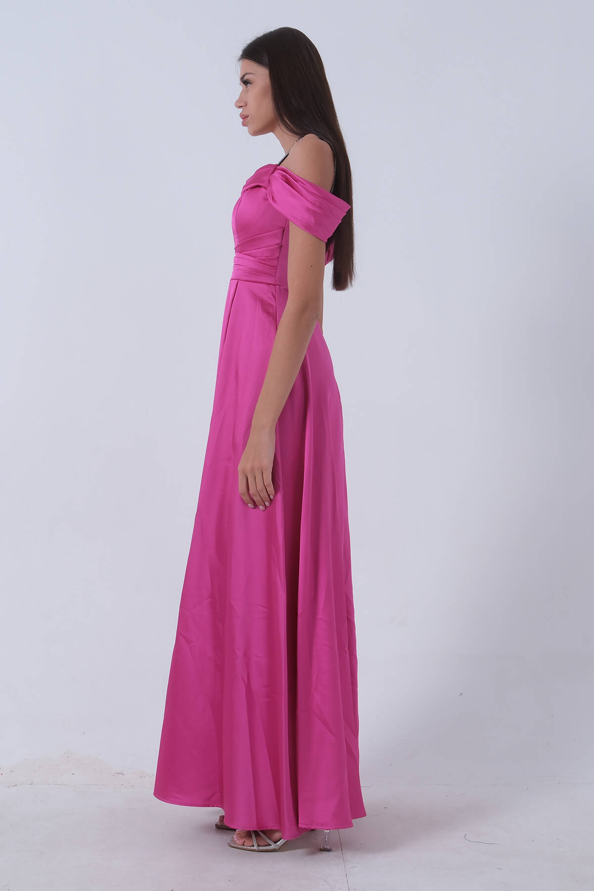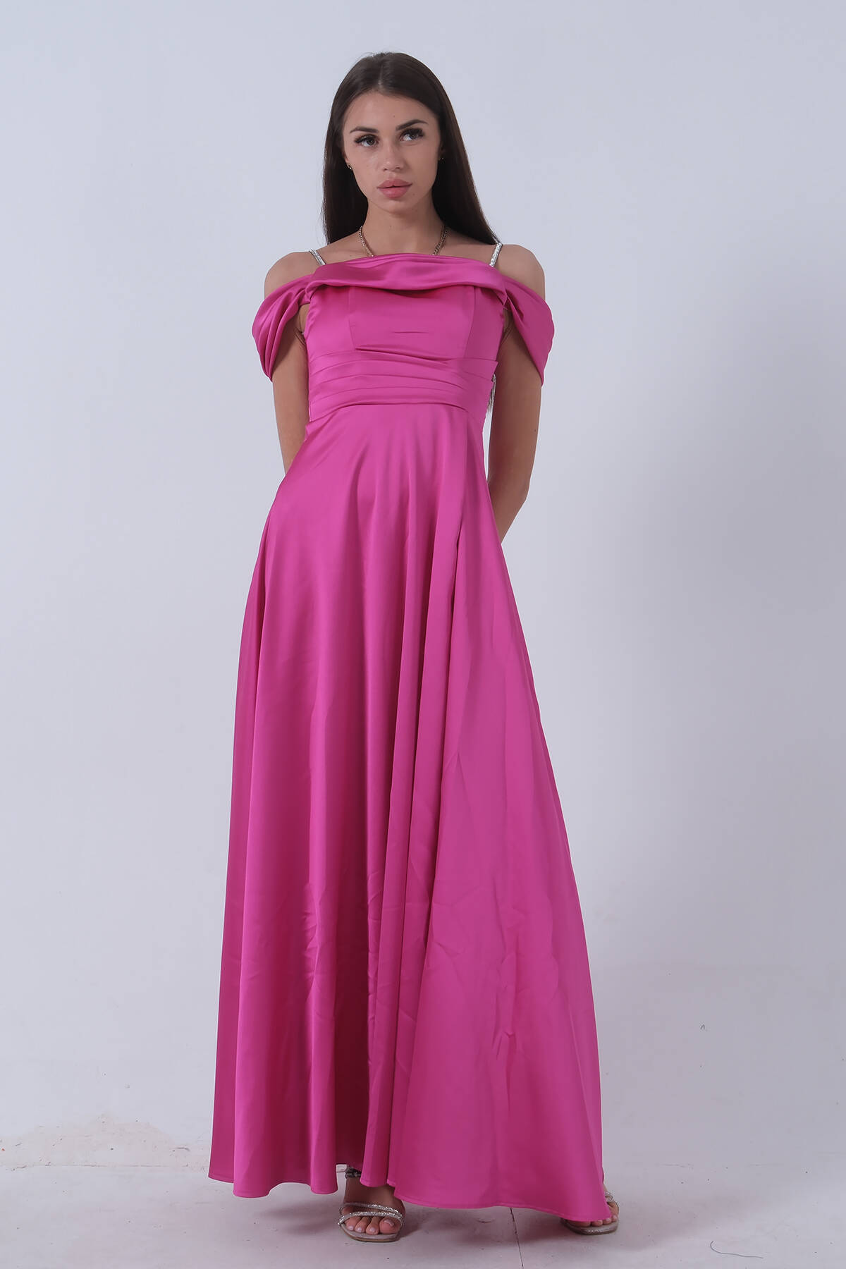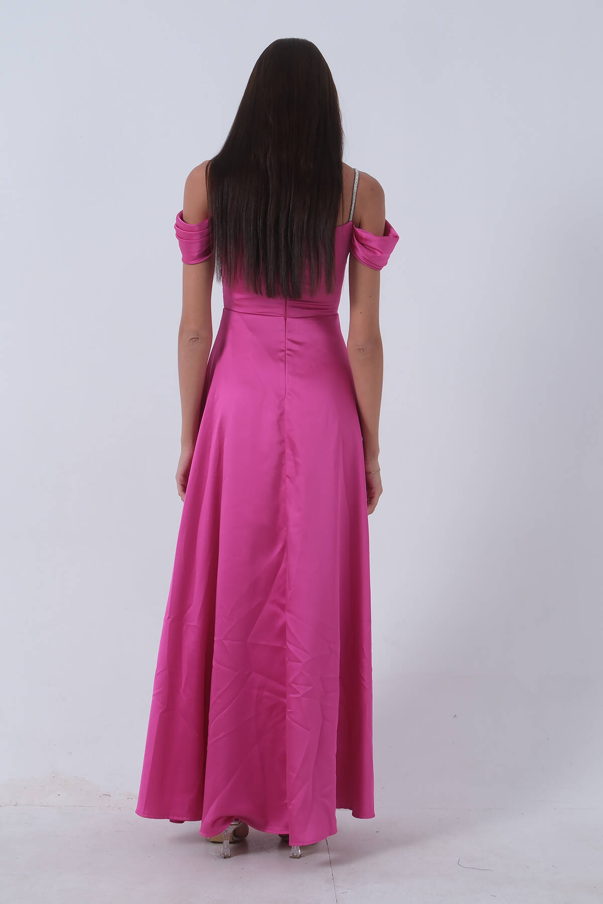 Fuşya Taş Askılı Düşük Kol Saten Abiye 0806118.12
