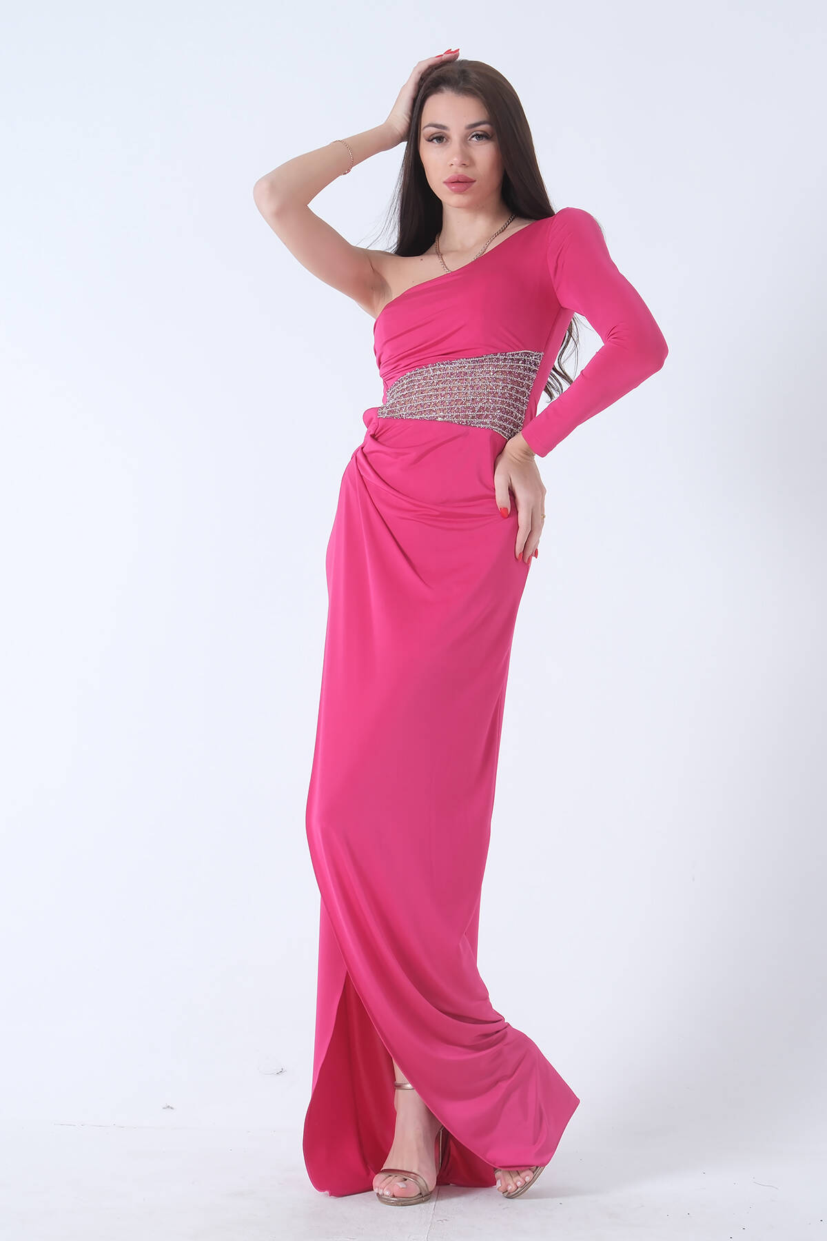 Tek Kol Bel Dekolteli Taş Detaylı Yırtmaçlı Balık Abiye