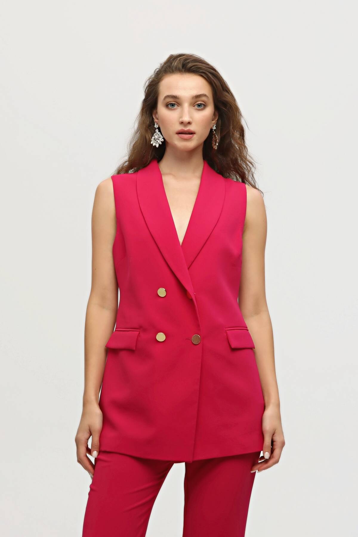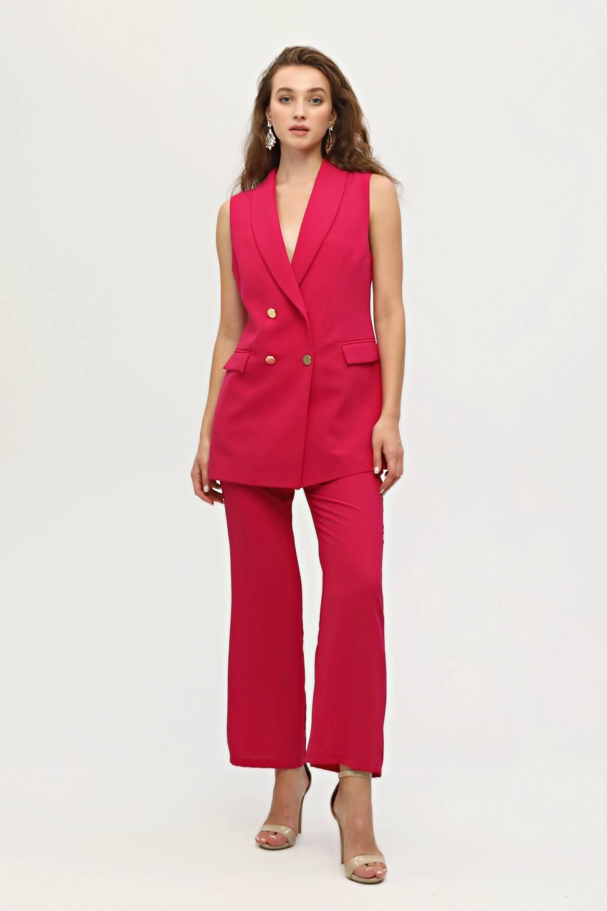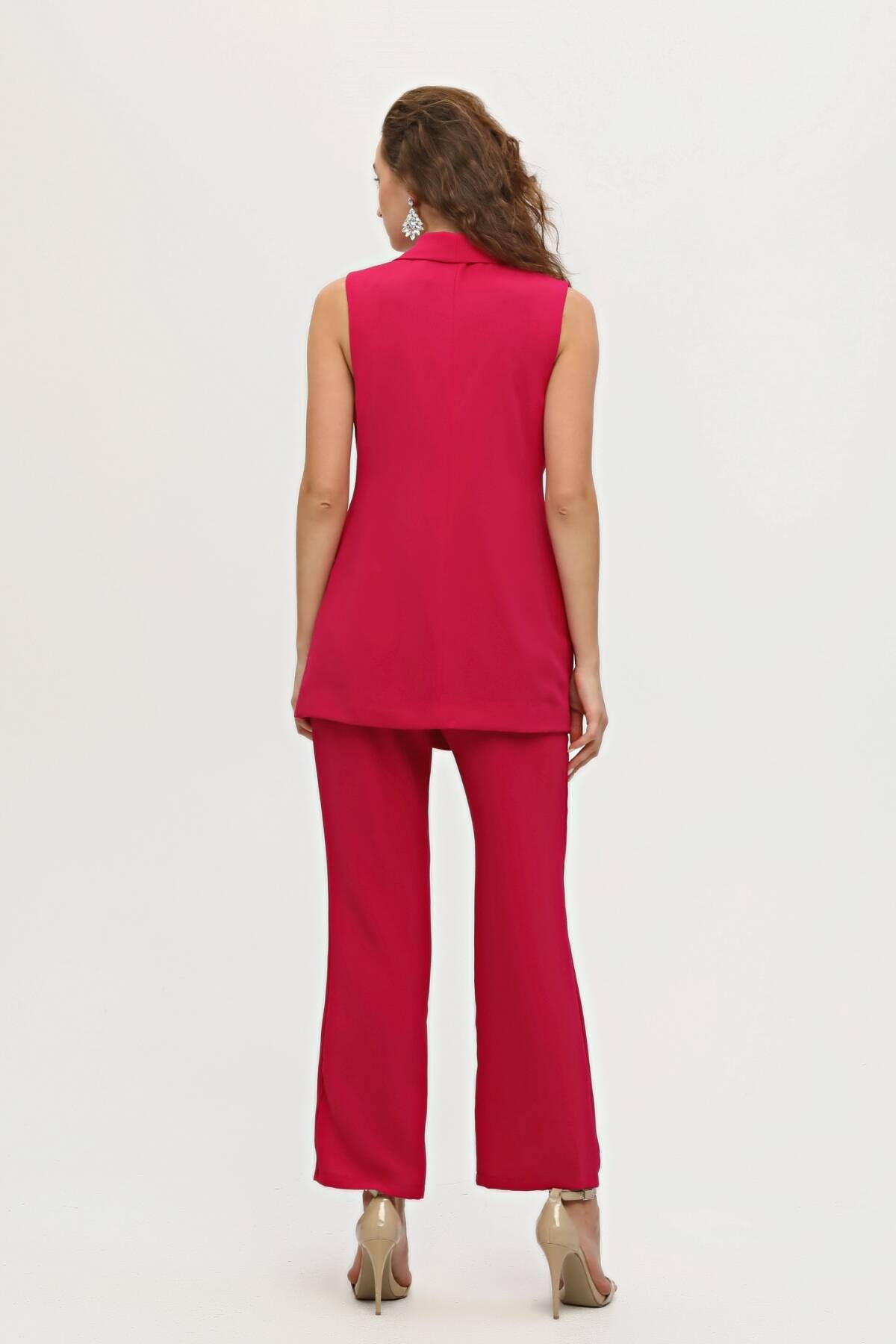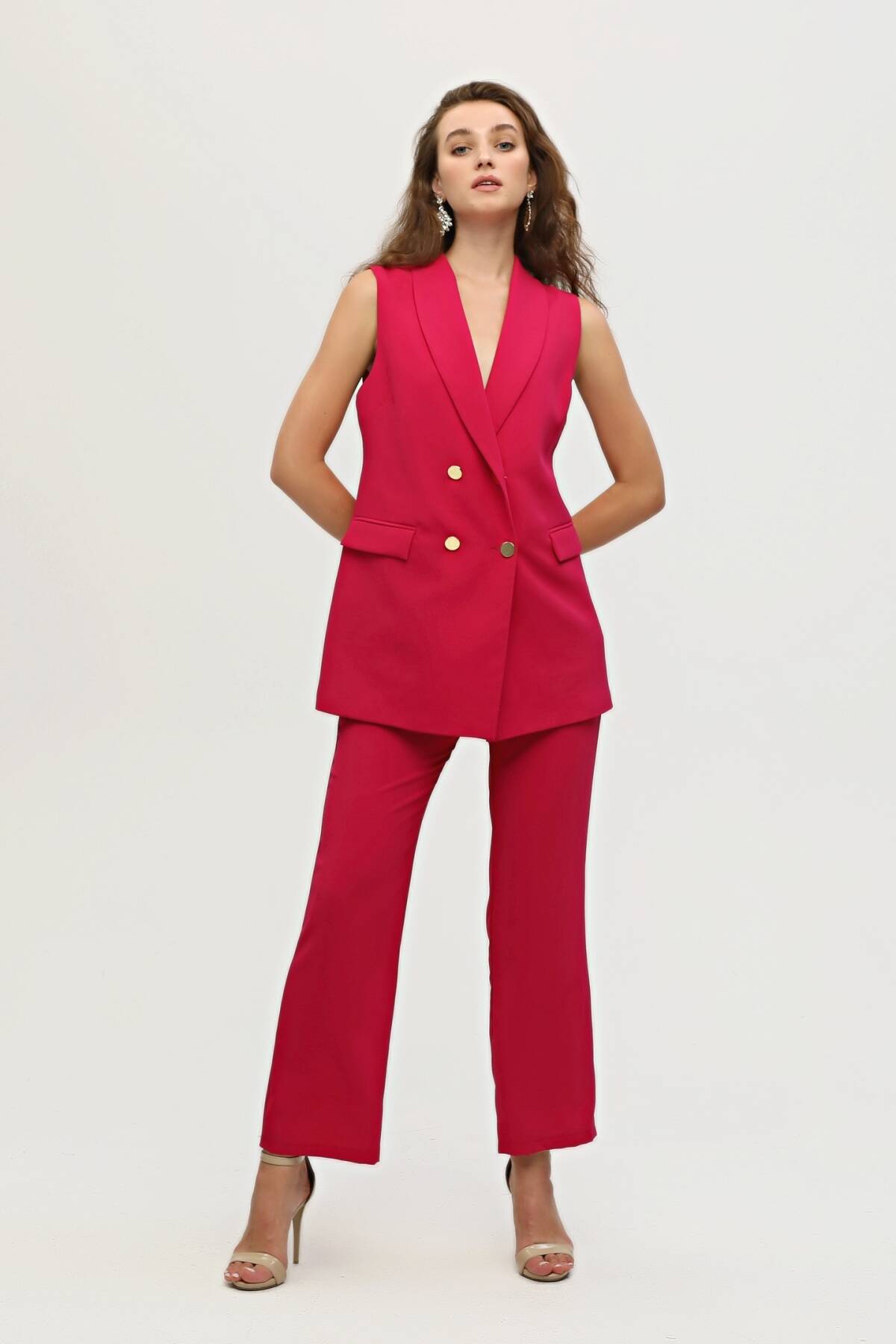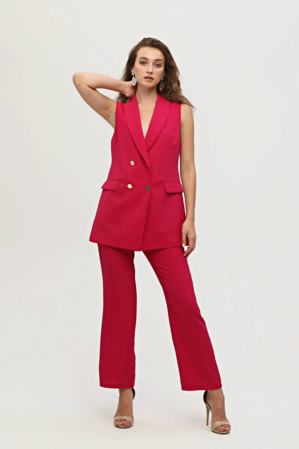 Modelin Ölçüleri : Boy: 1.80 cm / Göğüs: 88 cm / Bel: 69 cm /Basen : 94 cm Mankenin Üzerindeki Ürün 36/XS Bedendir %100 Polyester Kolsuz Klasik Yaka Cep Görünüm Detaylı Astarlı Çift Düğme Kapamalı Yelek Yüksek Bel Yandan Fermuarlı Bol Paça Pantolonlu Krep Kumaş Takım Ürün Boyu : Yelek 78 cm Pantolon 104 cm Stüdyo Çekimlerinde Renkler Işık Farklılıgından Dolayı Değişiklik Gösterebilir