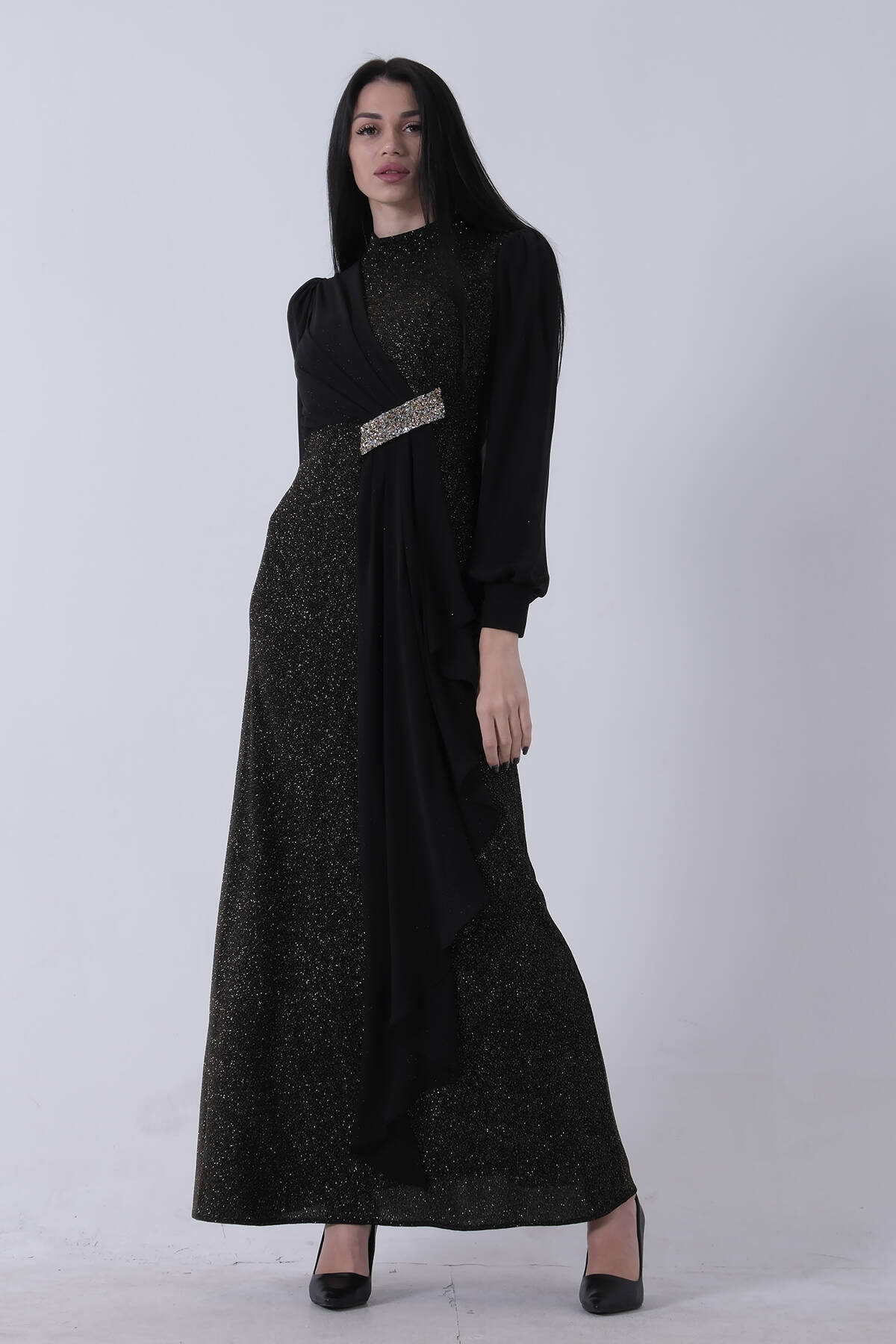 Siyah Bilek Ucu Saten Kurdele Pullu Tesettür Abiye 6502471.01