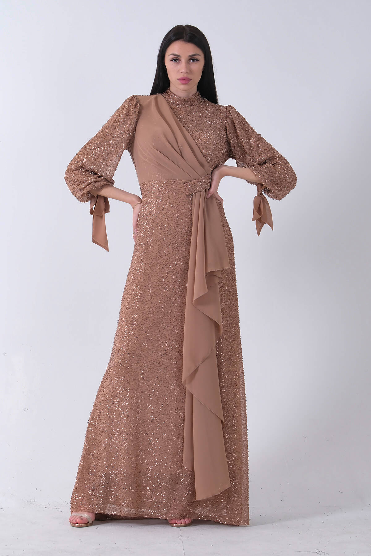 Gold Üzeri Pul Boncuk İşlemeli Tesettür Abiye 6502450.122