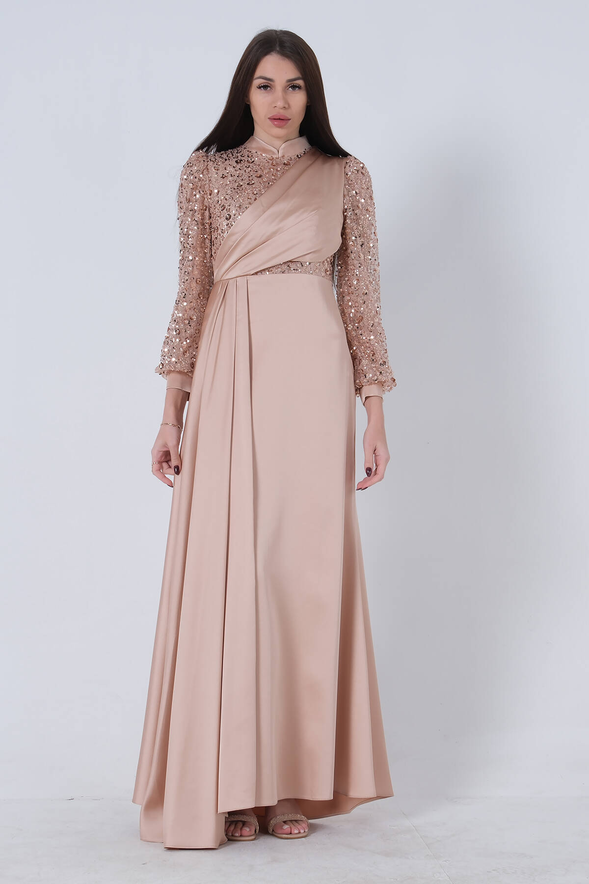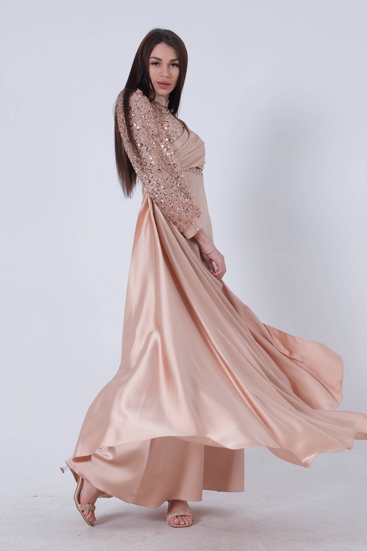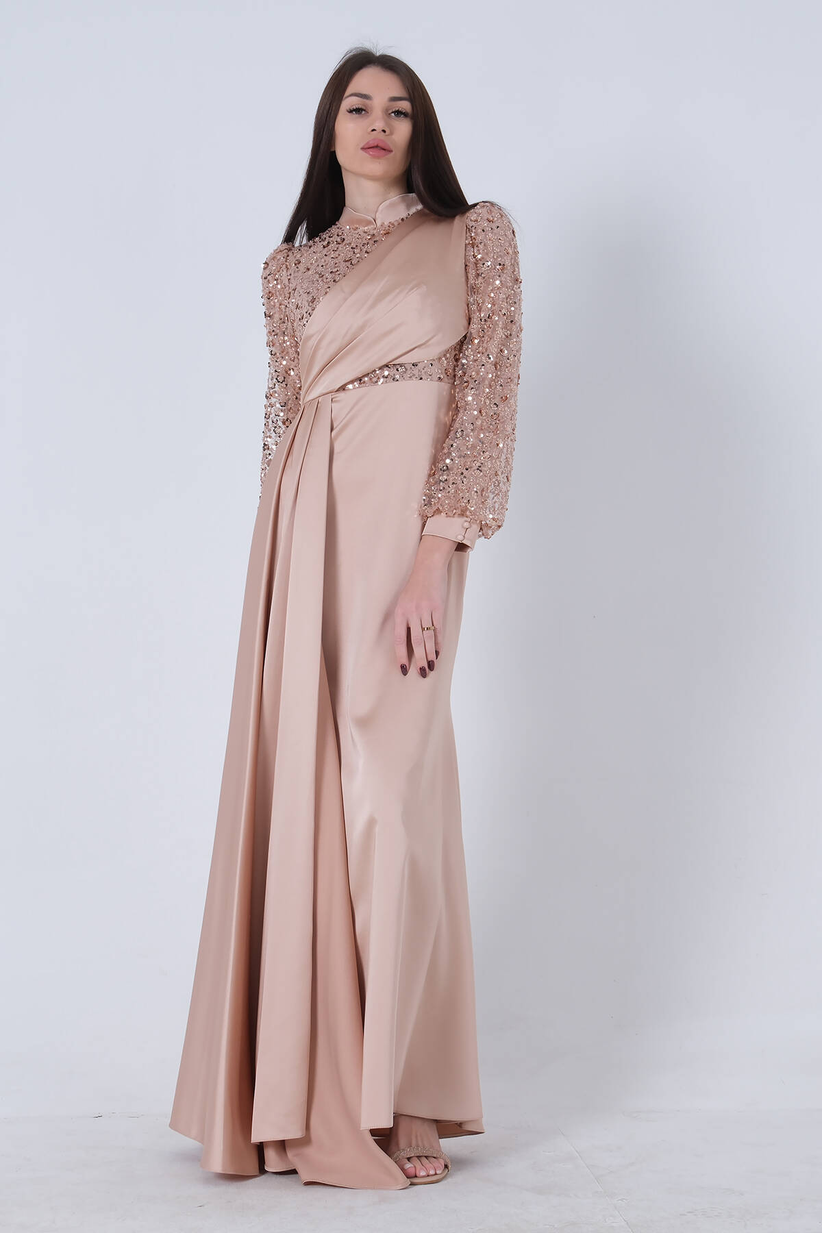 Gold Drapeli Payet Üst Detaylı Eteği Saten Tesettür Abiye 6502504.122