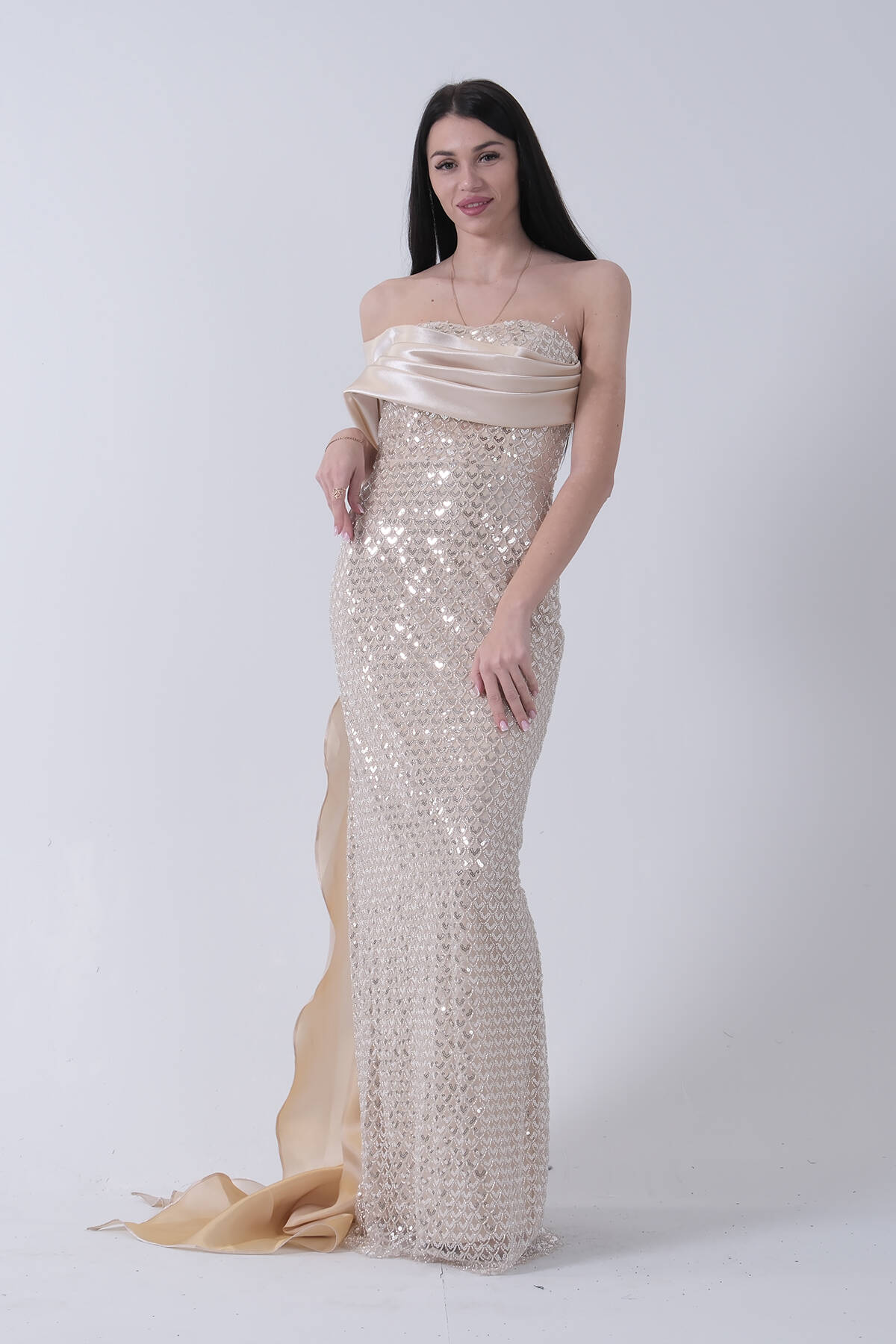 Pudra Önü Taş Detaylı Yırtmaçlı Pul Payet Straplez Abiye 0801163.79