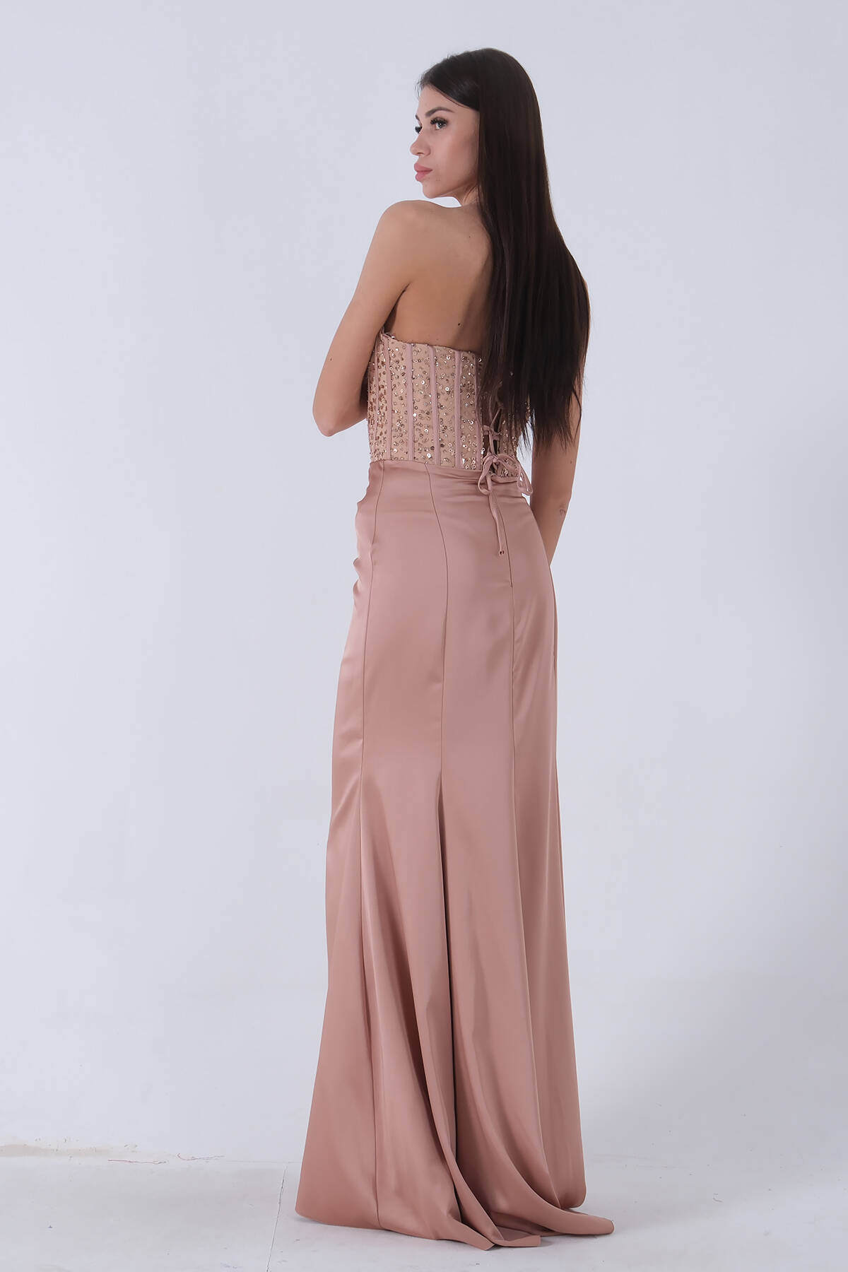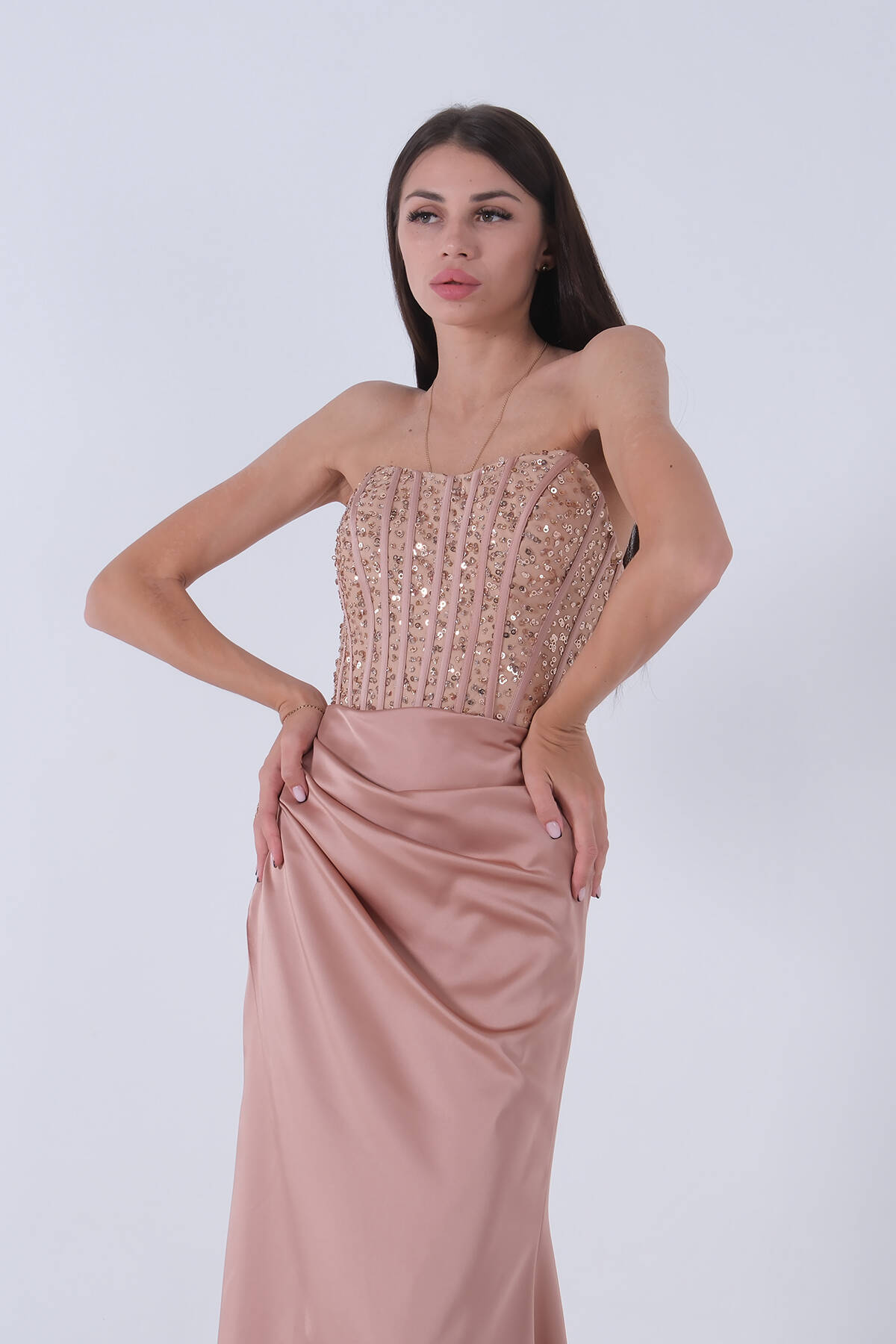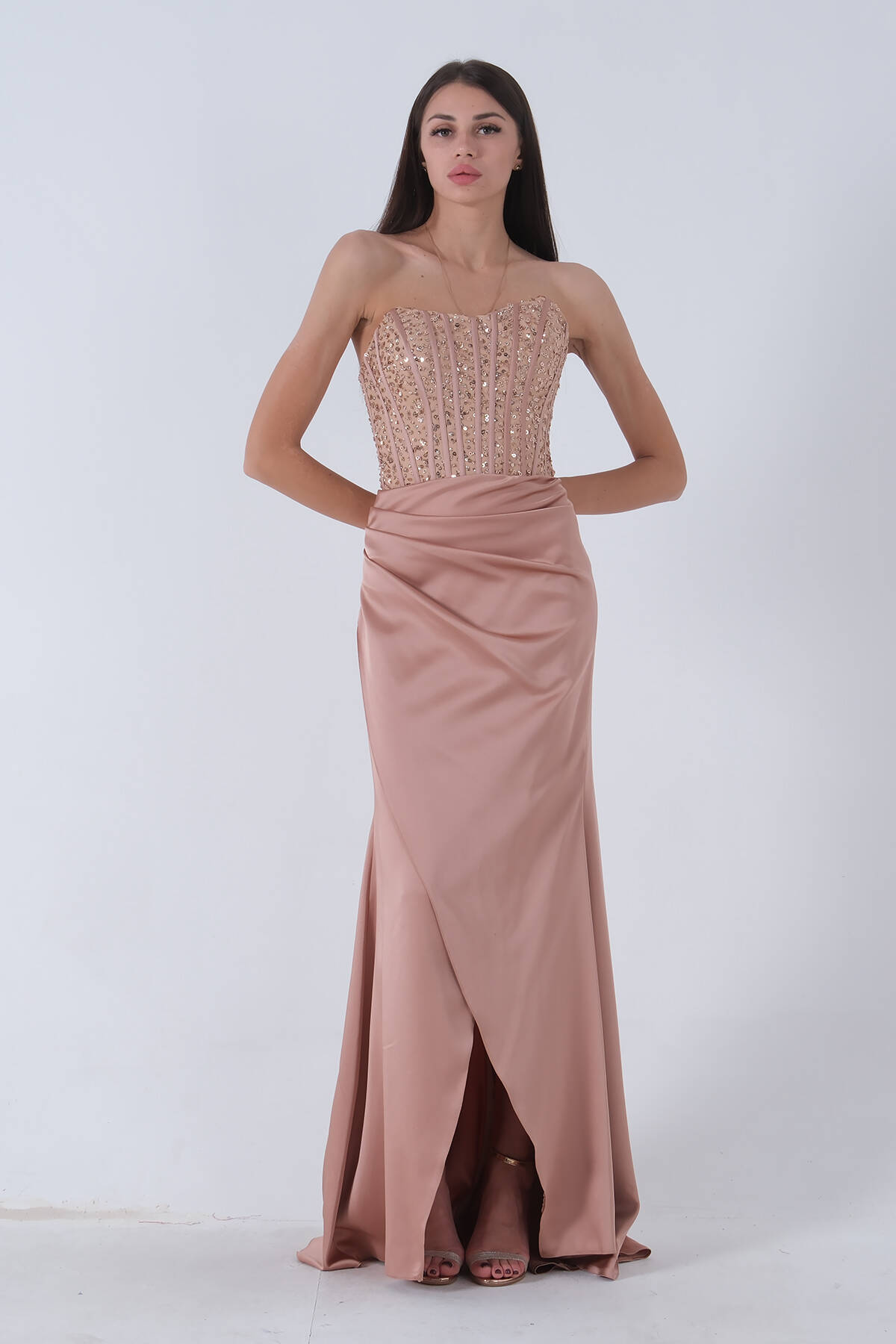 Gold Önü Taş Detaylı Yırtmaçlı Pul Payet Straplez Abiye 0801163.122