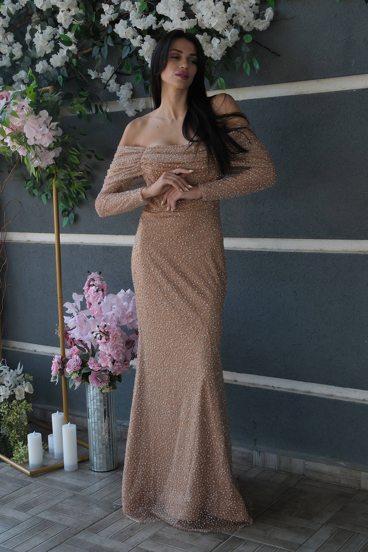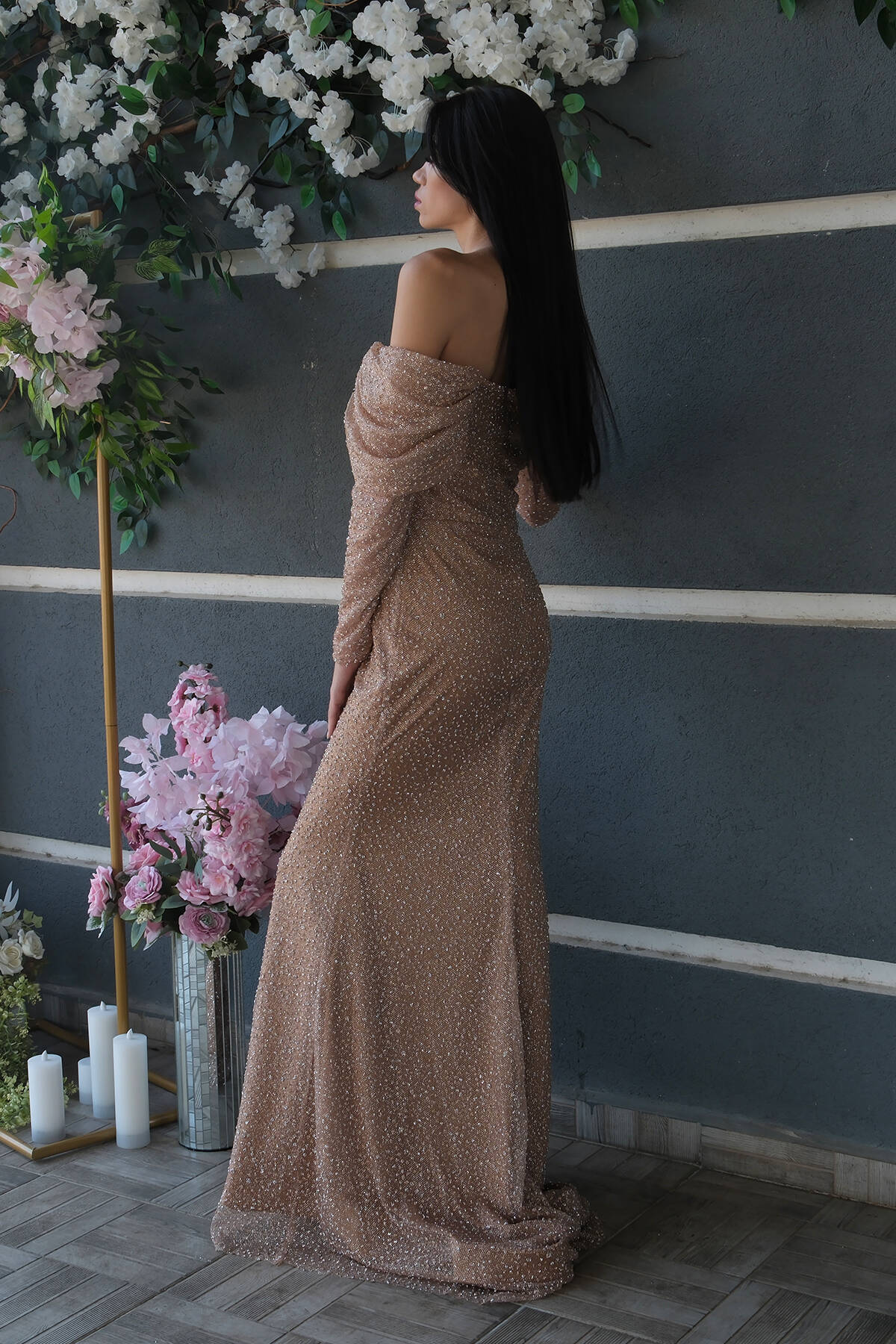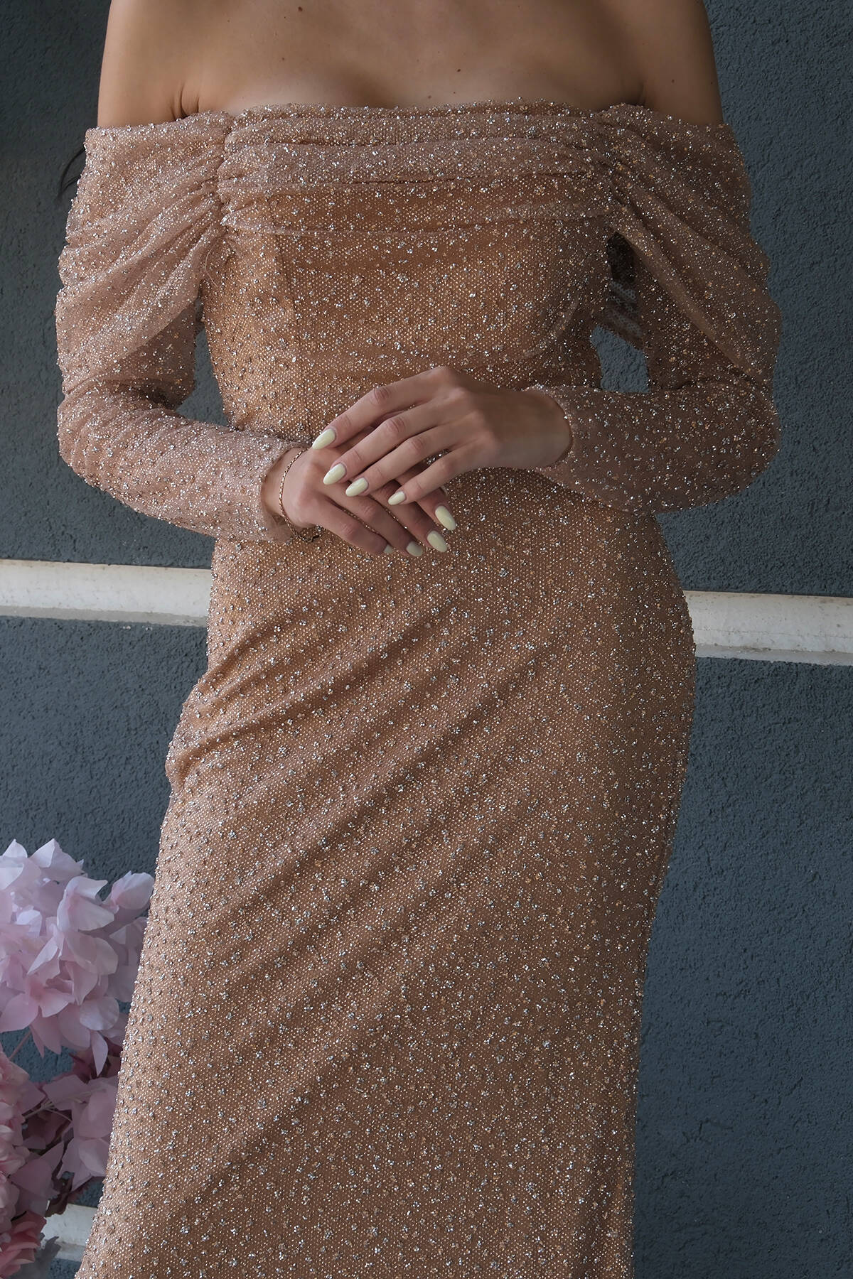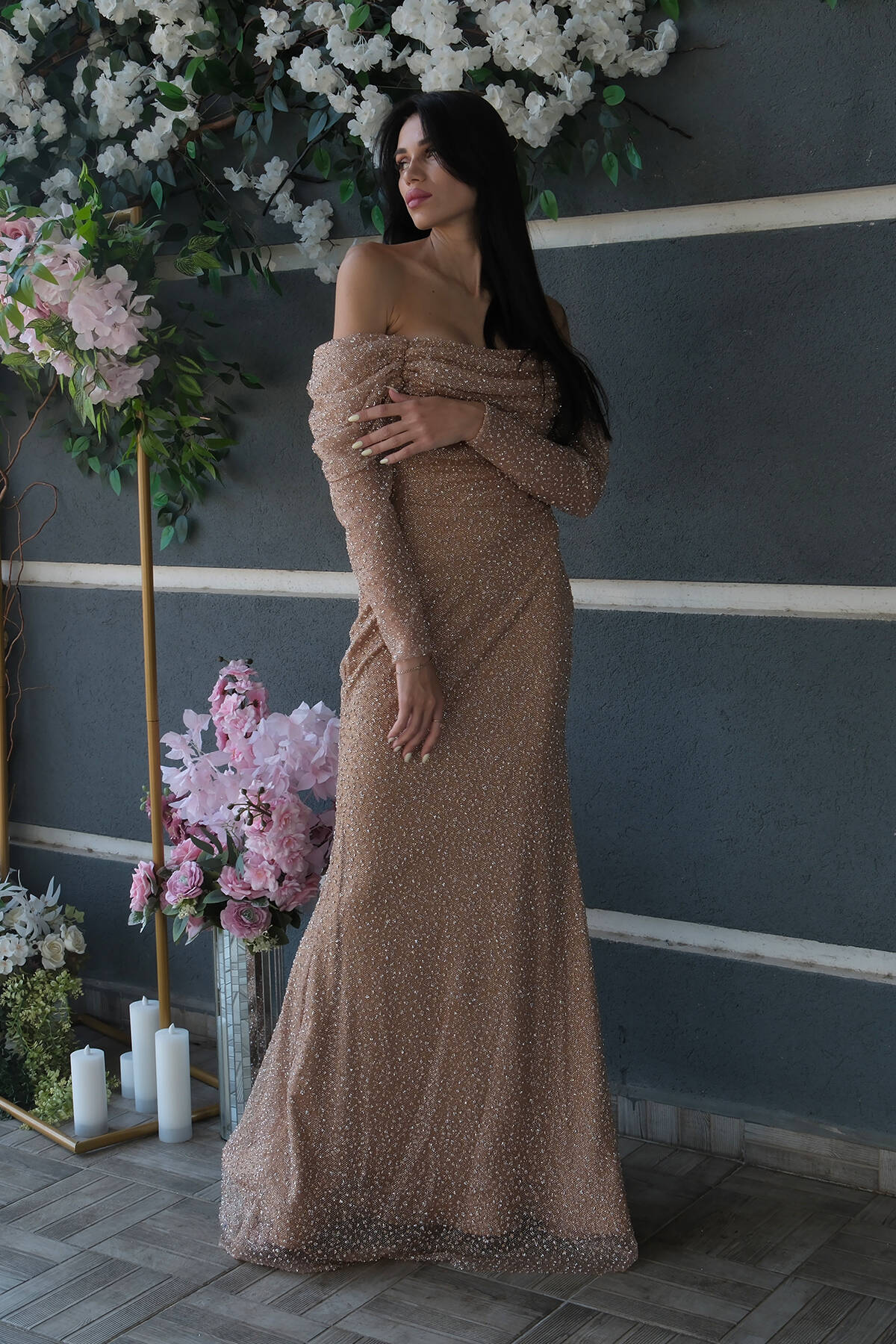 Gold Kayık Yaka Simli Uzun Kol Abiye 9705266.122