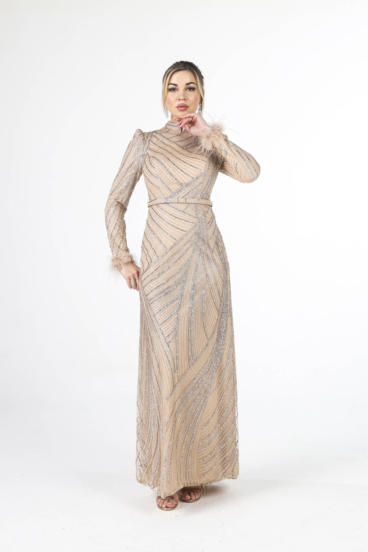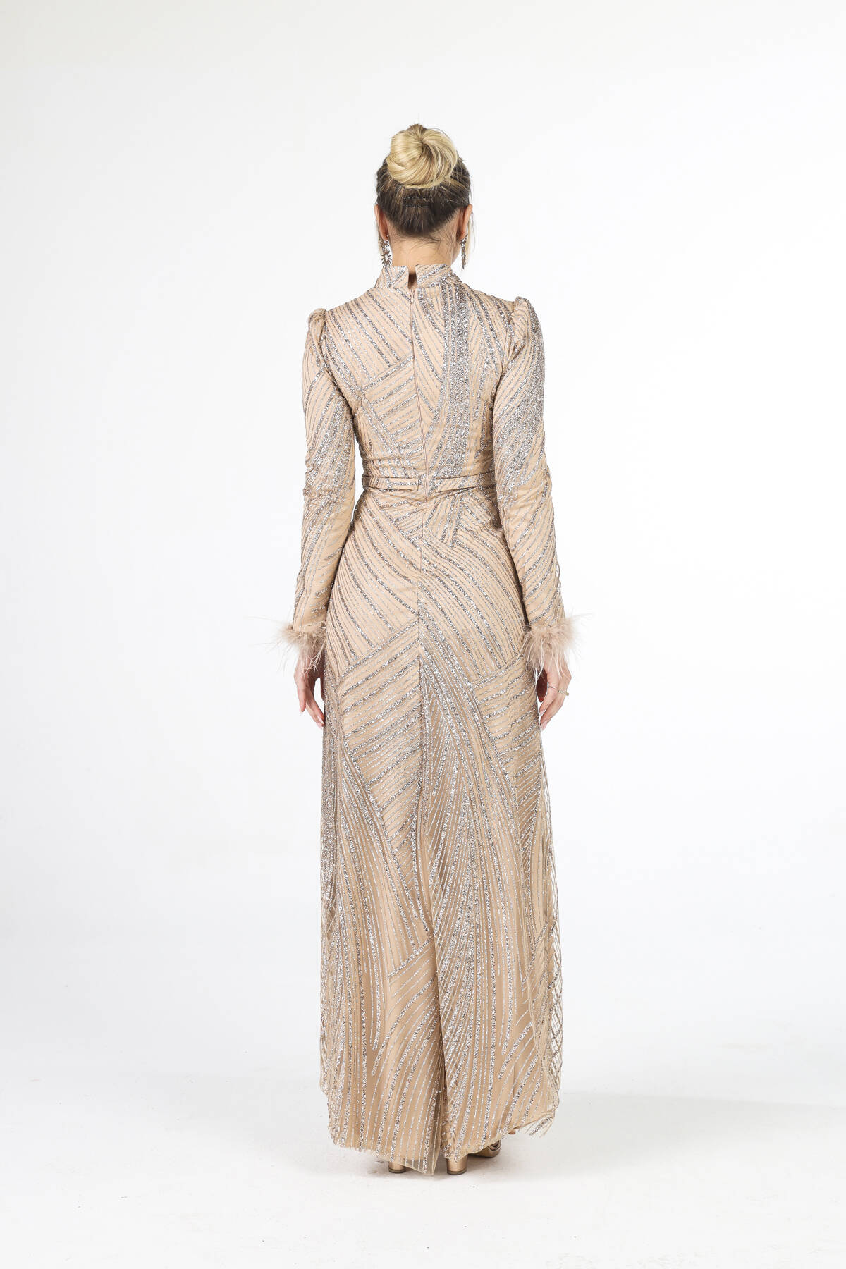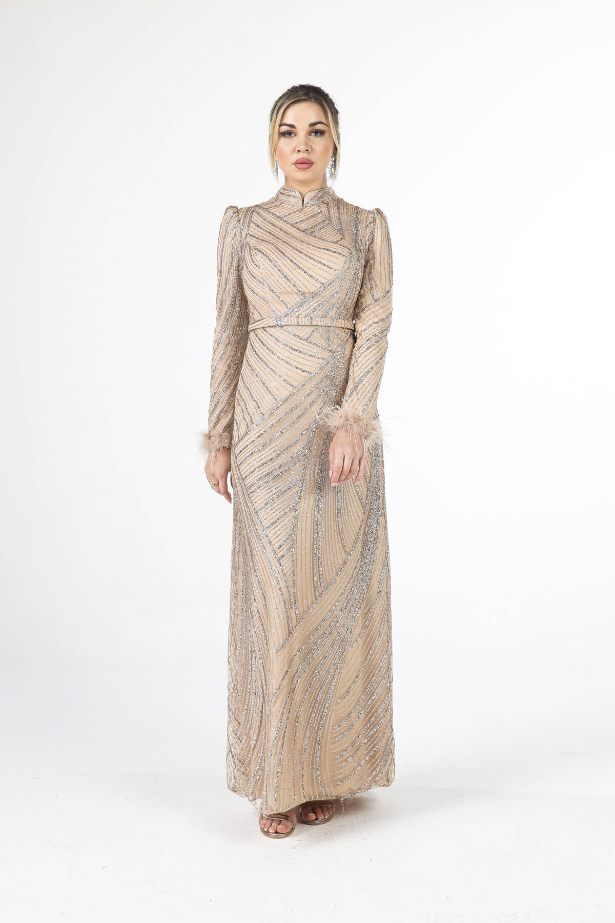 Modelin Ölçüleri : Boy: 1.80 cm / Göğüs: 88 cm / Bel: 69 cm /Basen : 94 cm Mankenin Üzerindeki Ürün 38/M Bedendir %100 Polyester Uzun Hakim Yaka Balon Kol Kol Uçları Tüylü Simli Abiye Ürün Boyu : 158 cm Stüdyo Çekimlerinde Renkler Işık Farklılıgından Dolayı Değişiklik Gösterebilir (Dikkat! Ürünlerimiz güvenlik bandı ile gönderilmektedir . Güvenlik bandı olmayan ürünlerin iadesi kabul edilmeyecektir)