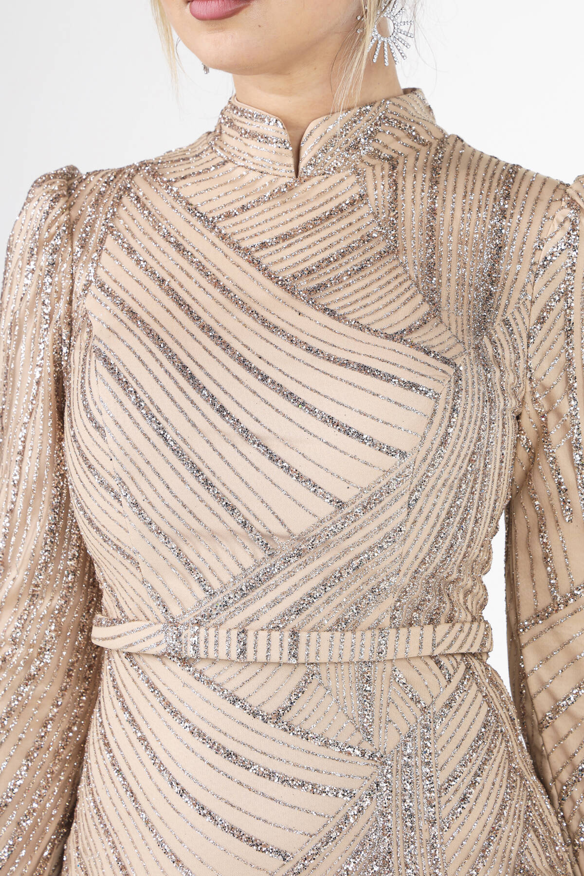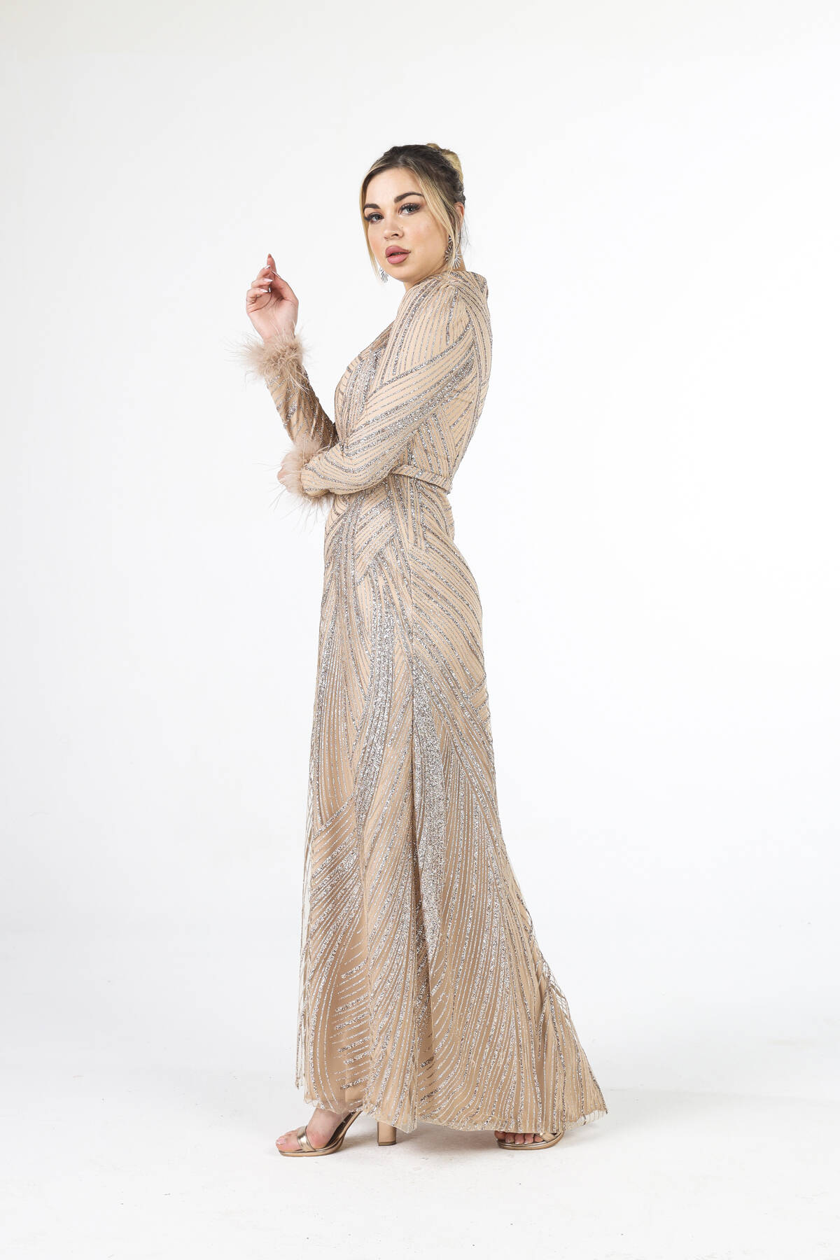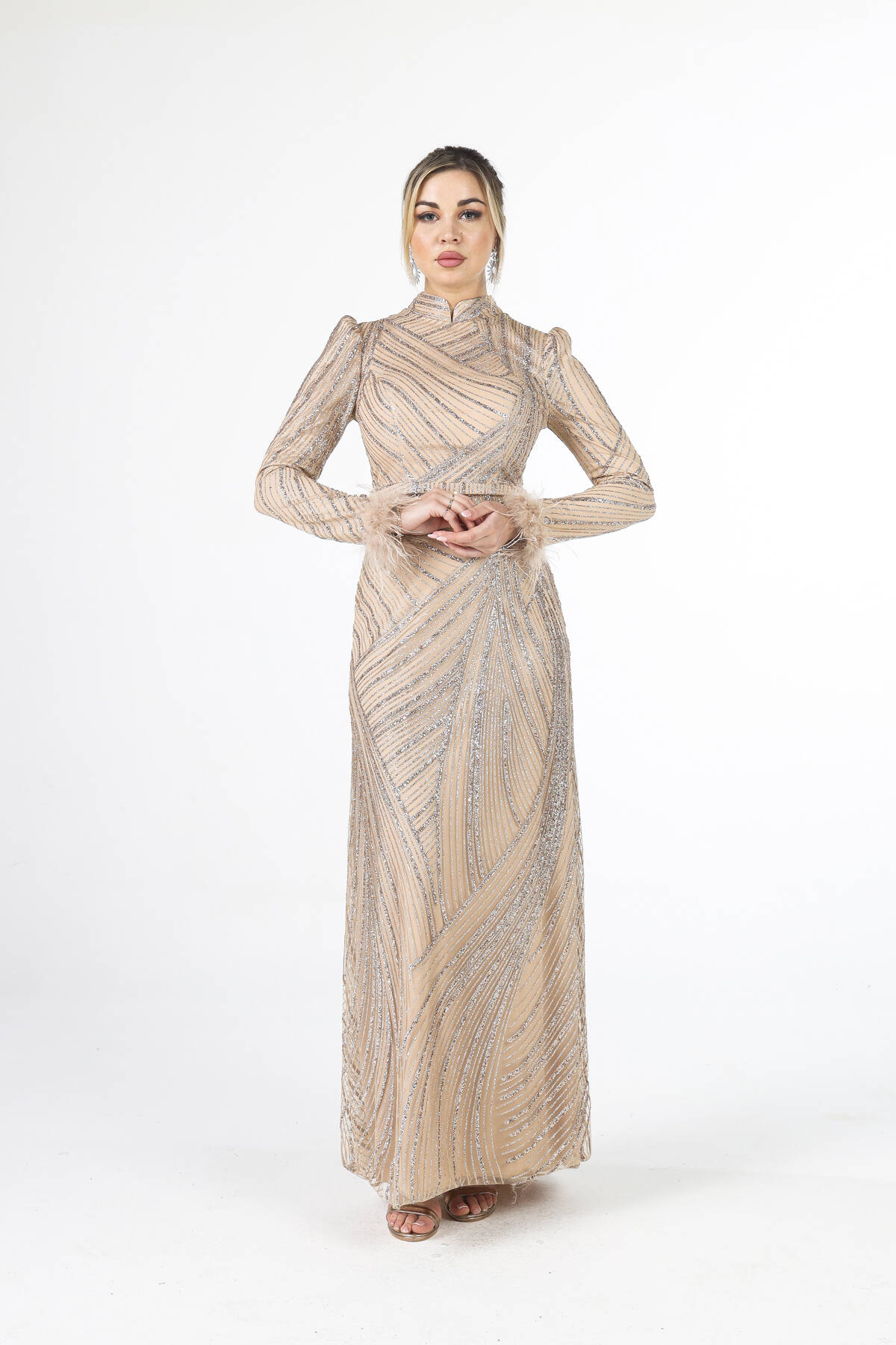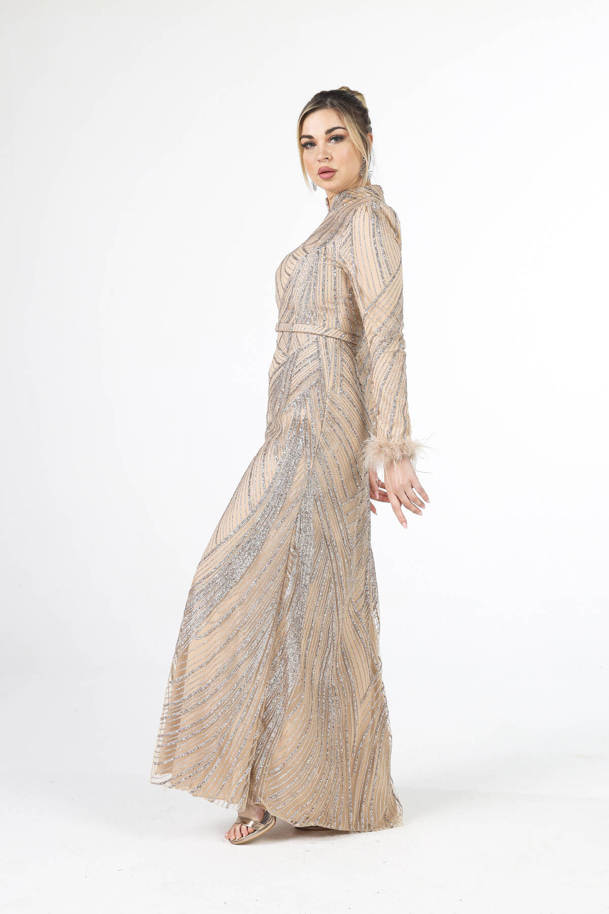 Modelin Ölçüleri : Boy: 1.80 cm / Göğüs: 88 cm / Bel: 69 cm /Basen : 94 cm Mankenin Üzerindeki Ürün 38/M Bedendir %100 Polyester Uzun Hakim Yaka Balon Kol Kol Uçları Tüylü Simli Abiye Ürün Boyu : 158 cm Stüdyo Çekimlerinde Renkler Işık Farklılıgından Dolayı Değişiklik Gösterebilir (Dikkat! Ürünlerimiz güvenlik bandı ile gönderilmektedir . Güvenlik bandı olmayan ürünlerin iadesi kabul edilmeyecektir)