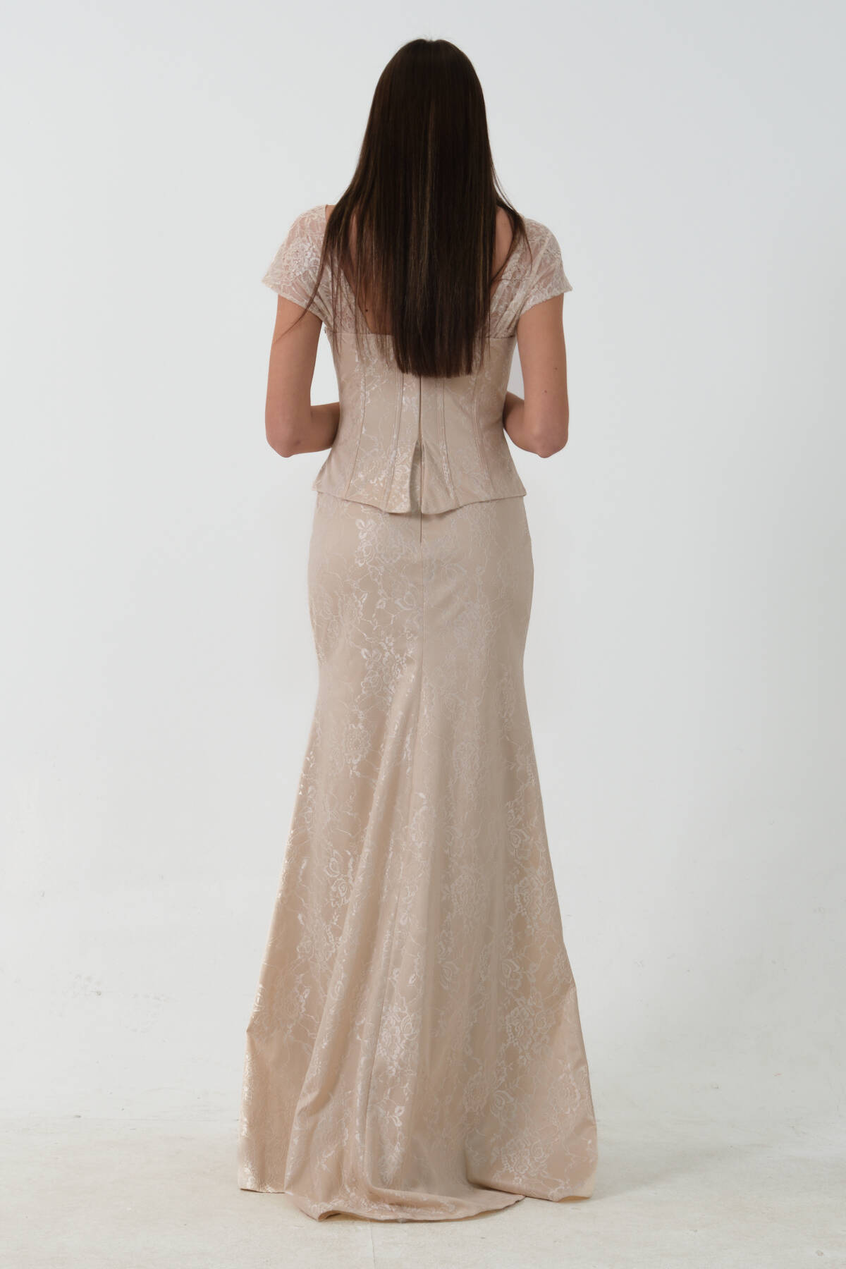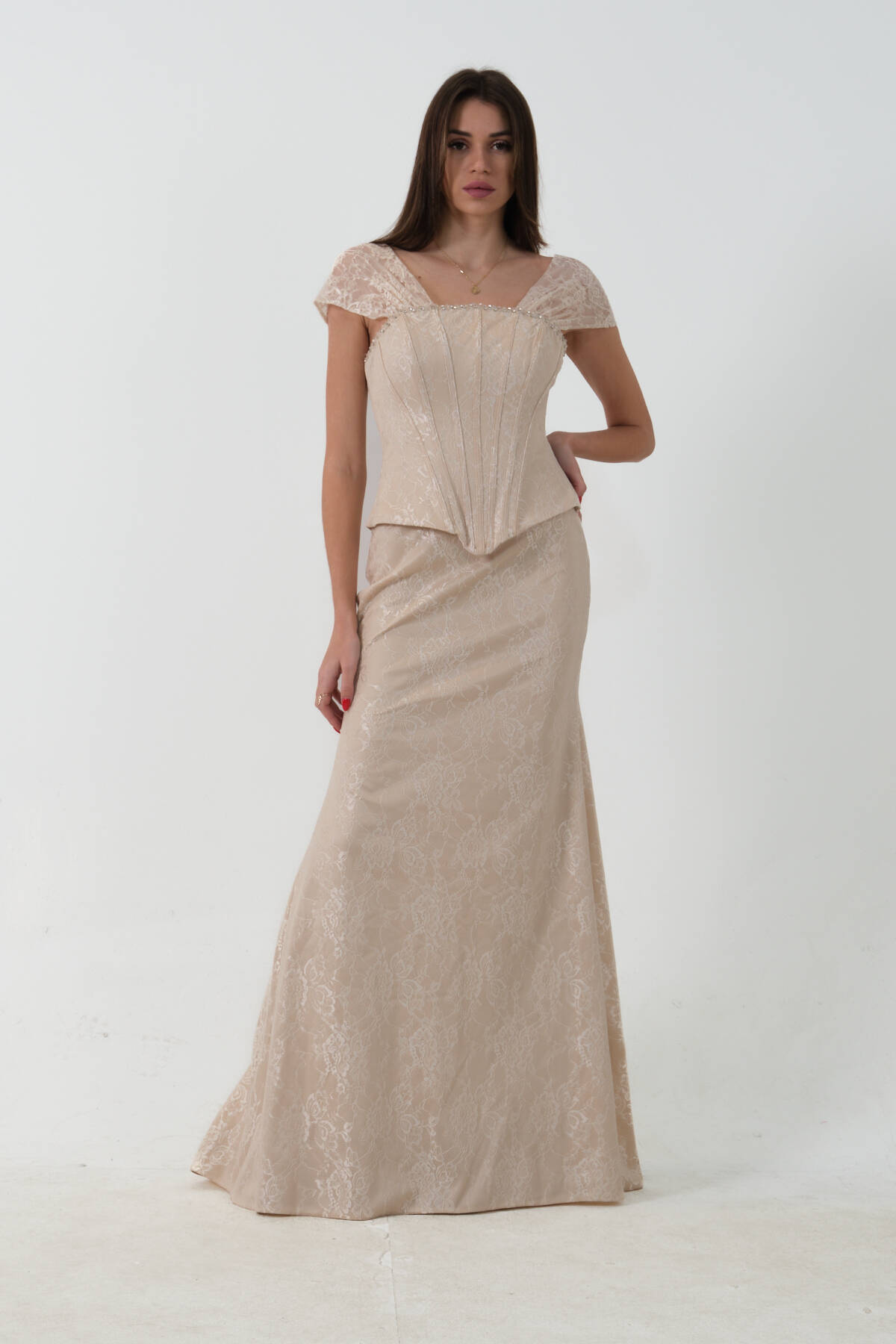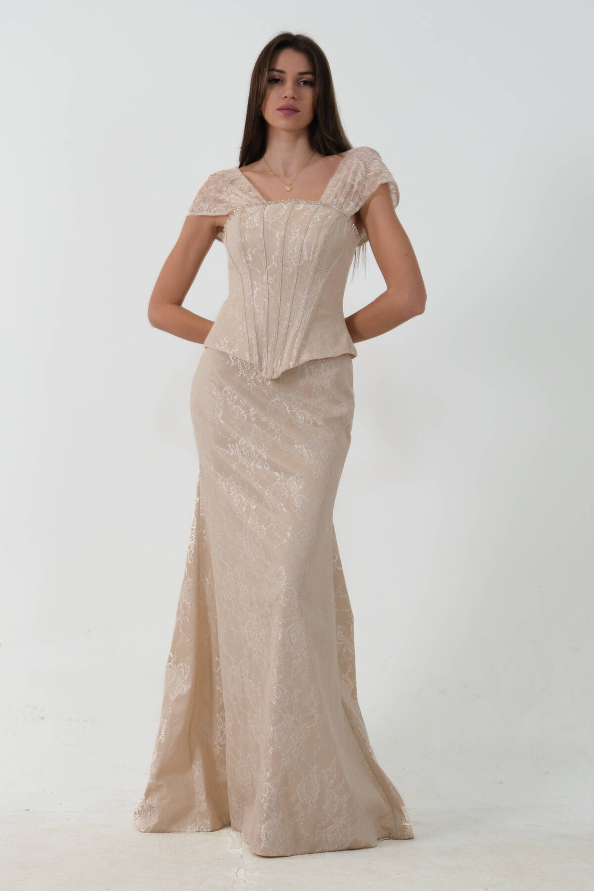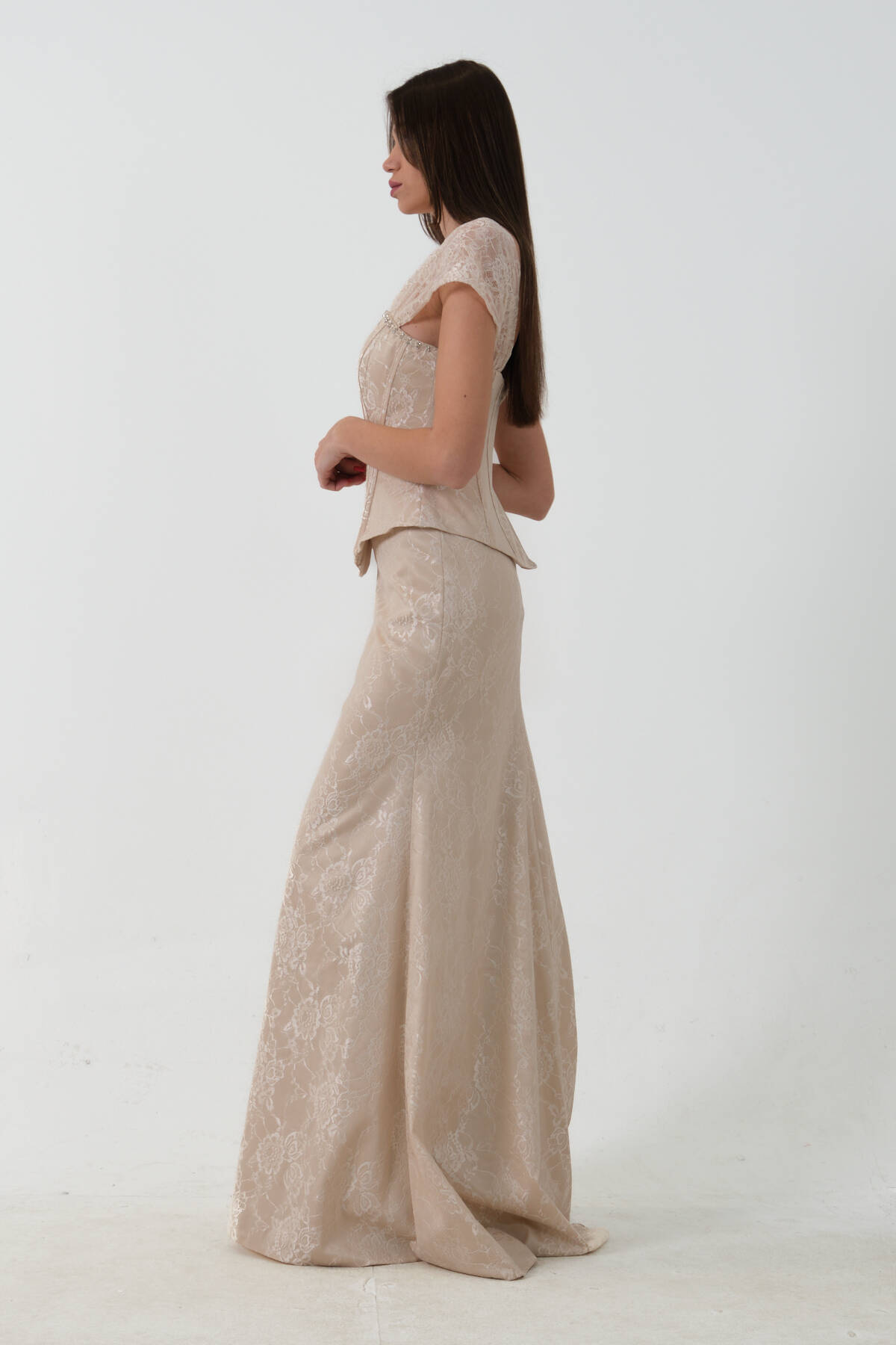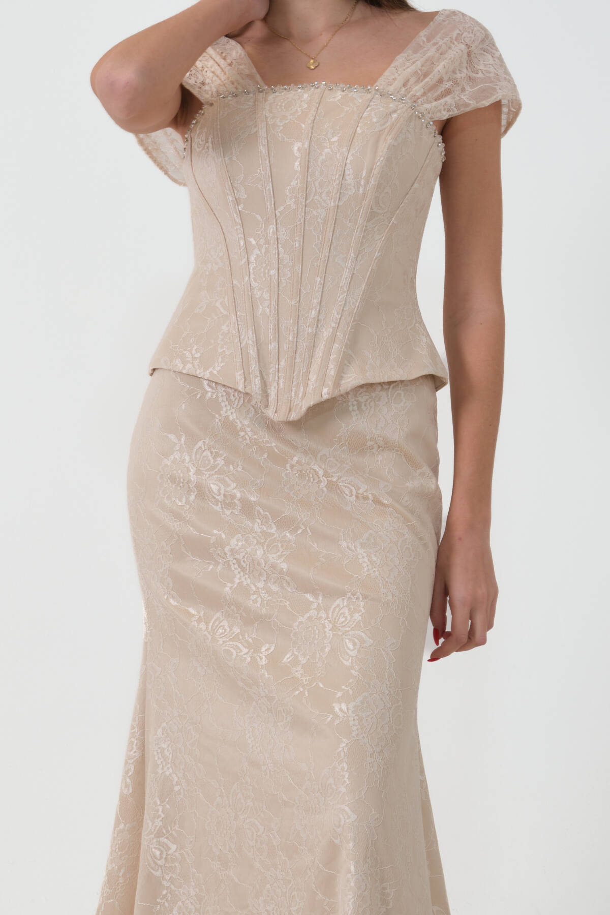 Gold Korse Detaylı Dantel Kapamalı Düşük Omuz Abiye 9705791.122