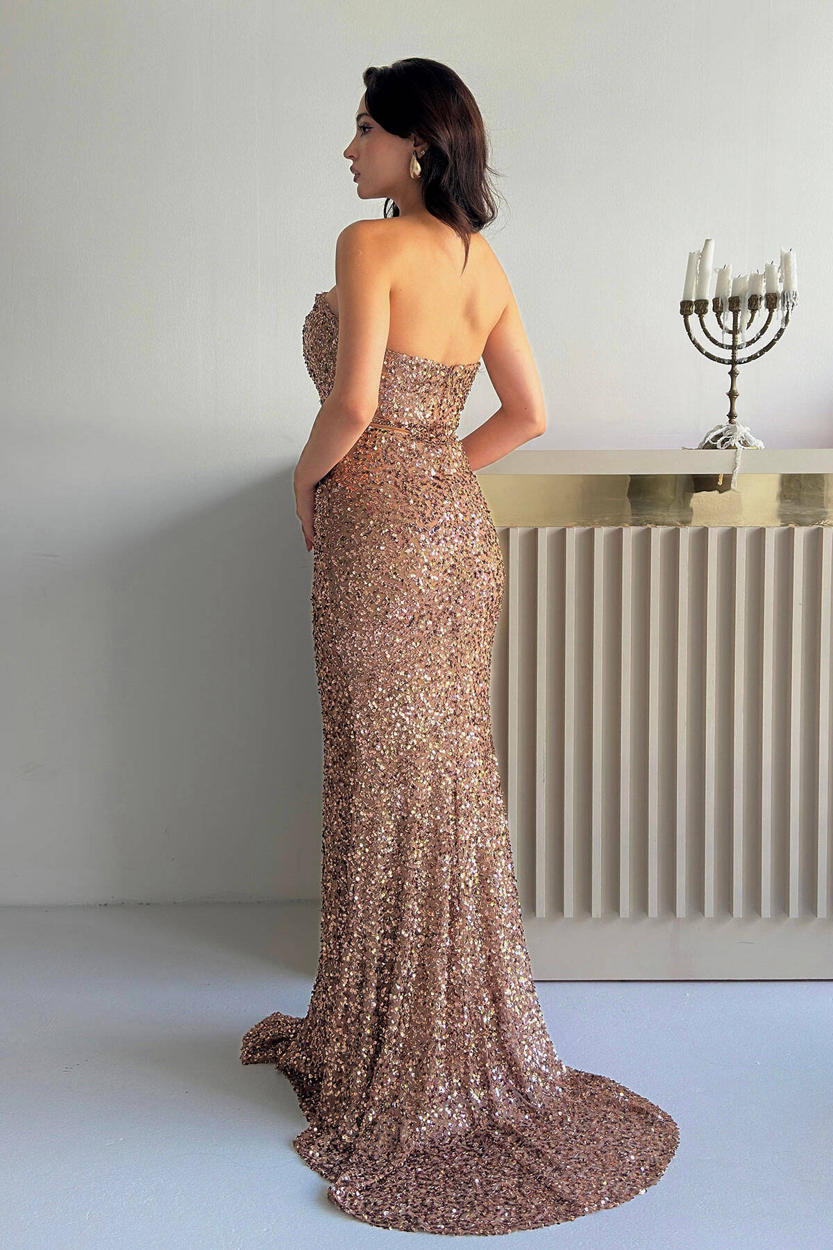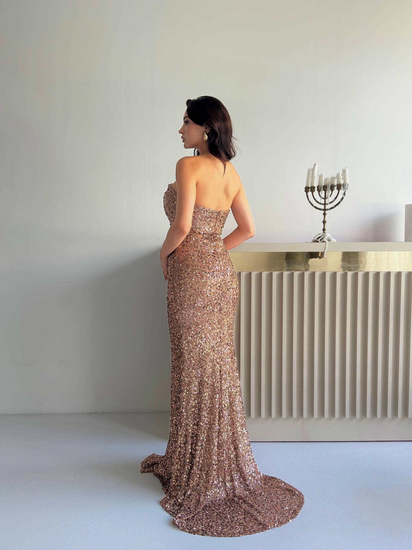 Gold Önü Taş Detaylı Yırtmaçlı Pul Payet Straplez Abiye 0801163.122