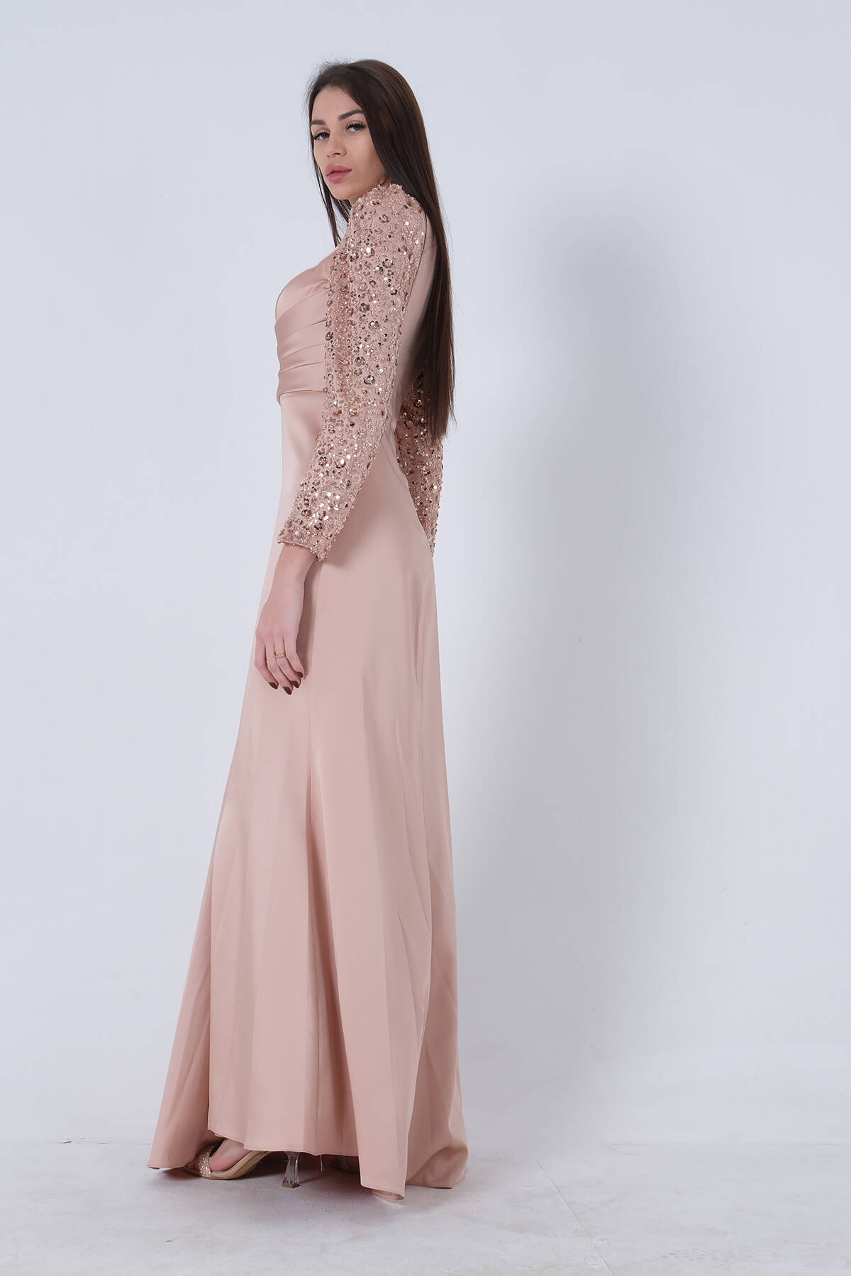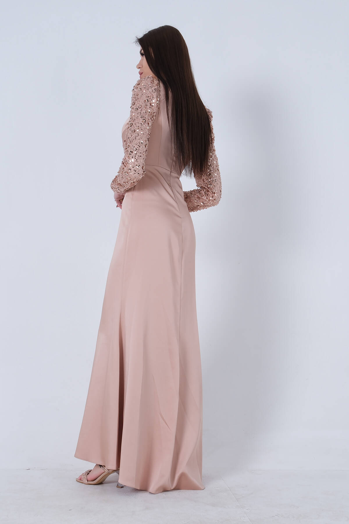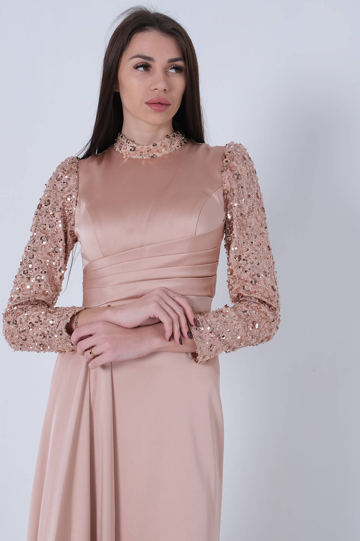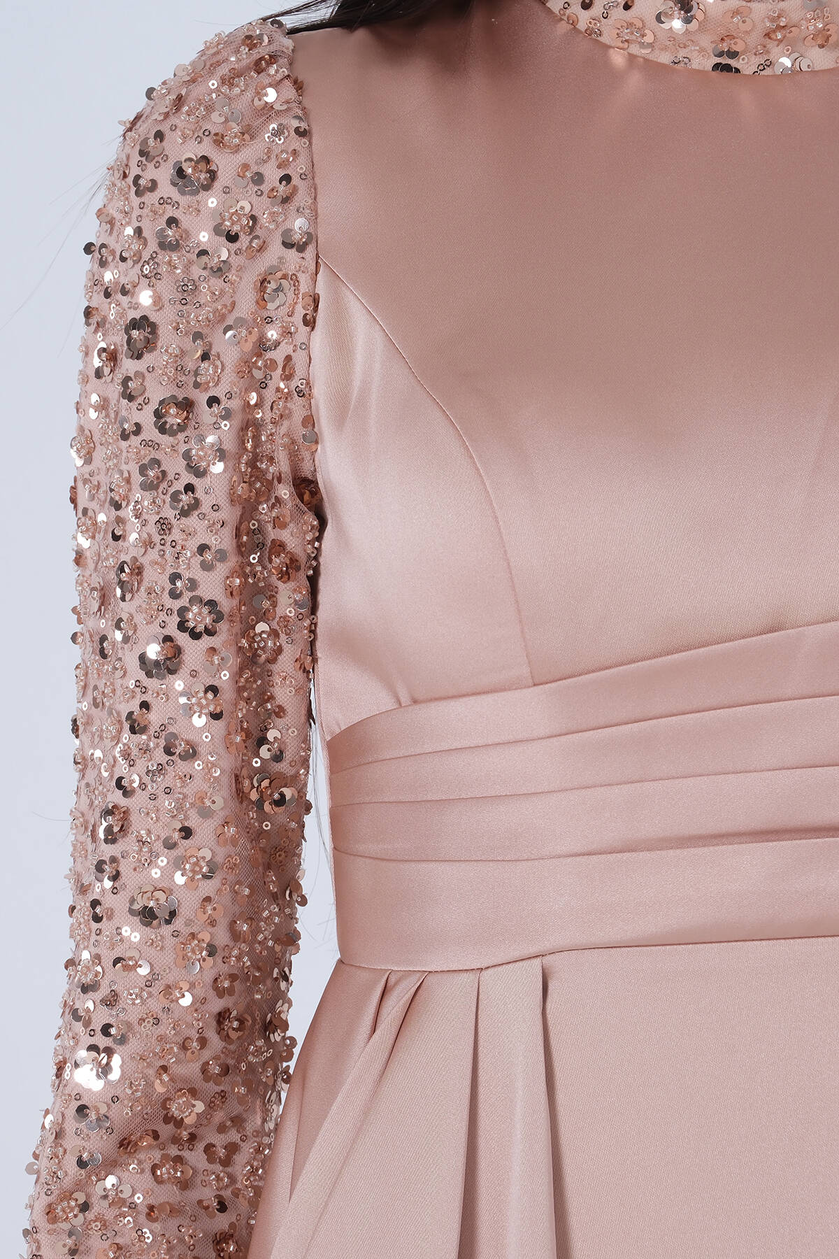 Gold Drapeli Payet Üst Detaylı Eteği Saten Tesettür Abiye 6502504.122