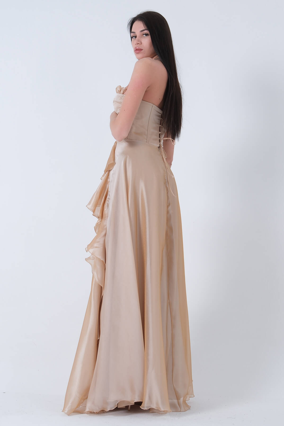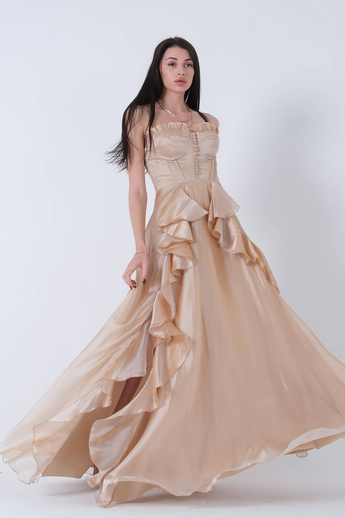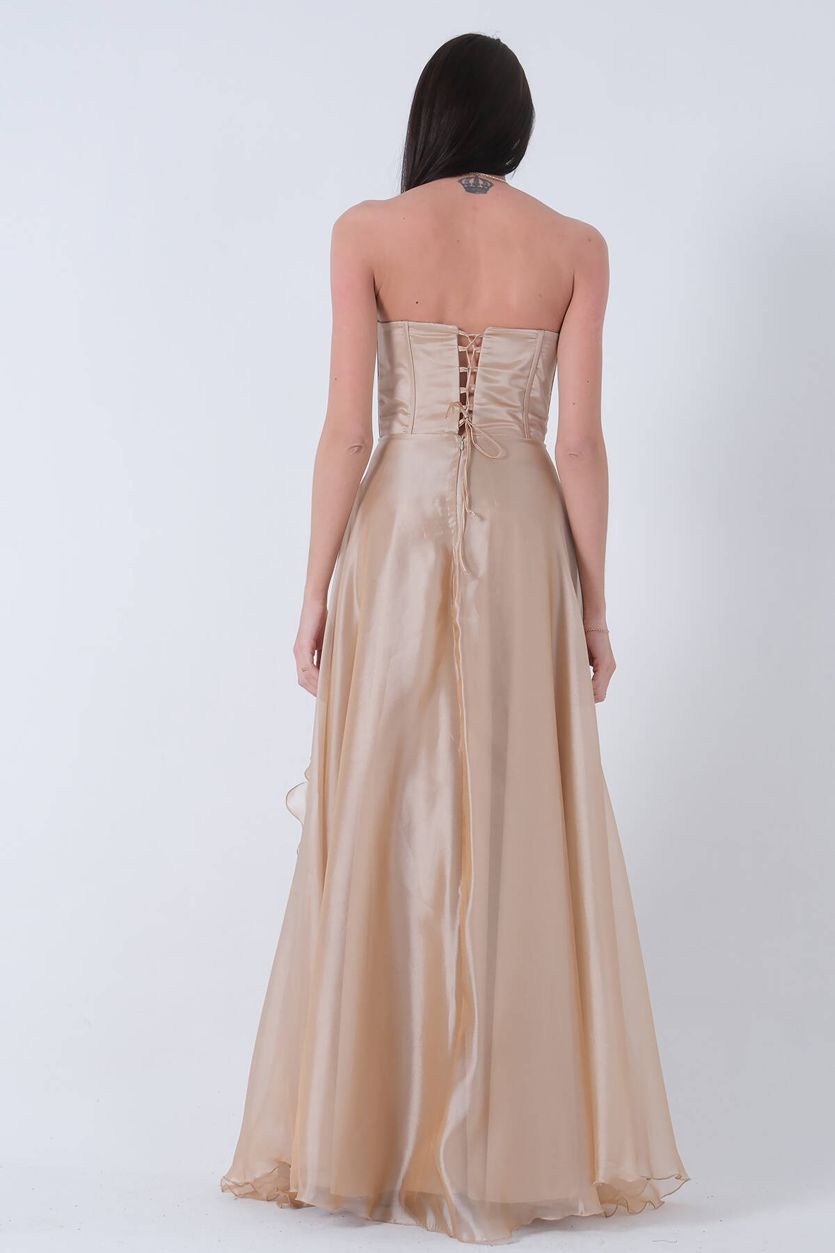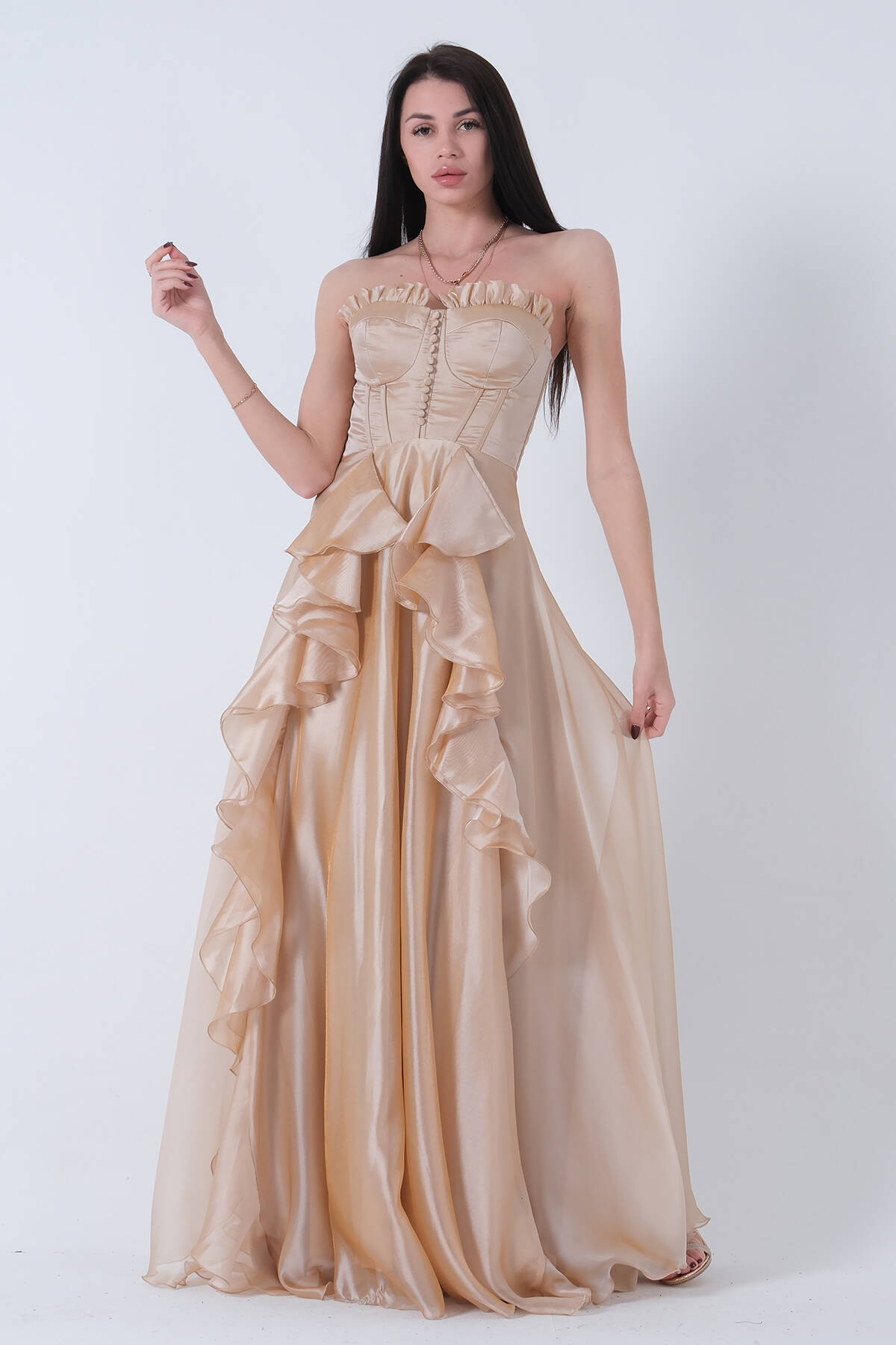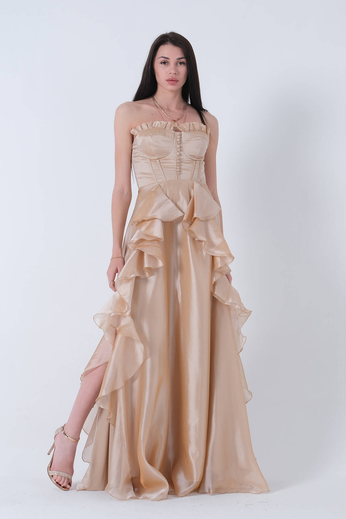 Gold Straplez Yaka Yırtmaçlı Eteği Fırfırlı Abiye 9705234.122