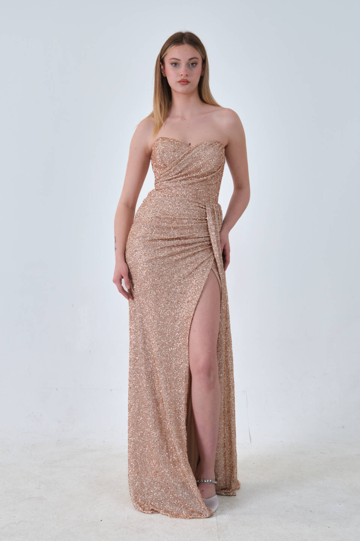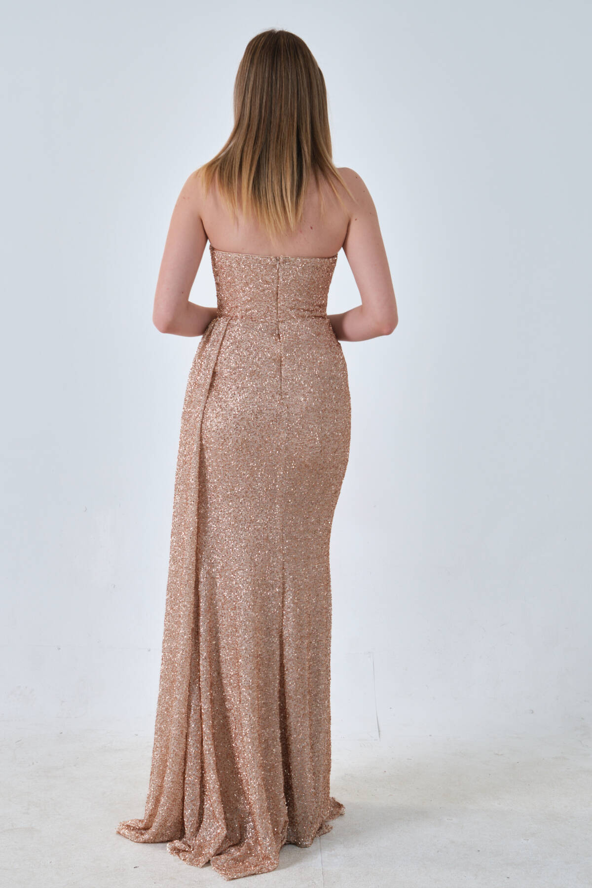 Gold Taş Boncuk İşlemeli Yırtmaçlı Straplez Abiye 9705300.122