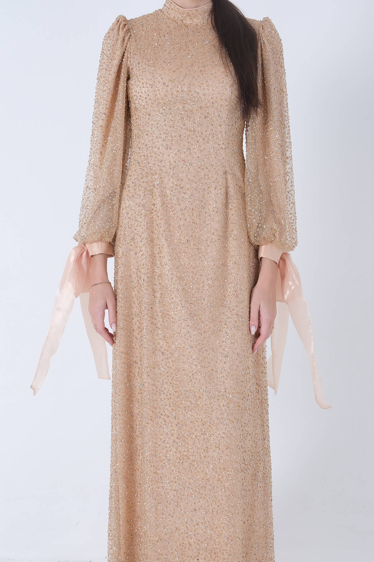 Gold Taş İşlemeli Hakim Yaka Fiyonklu Tesettür Abiye 6502462.122