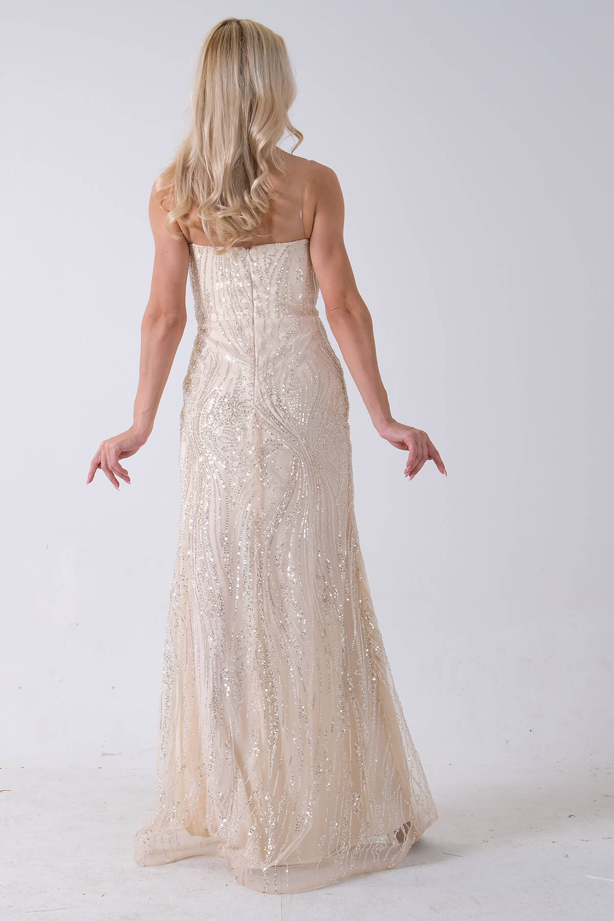 Gold Önü Taş Detaylı Yırtmaçlı Pul Payet Straplez Abiye 0801163.122