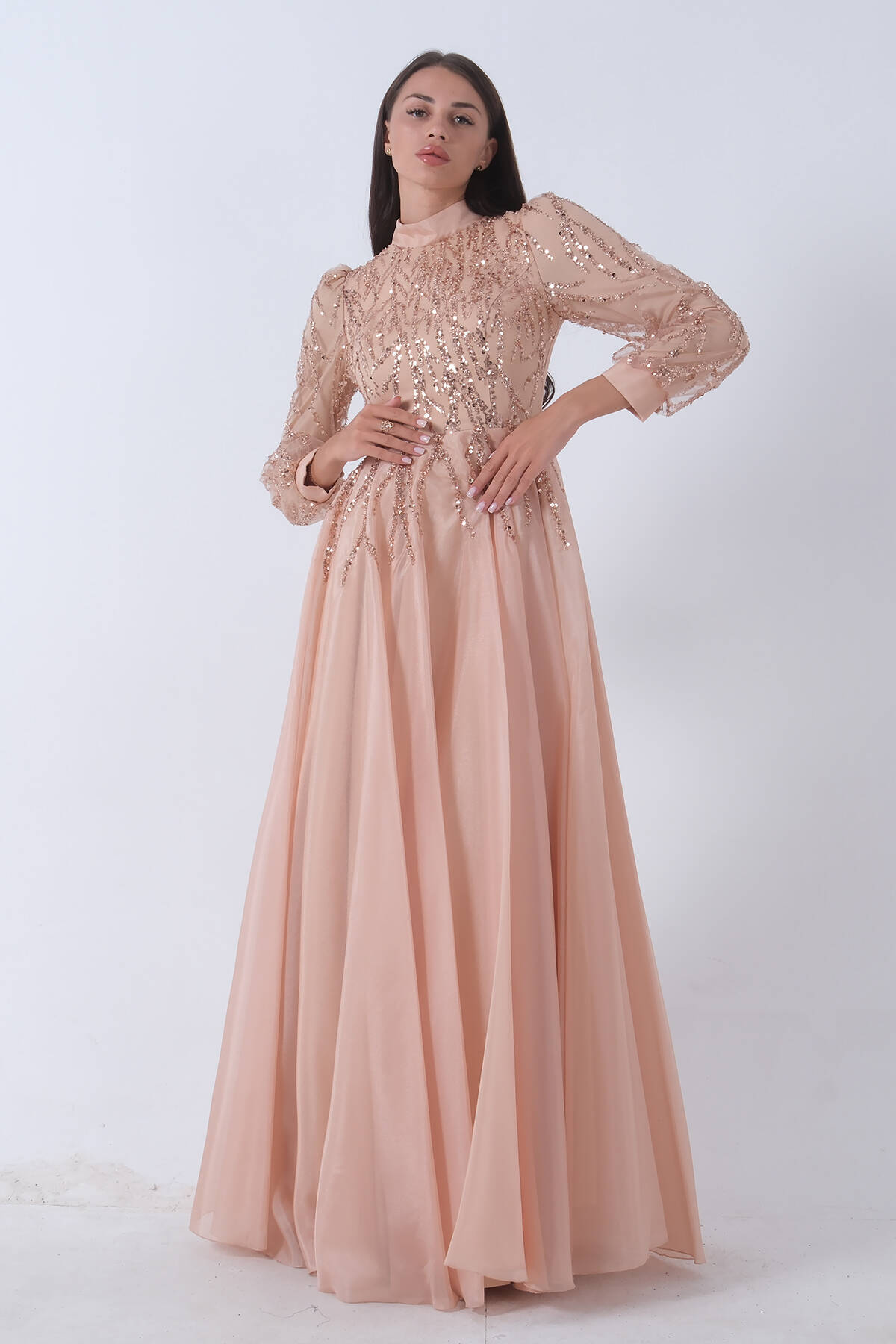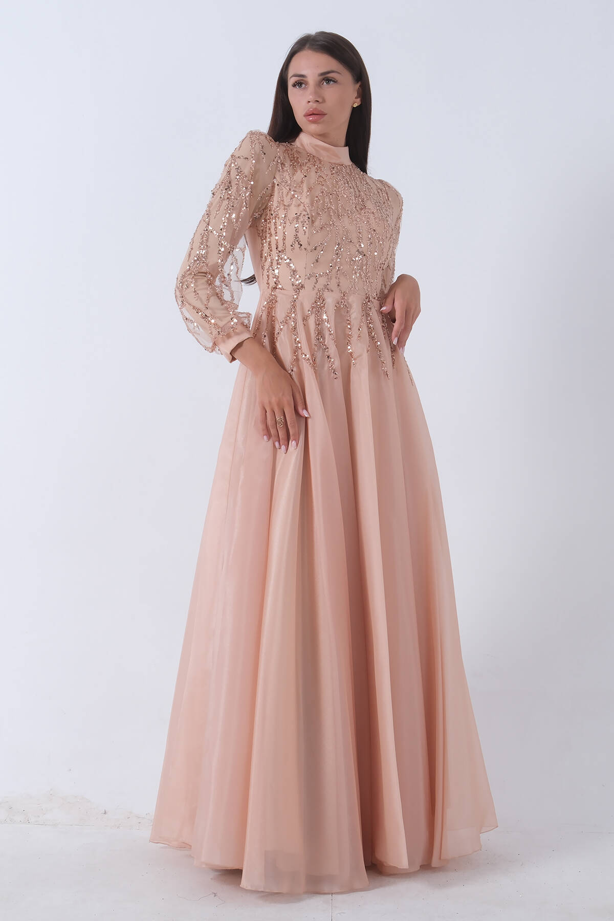 Gold Üzeri Pul Boncuk İşlemeli Tesettür Abiye 6502450.122