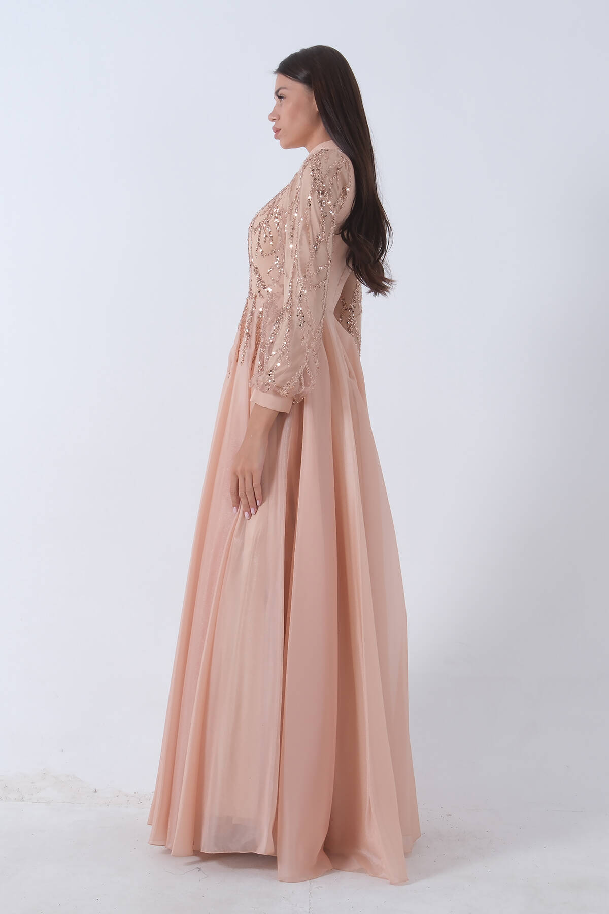 Gold Drapeli Payet Üst Detaylı Eteği Saten Tesettür Abiye 6502504.122