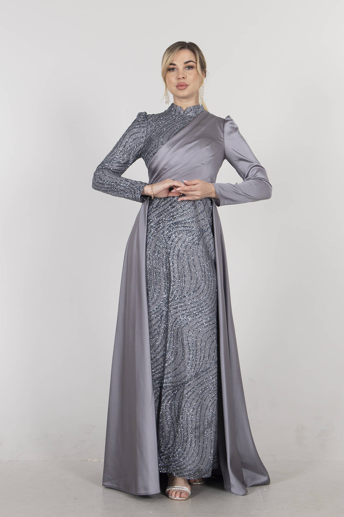 Uzun Kol Dik Yaka Saten Drape Ve Kuyruk Detaylı Simli Abiye Elbise