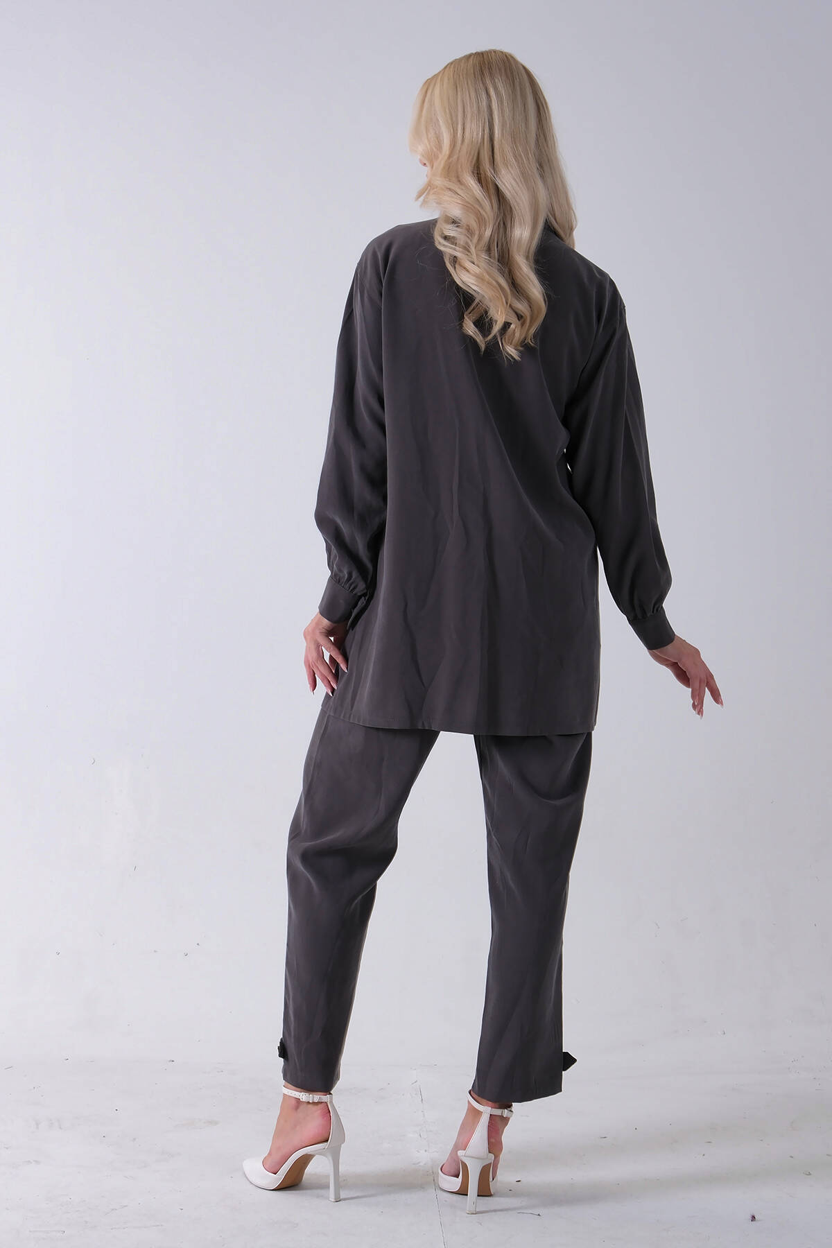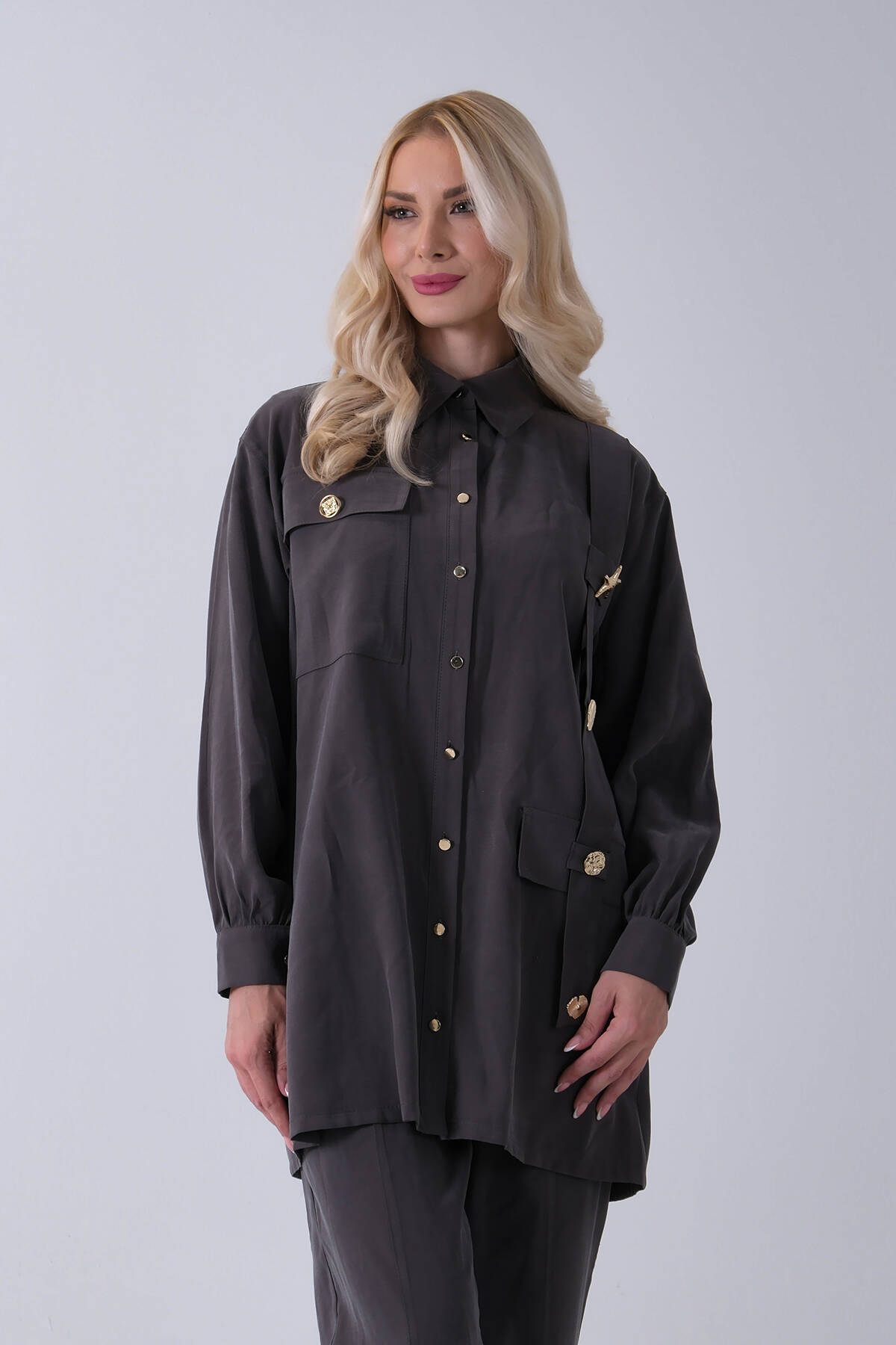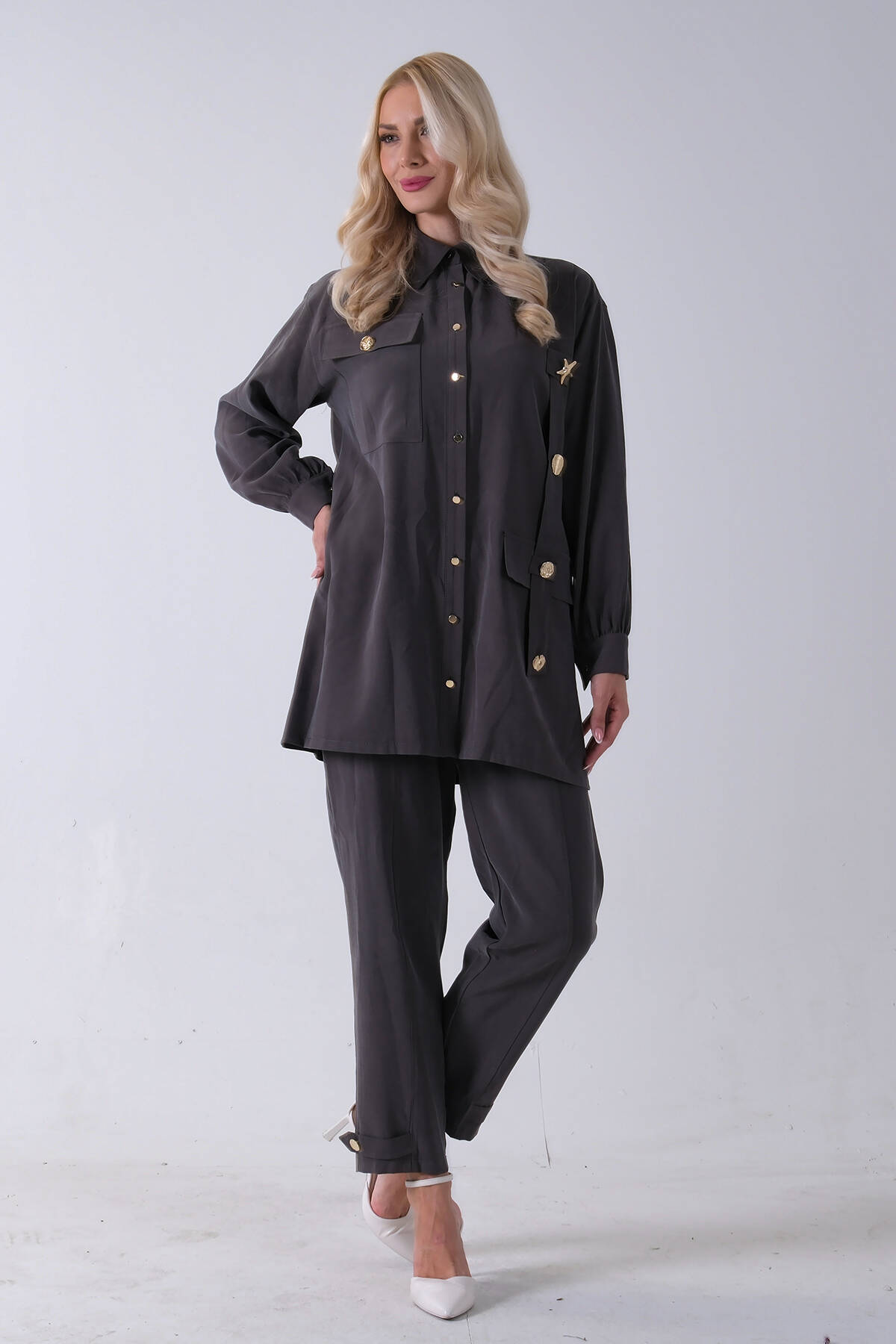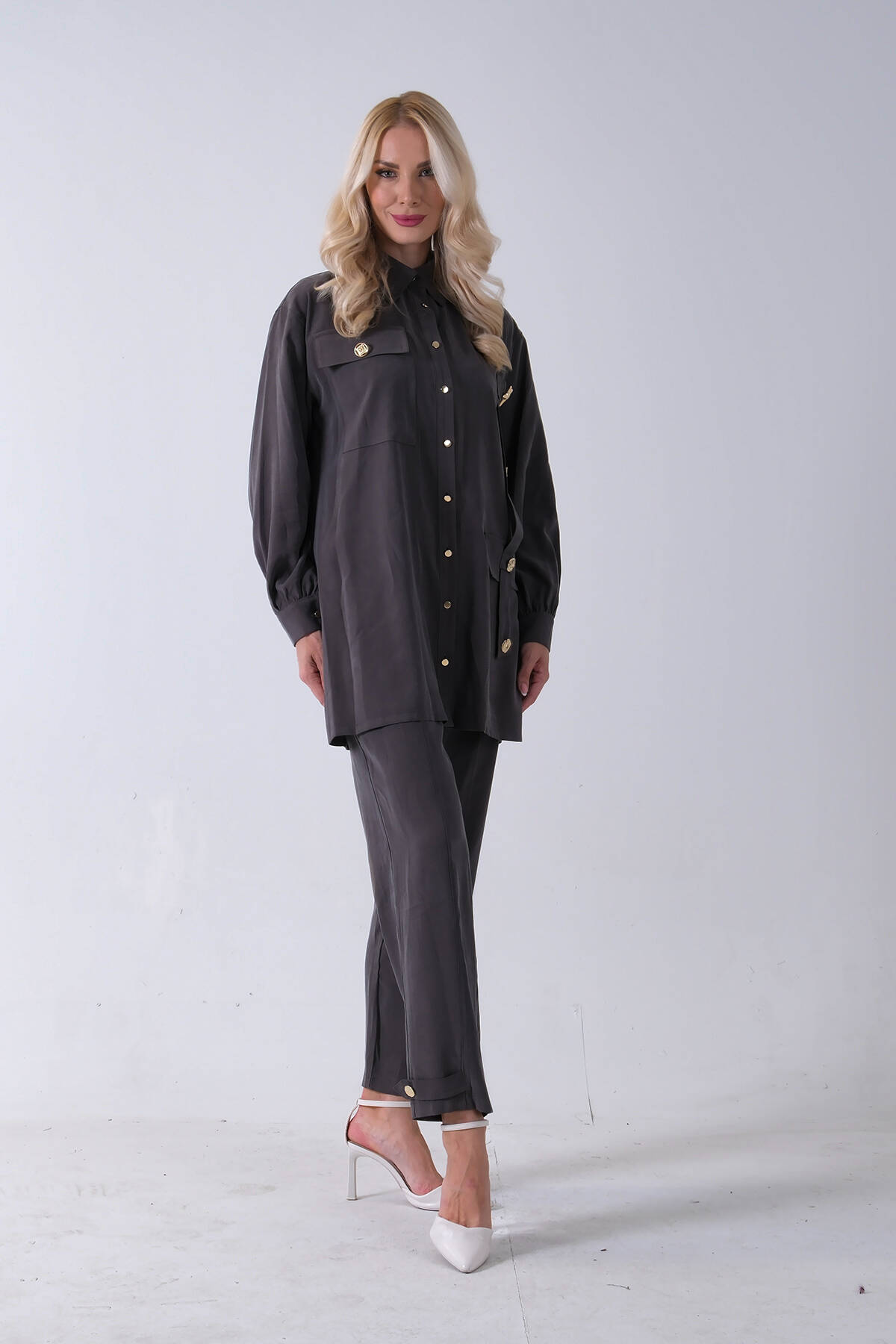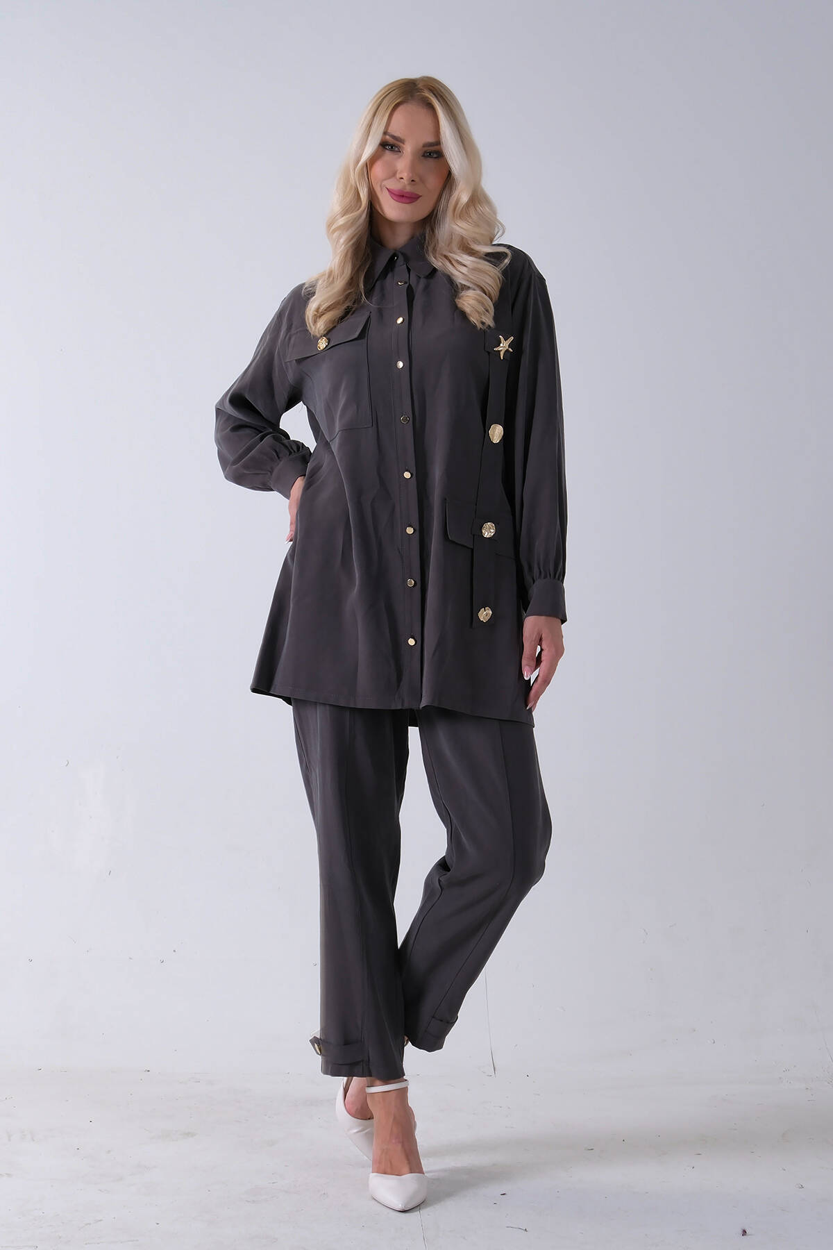 Gri Üzeri Desenli Yaka Deri Detaylı Fermuar Kapamalı Tunik Pantolonlu Takım 4703058.06