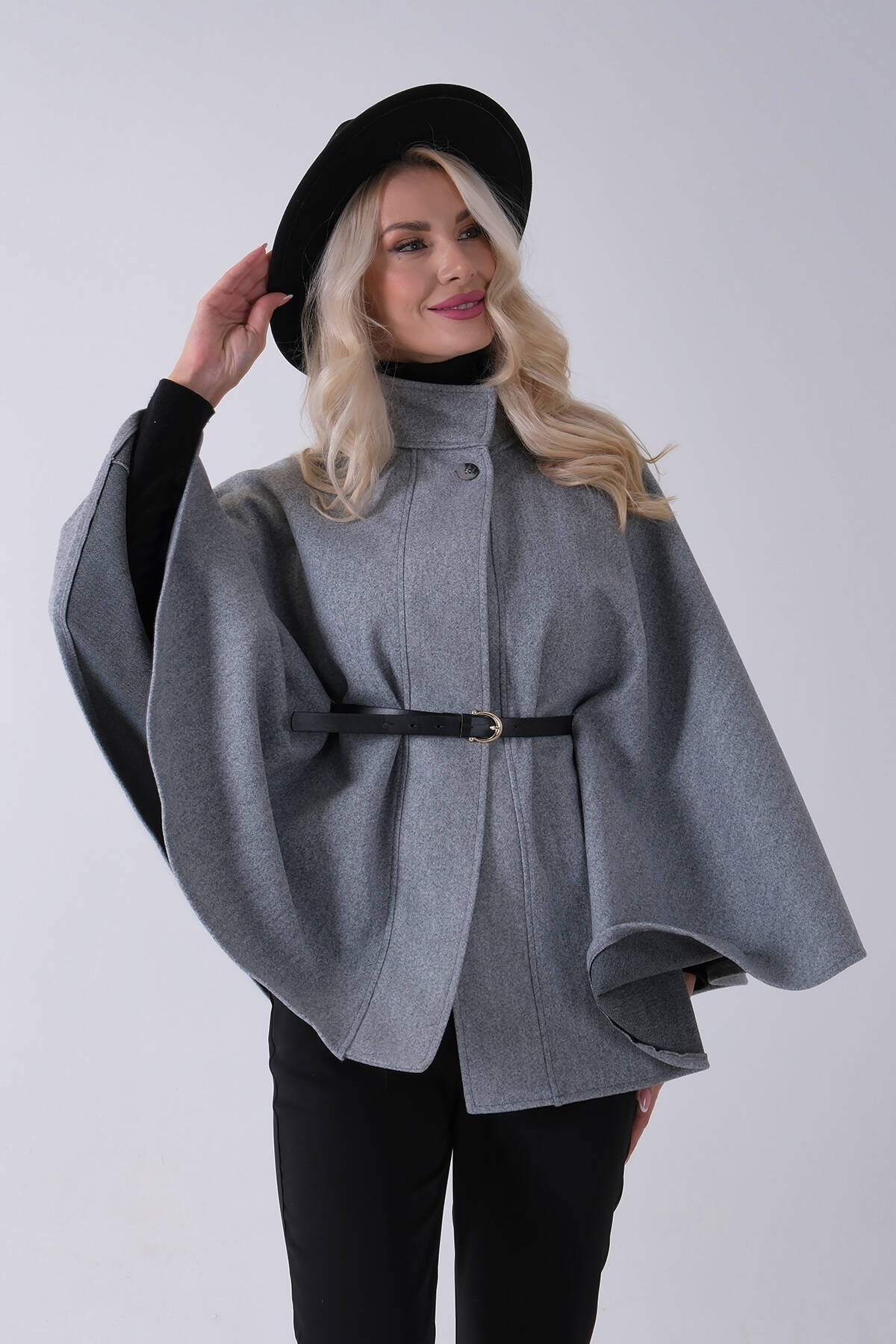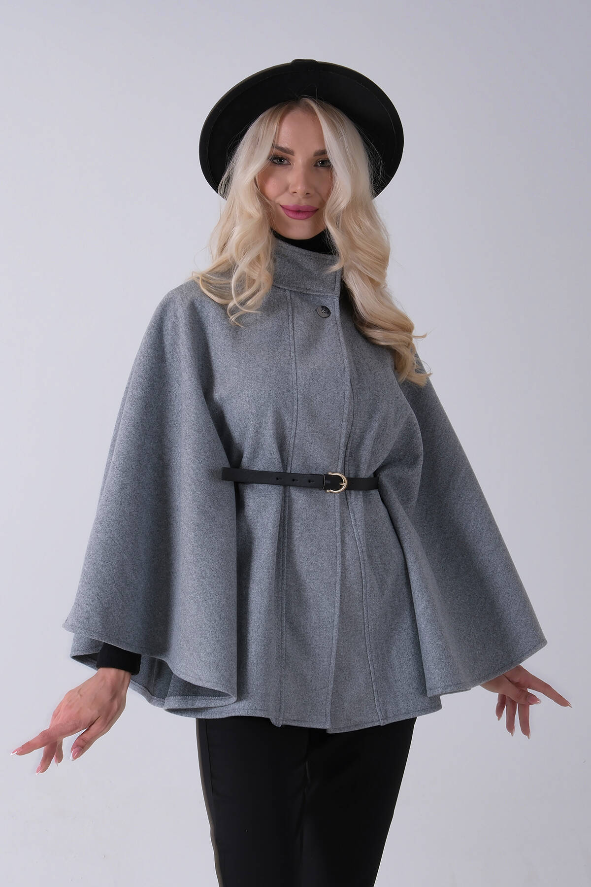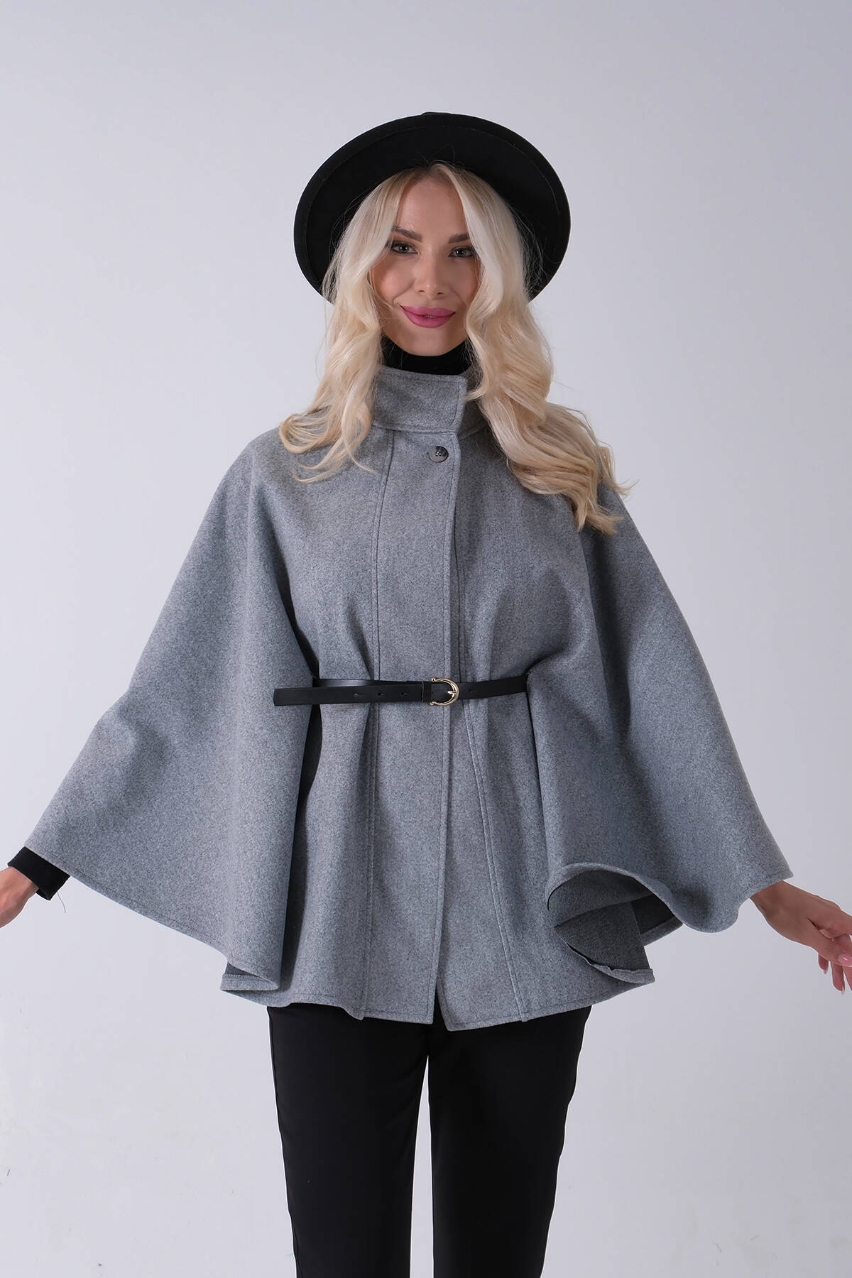 Gri Hakim Yaka Tek Düğmeli Kemerli Panço 31050725.06