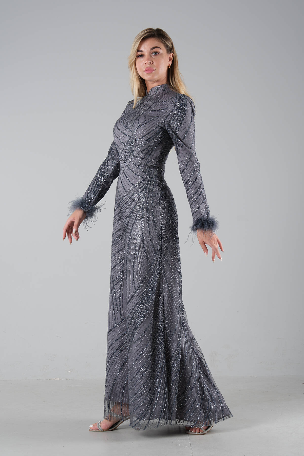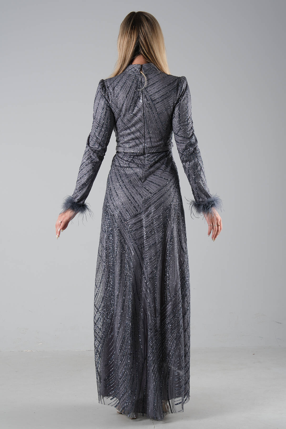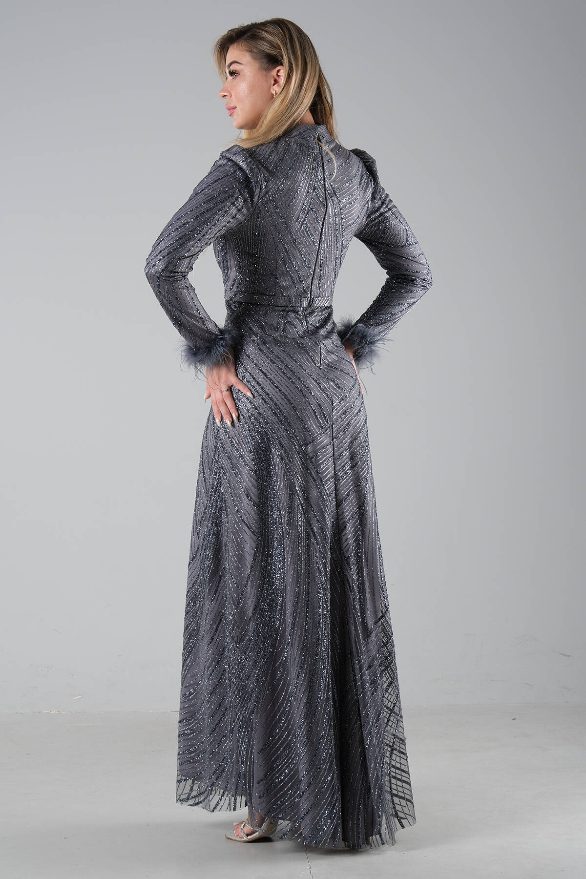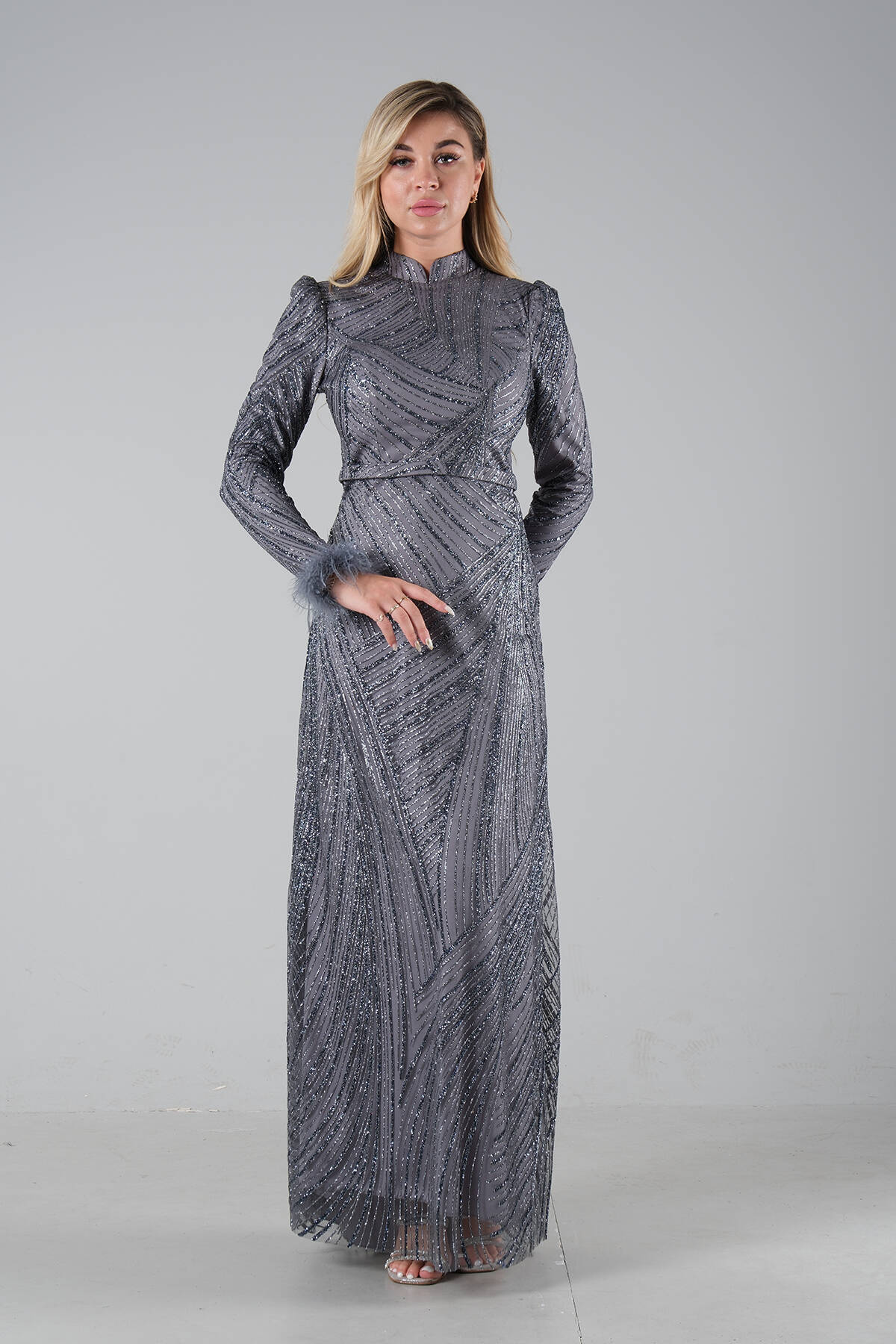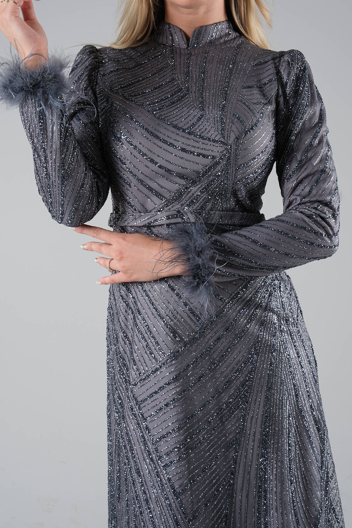 Modelin Ölçüleri : Boy: 1.80 cm / Göğüs: 88 cm / Bel: 69 cm /Basen : 94 cm Mankenin Üzerindeki Ürün 38/M Bedendir %100 Polyester Uzun Hakim Yaka Balon Kol Kol Uçları Tüylü Simli Abiye Ürün Boyu : 158 cm Stüdyo Çekimlerinde Renkler Işık Farklılıgından Dolayı Değişiklik Gösterebilir (Dikkat! Ürünlerimiz güvenlik bandı ile gönderilmektedir . Güvenlik bandı olmayan ürünlerin iadesi kabul edilmeyecektir)