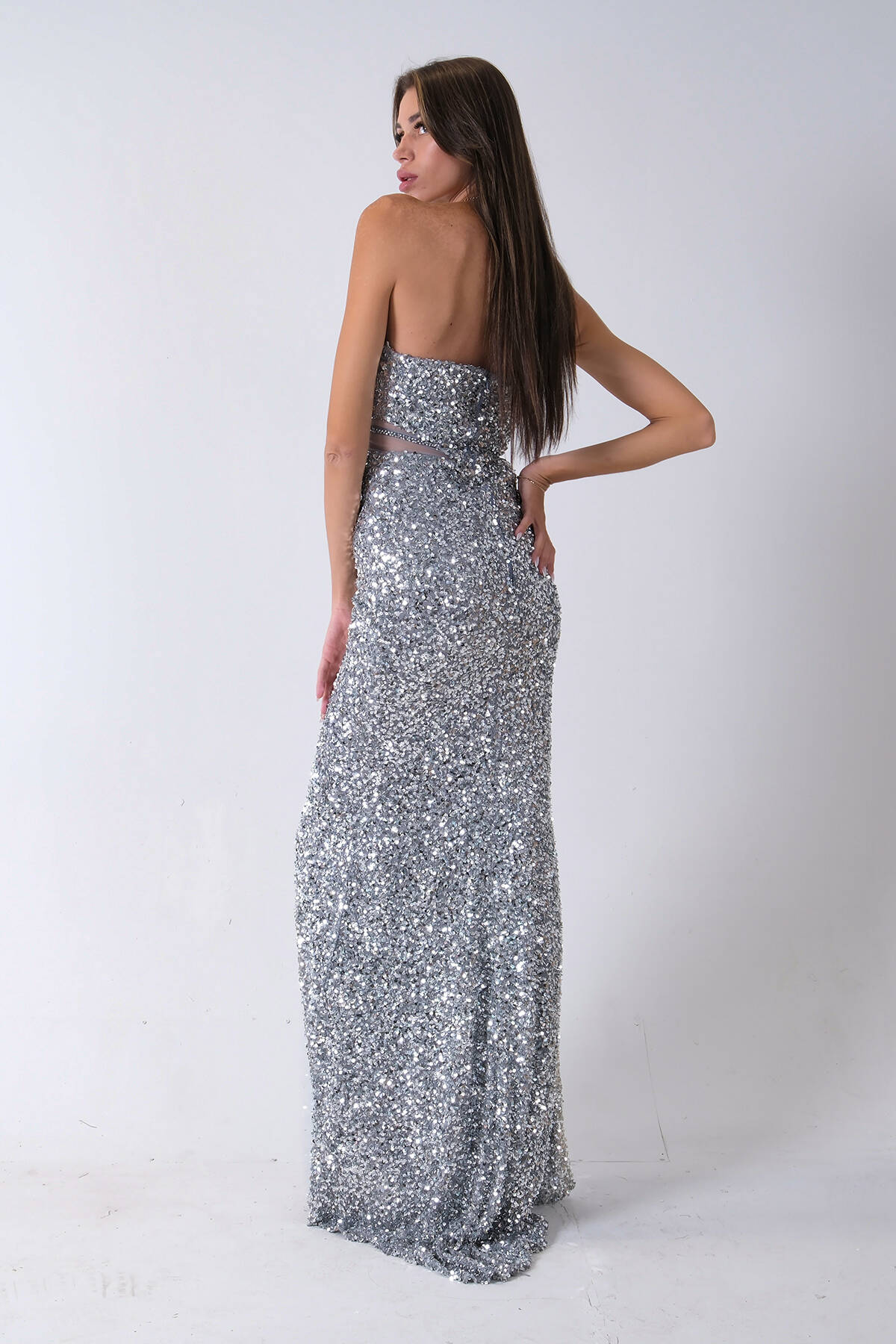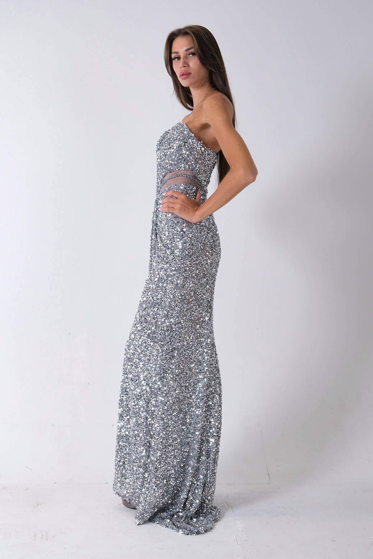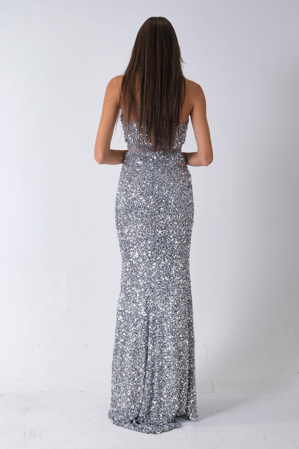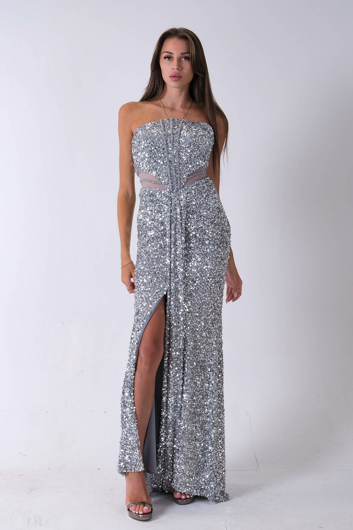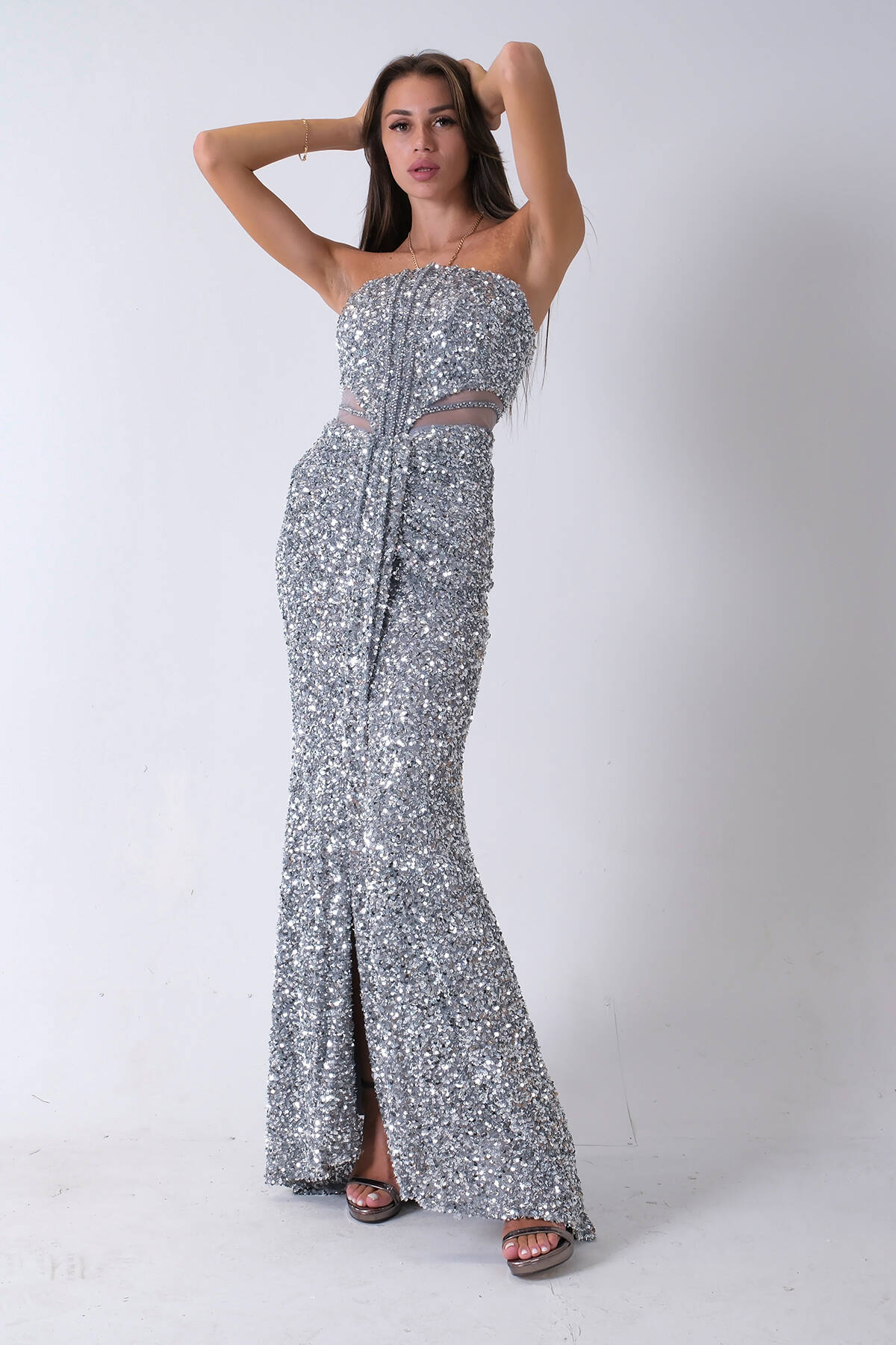 Gri Önü Taş Detaylı Yırtmaçlı Pul Payet Straplez Abiye 0801163.06