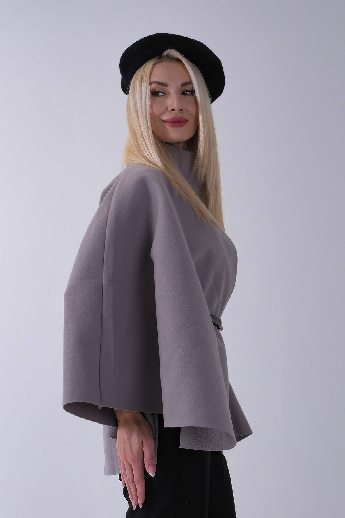 Gri Önü Düğme Kapamalı Kemerli Yakası Kürklü Panço 47122714.06