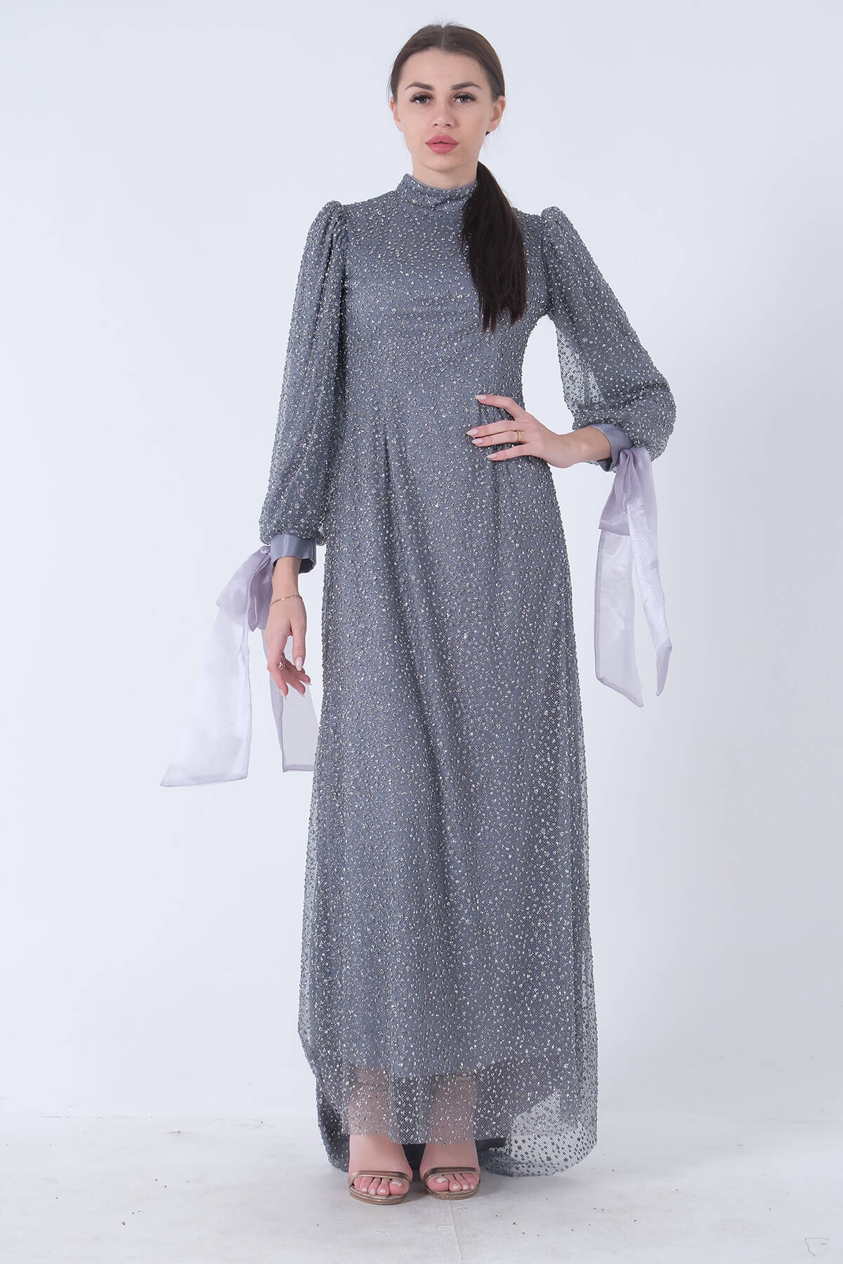Gri Taş İşlemeli Hakim Yaka Fiyonklu Tesettür Abiye 6502462.06