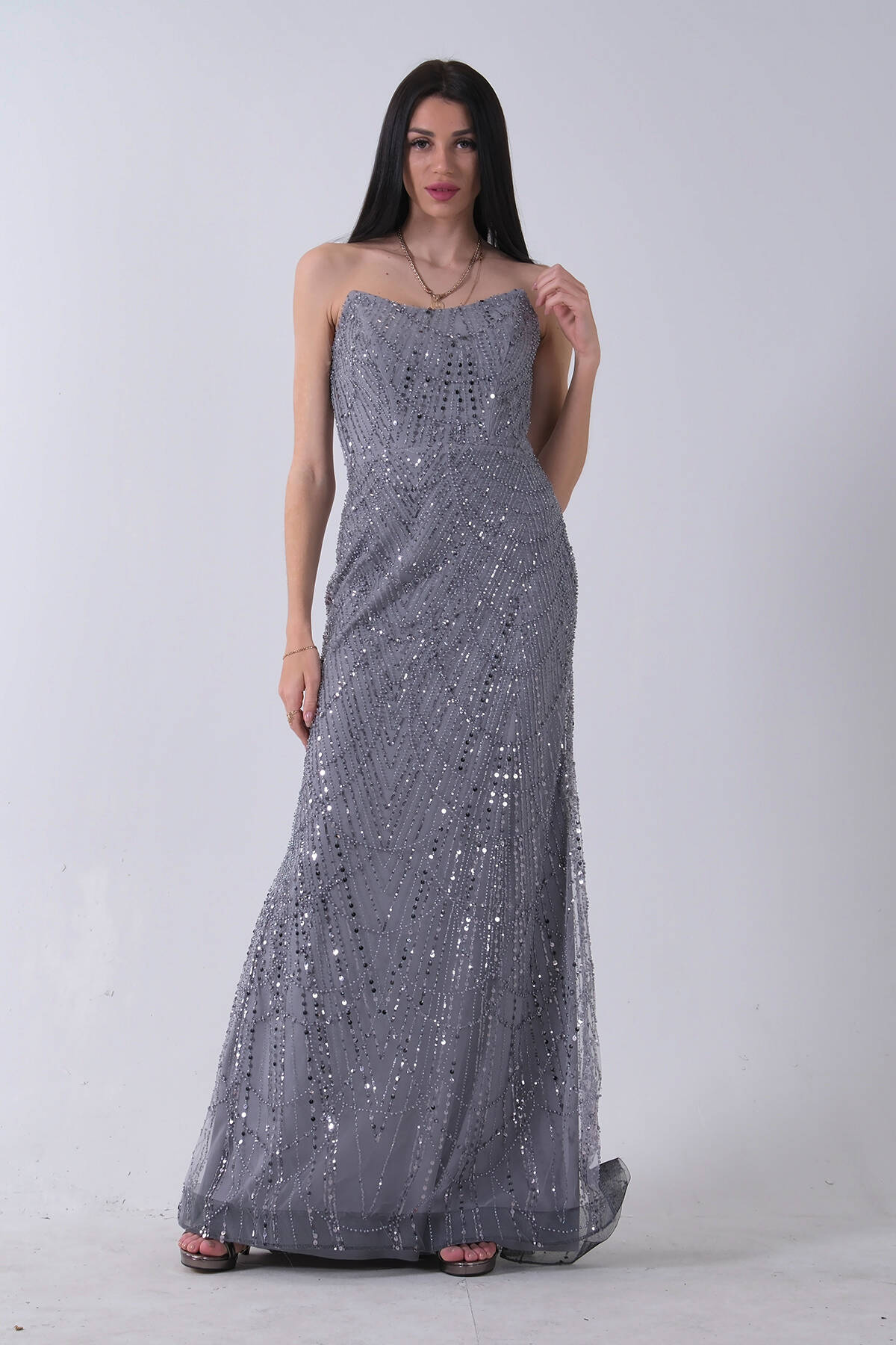 Gri Önü Taş Detaylı Yırtmaçlı Pul Payet Straplez Abiye 0801163.06