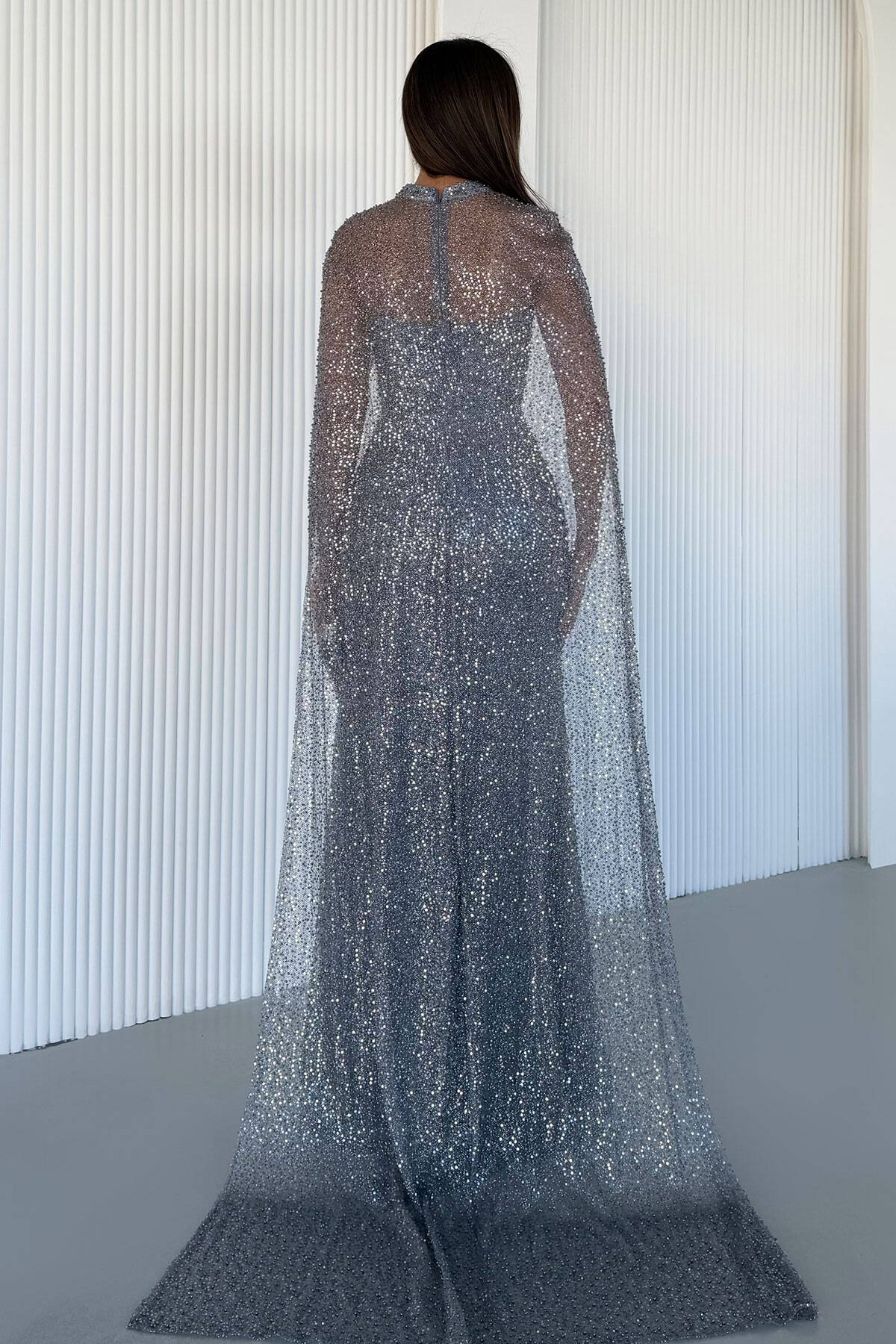 Gri V Yaka Payetli Işıltılı Uzun Abiye 9705495.06