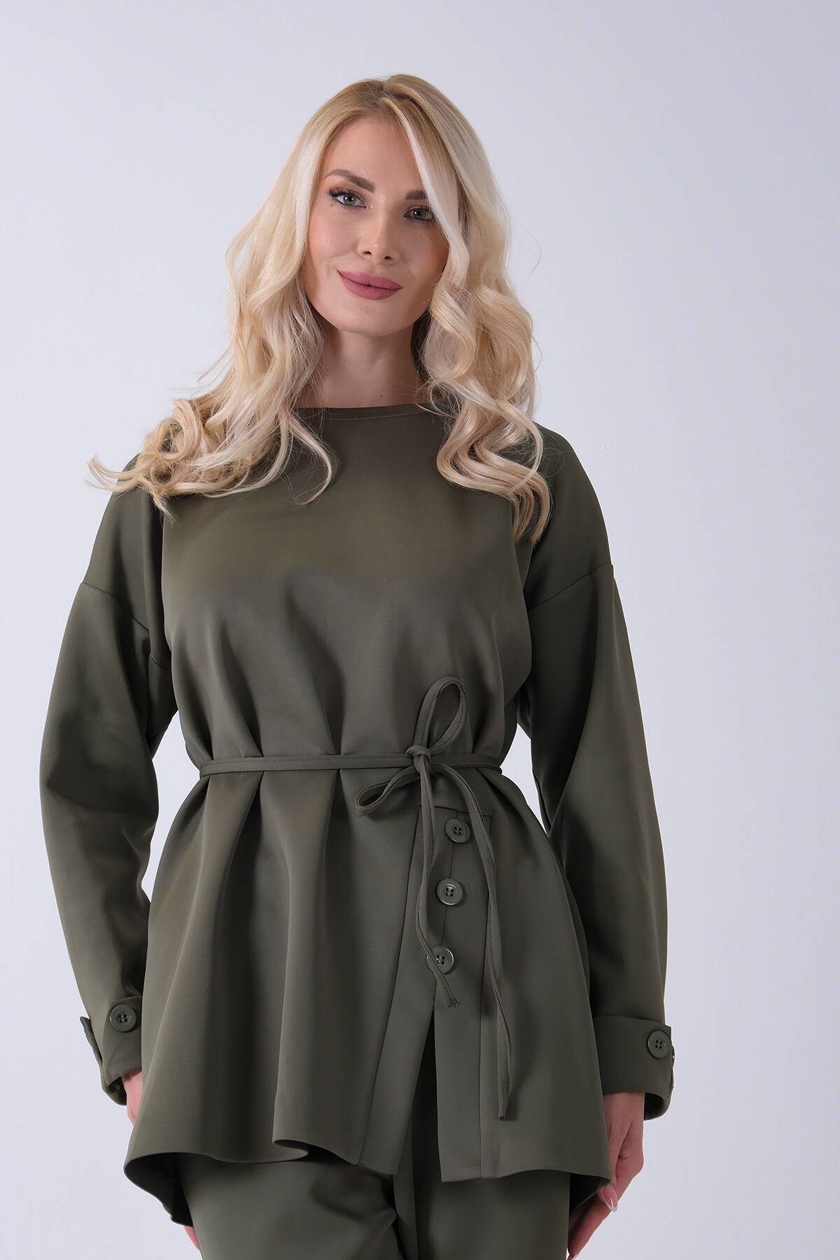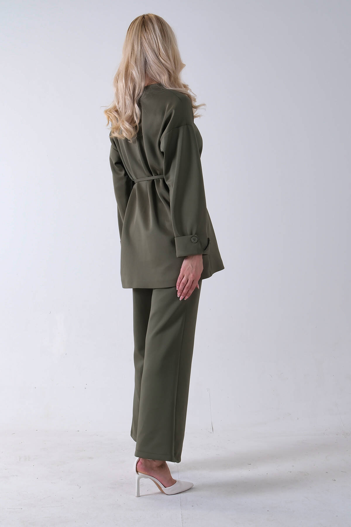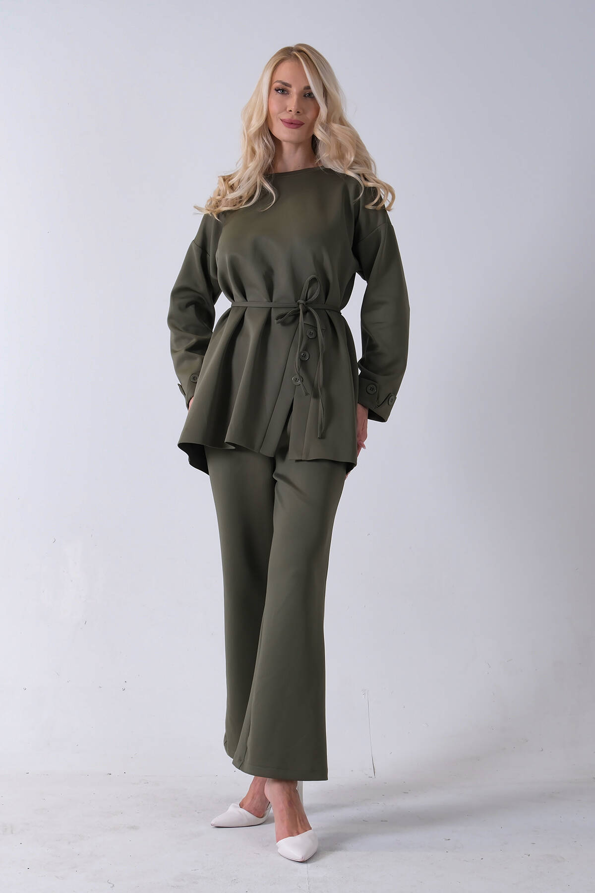 Haki Bisiklet Yaka Önü Düğme Kapama Görünümlü Pantolonlu Scuba Takım 4592265.23