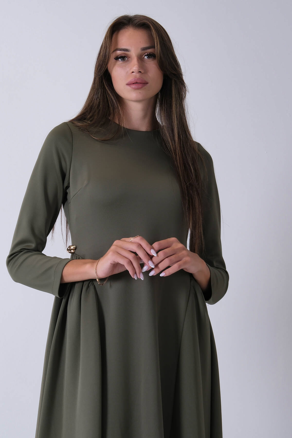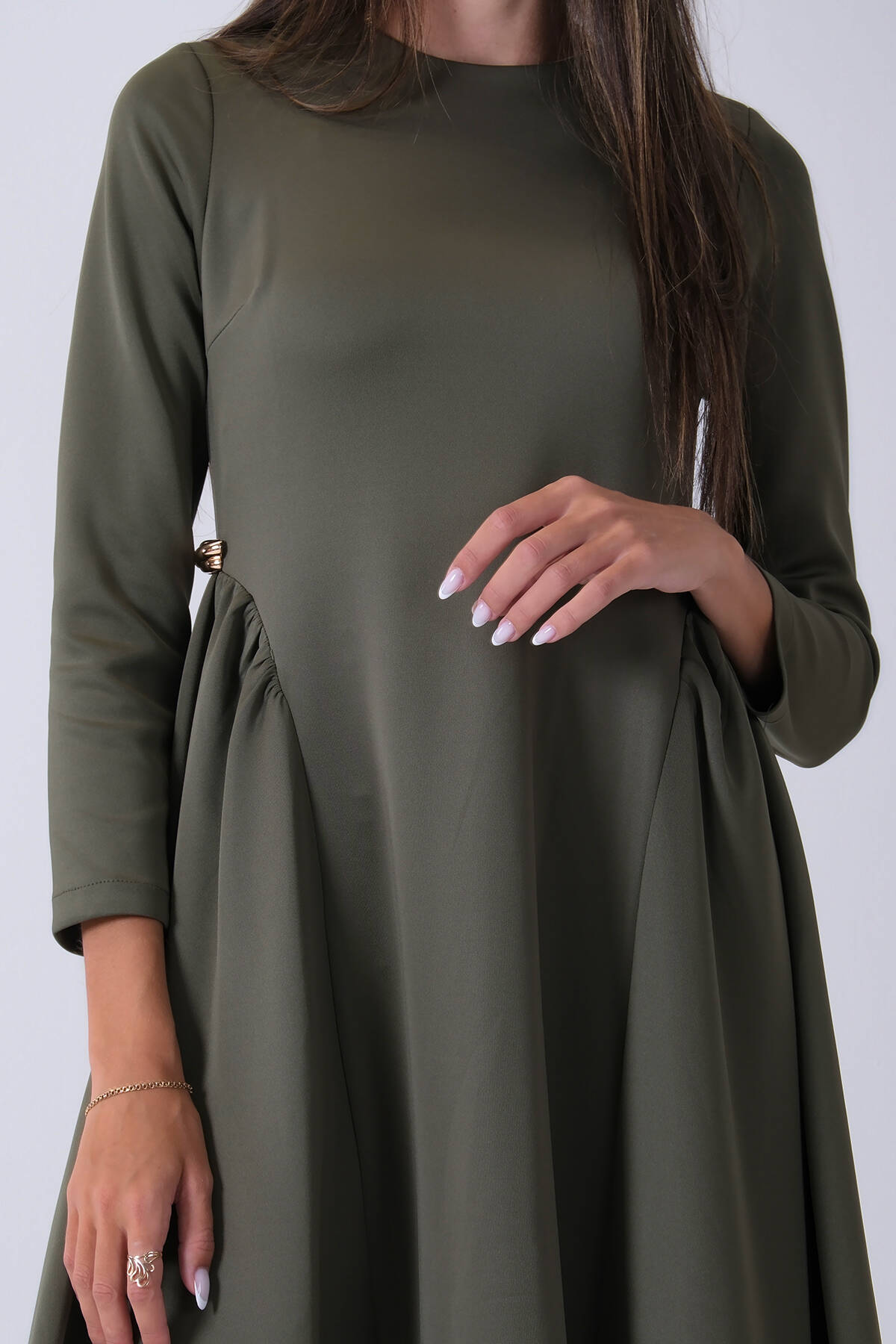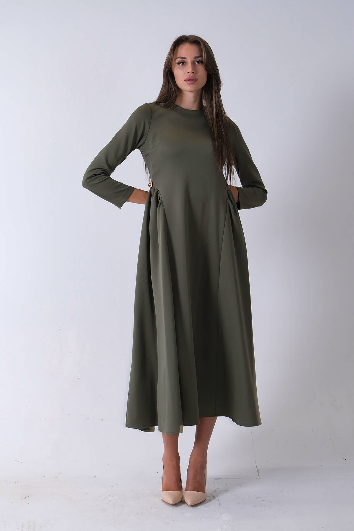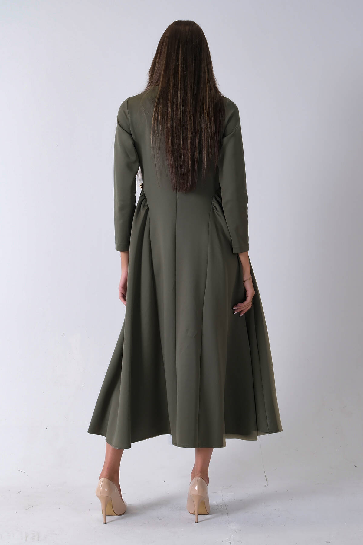 Haki Omuz Fiyonk Detaylı Kemerli Bisiklet Yaka Scuba Tesettür Elbise 4593456.23