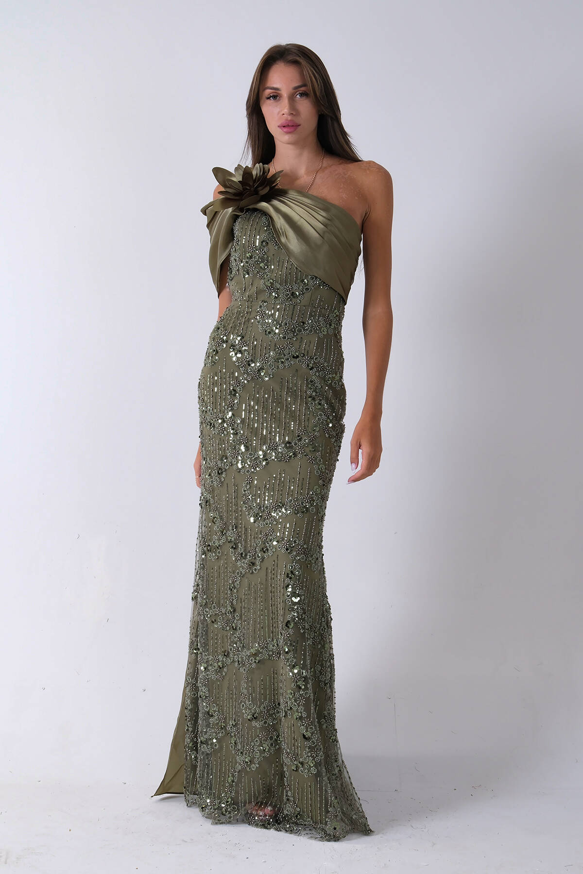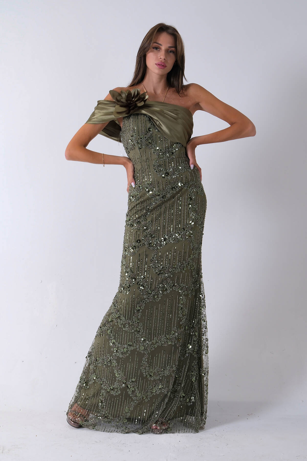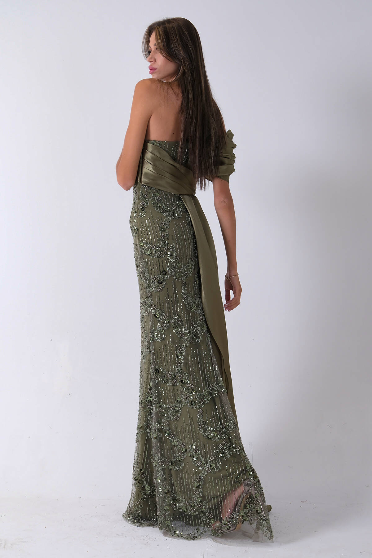 Haki Çiçek Detaylı Pul Boncuk İşlemeli Kuyruklu Abiye 9705650.23