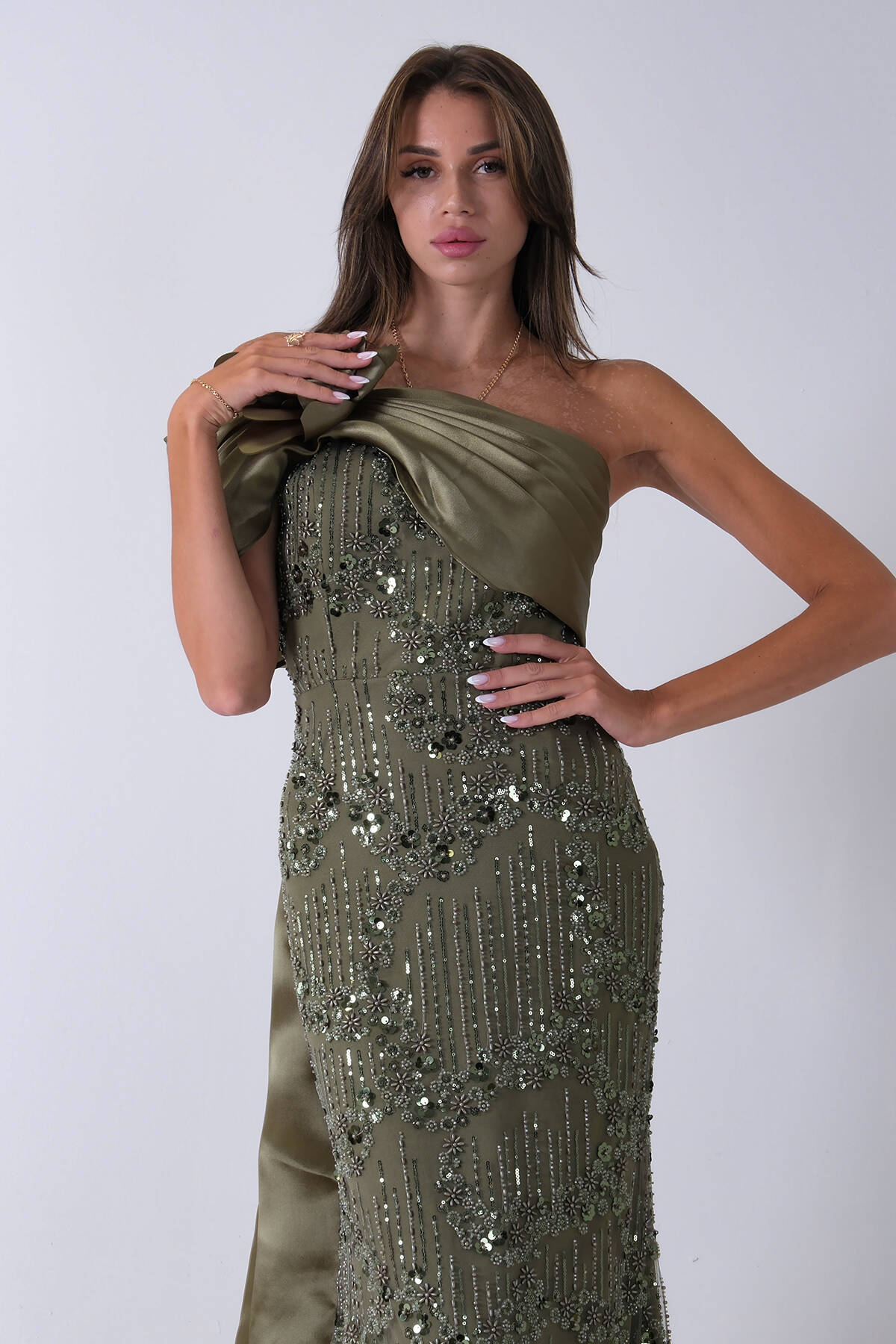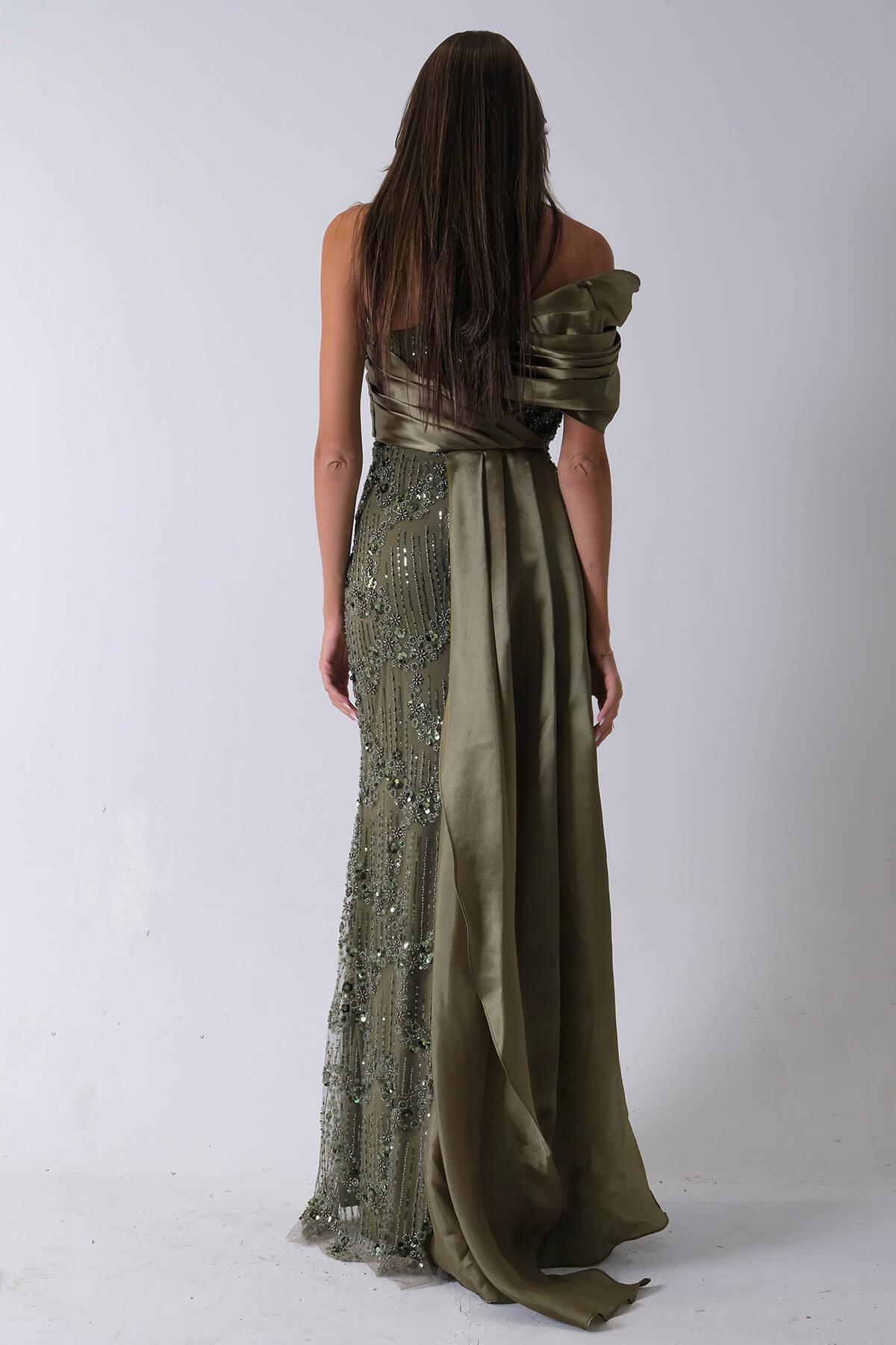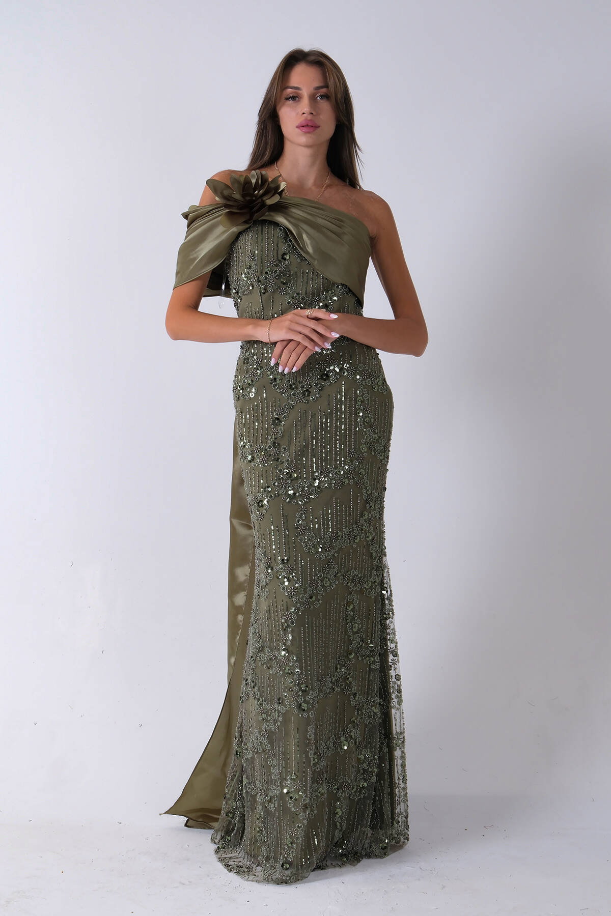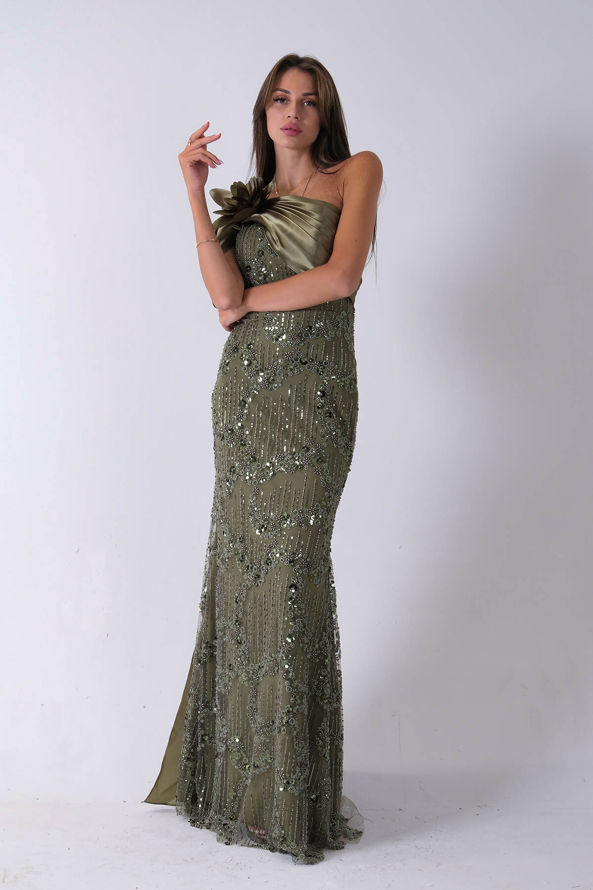 Haki Çiçek Detaylı Pul Boncuk İşlemeli Kuyruklu Abiye 9705650.23