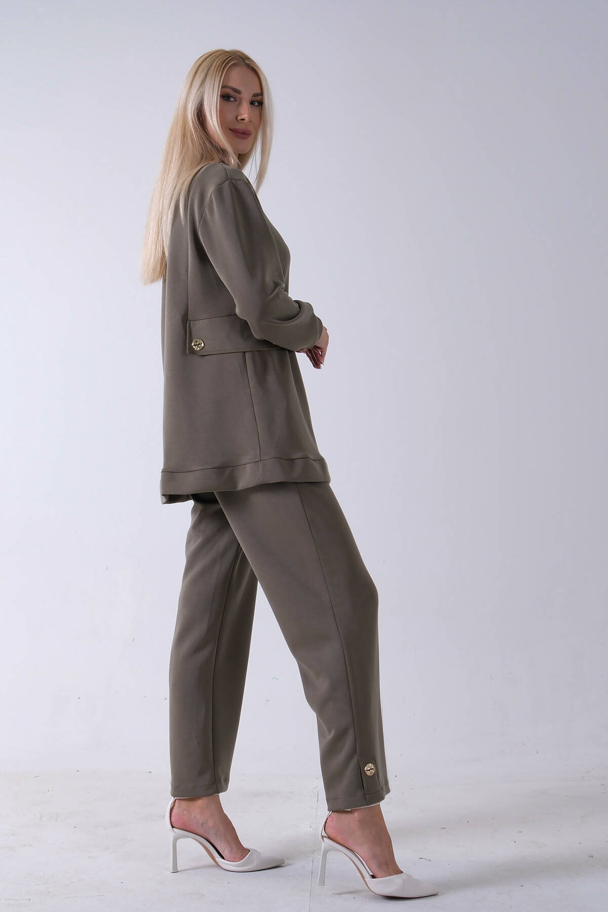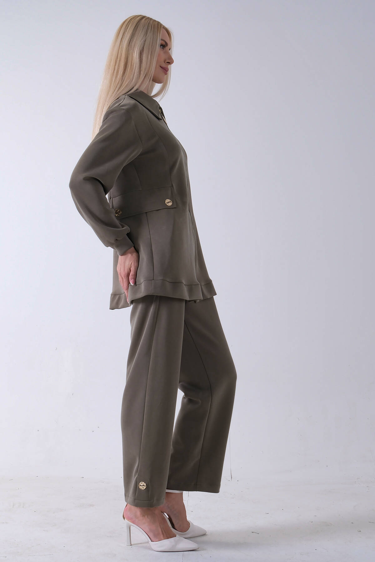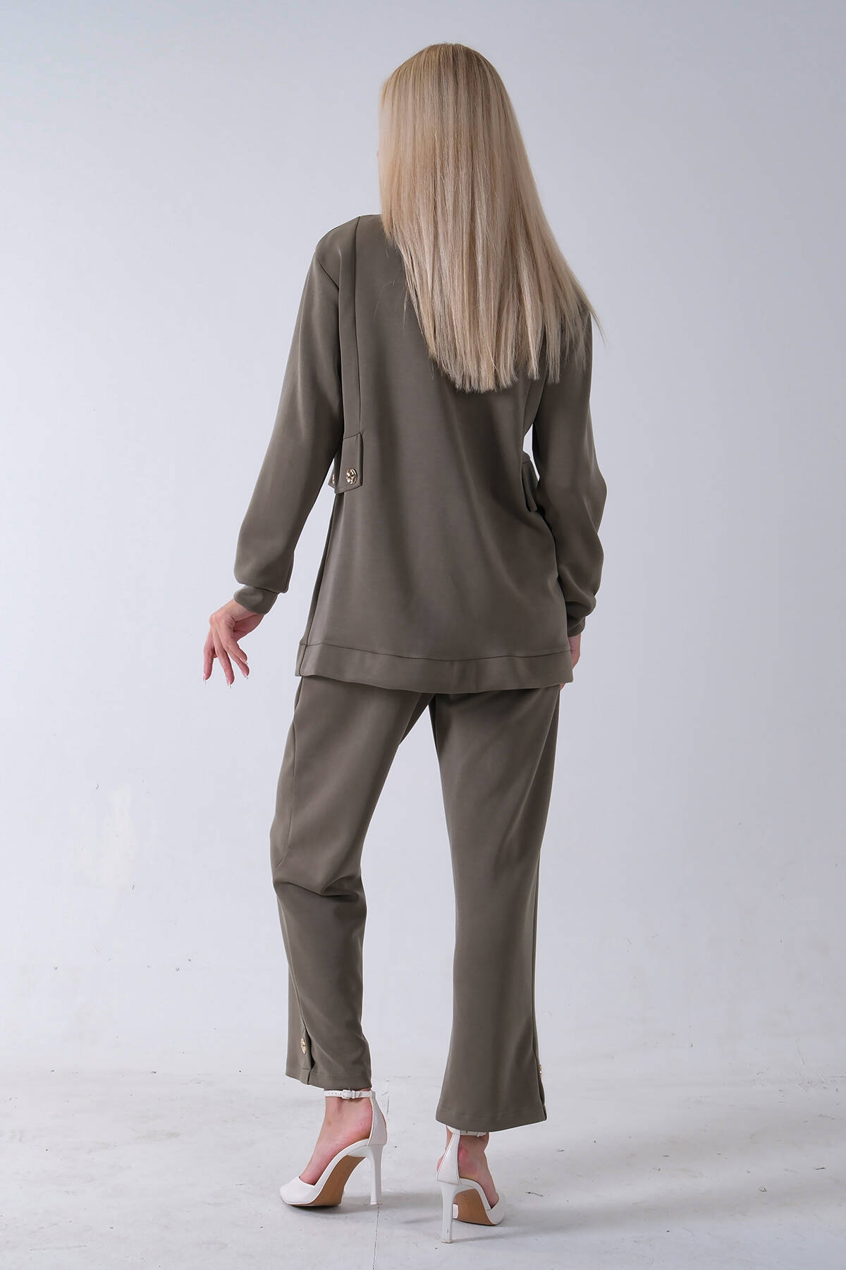 Haki Yaka ve Pantolon Paçası Taş Detaylı Tunikli Takım 4703048.23