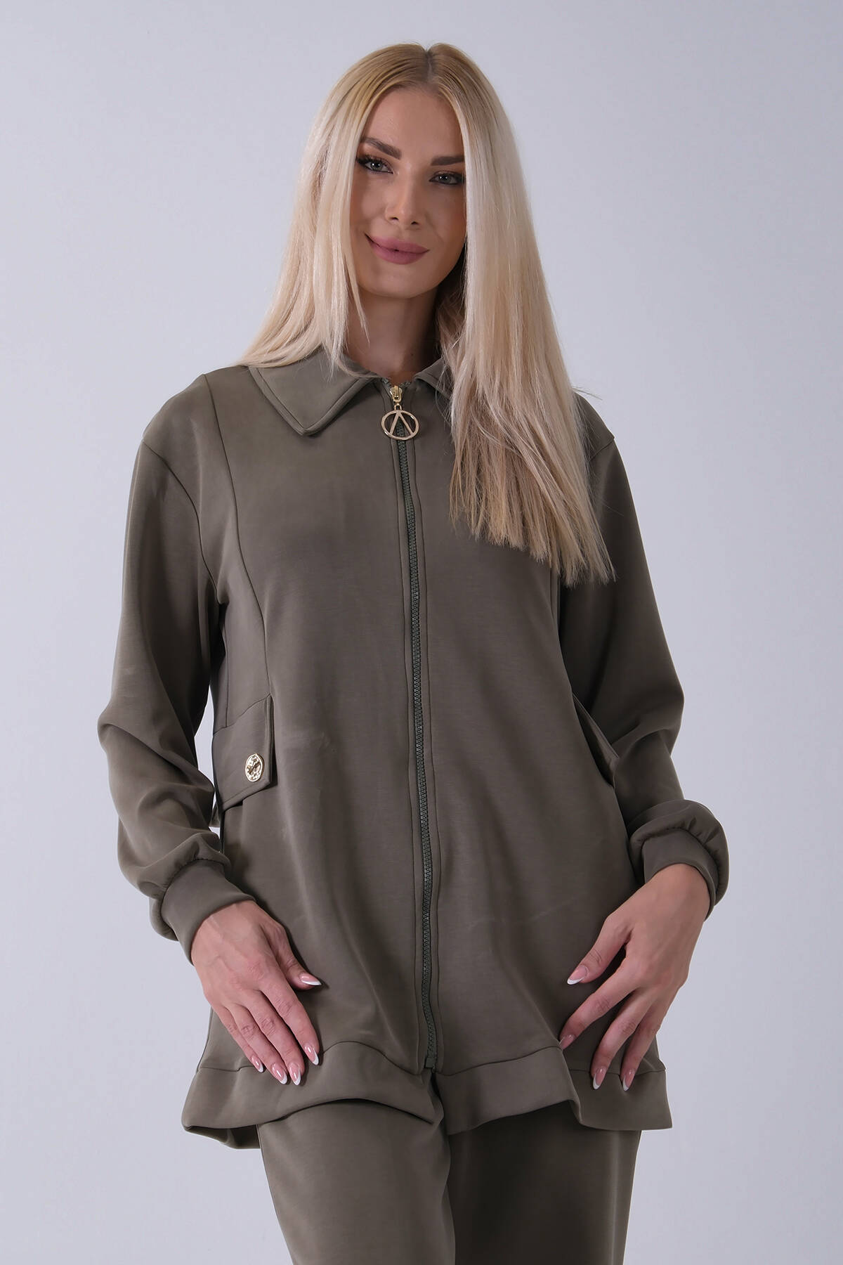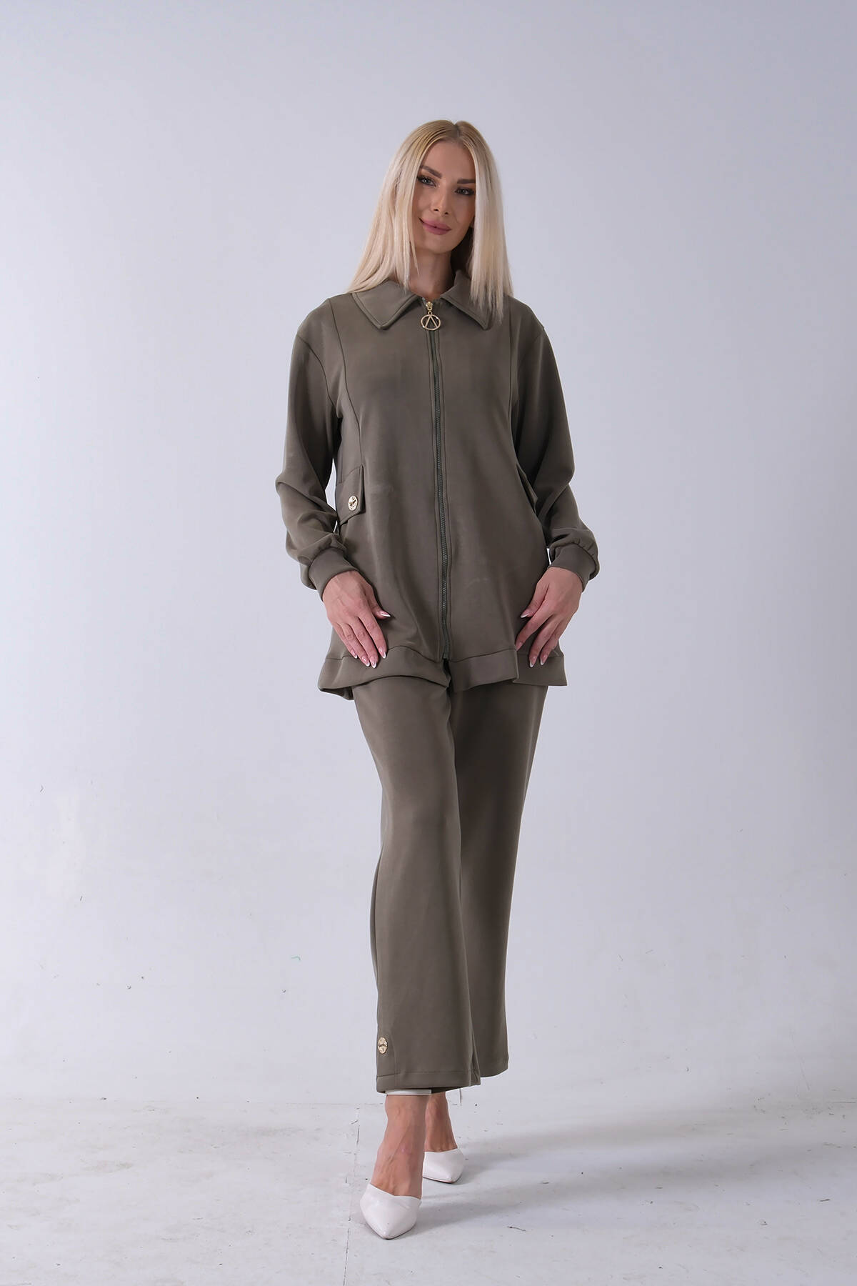 Haki Fermuar Kapamalı 2 Cep Görünüm Detaylı Sweat Pantolonlu Takım 4577266.23