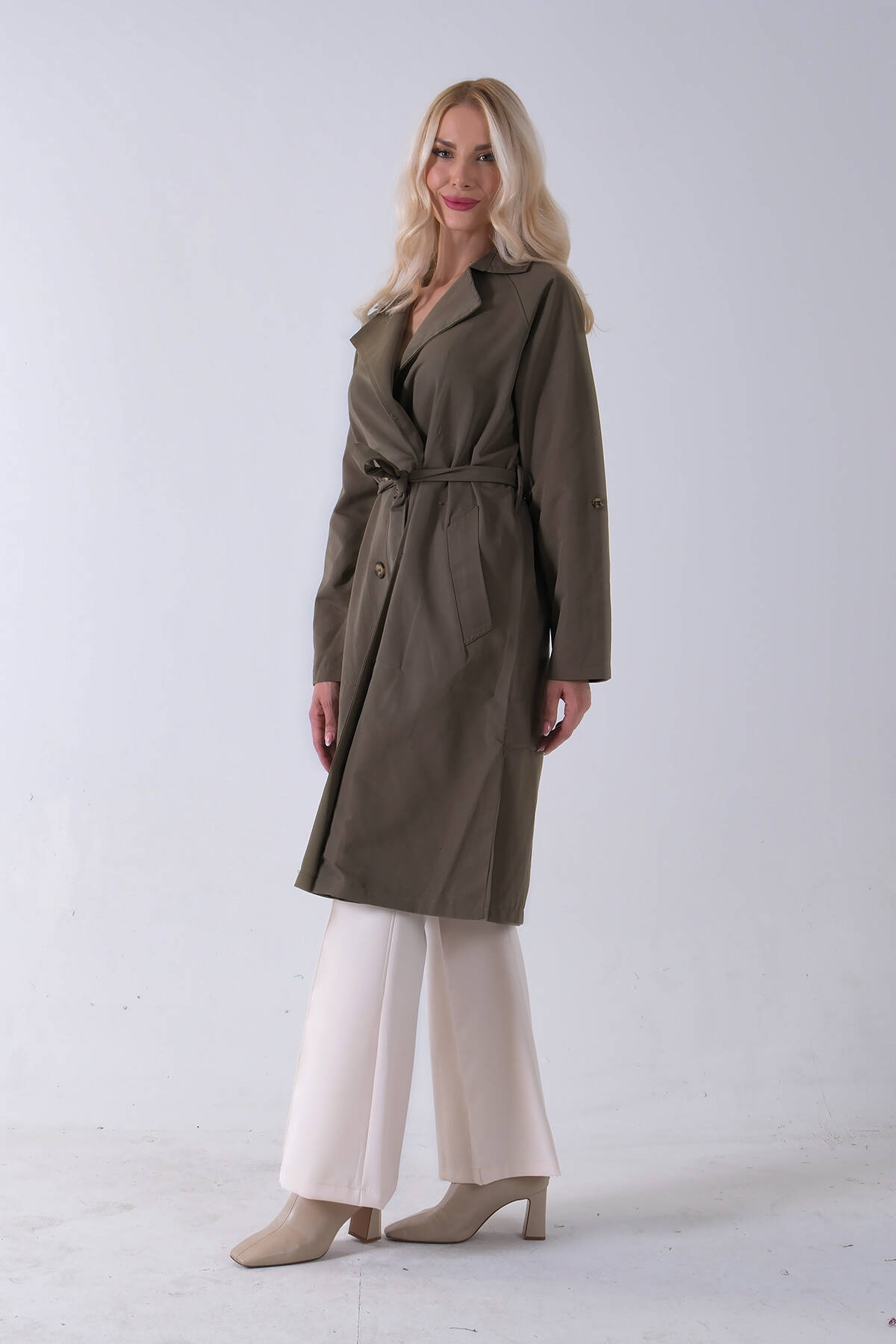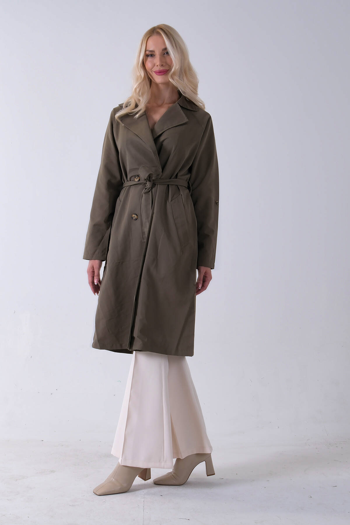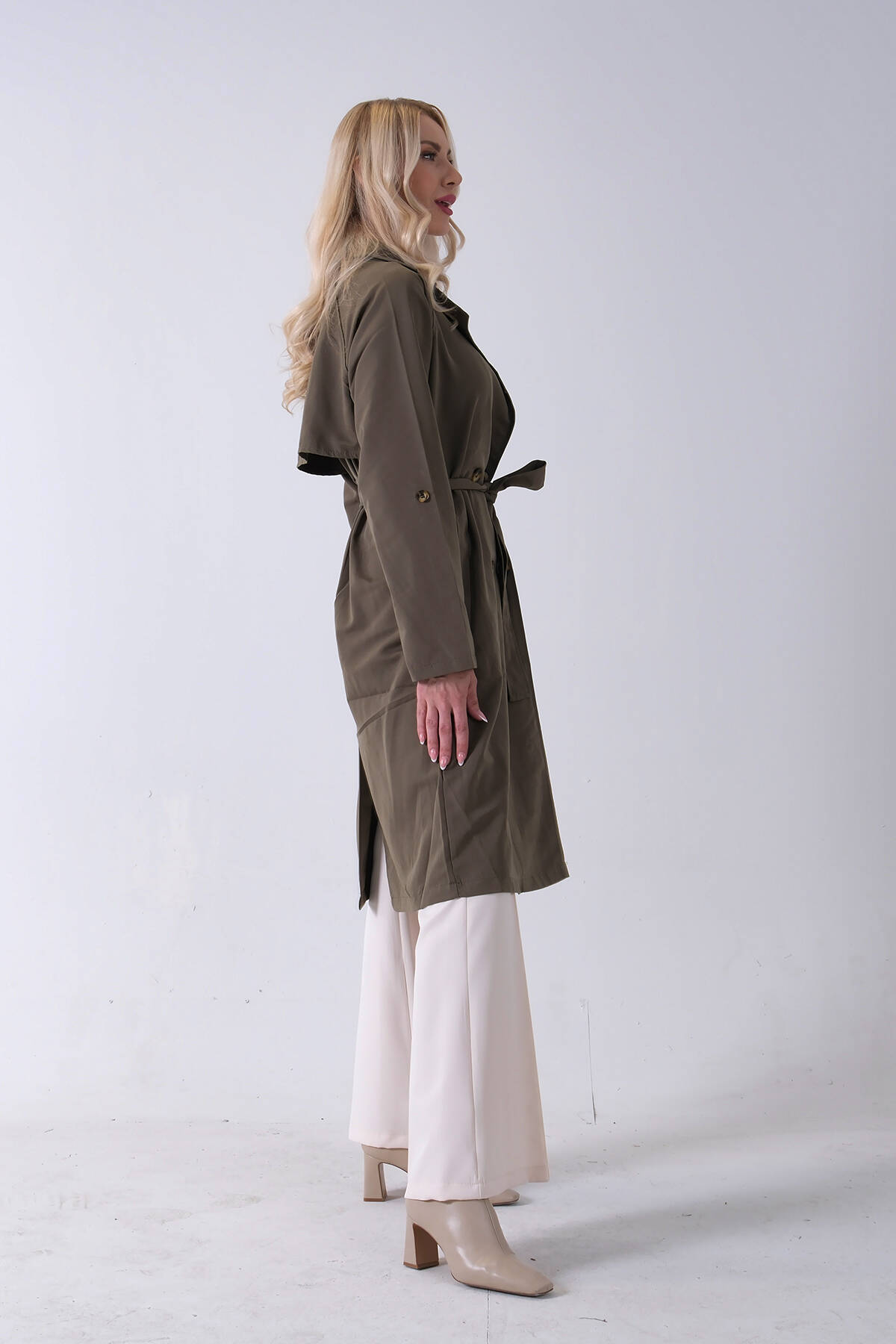 Haki Önden Düğme Kapamalı Yandan Cepli Kuşaklı Uzun Trenç 4200823.23