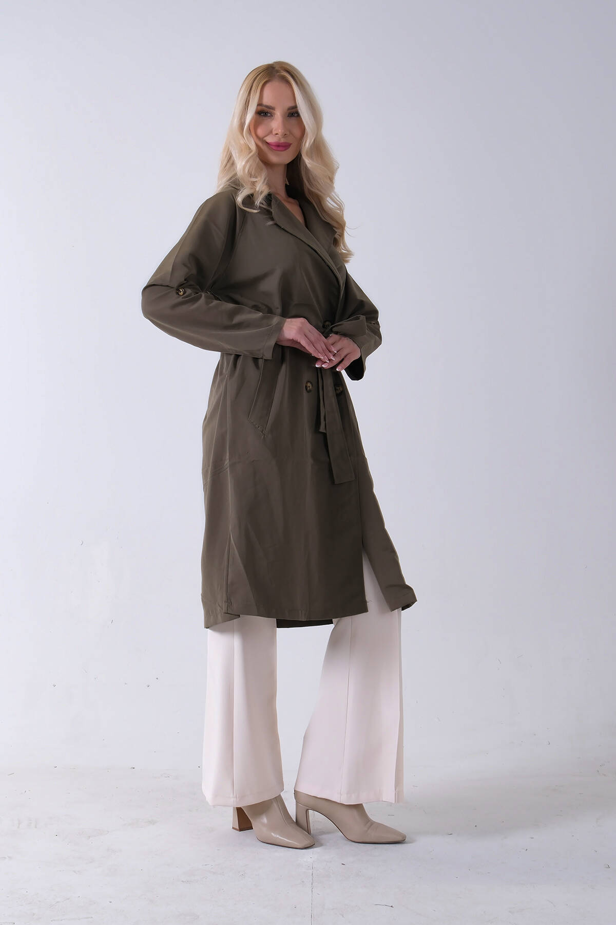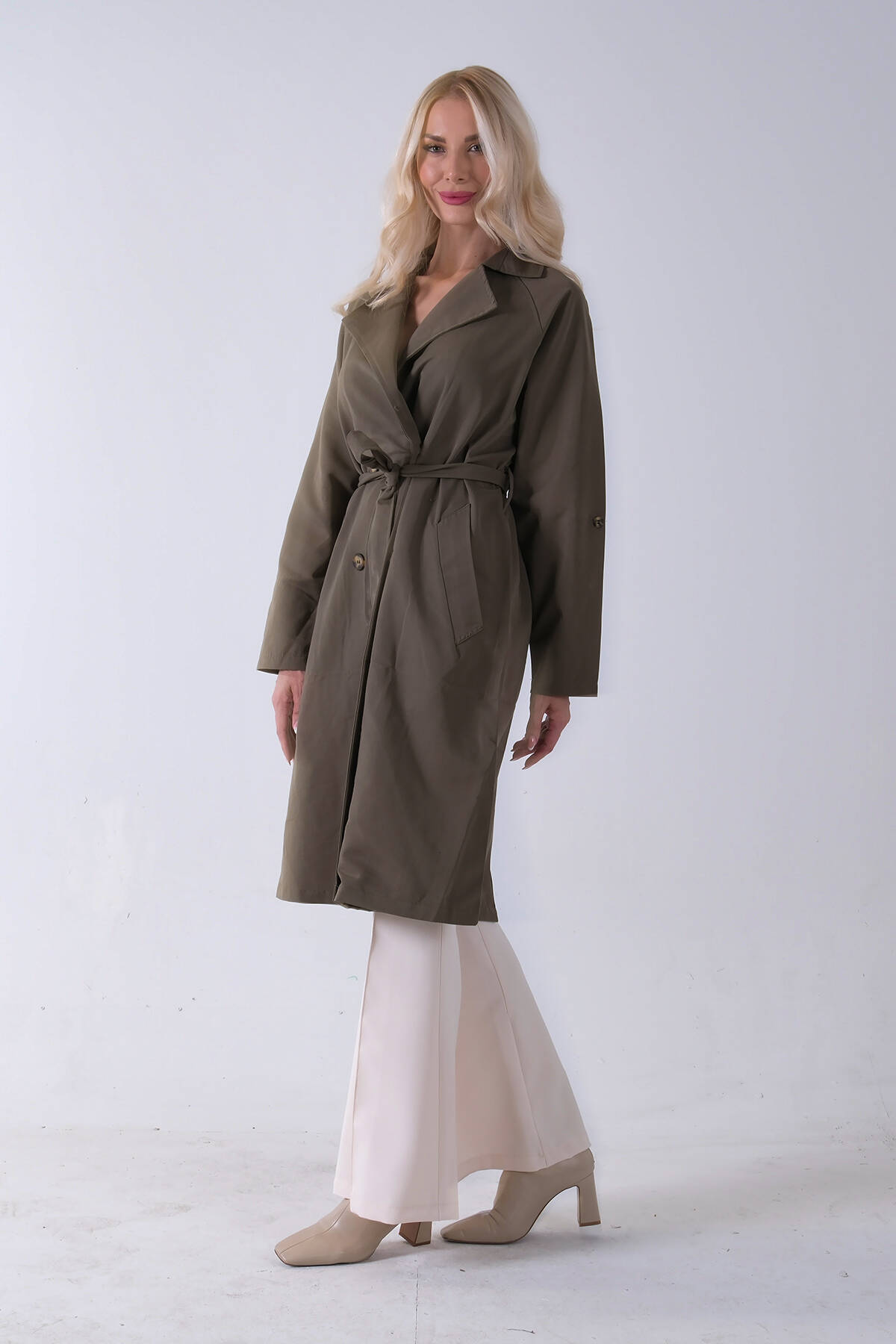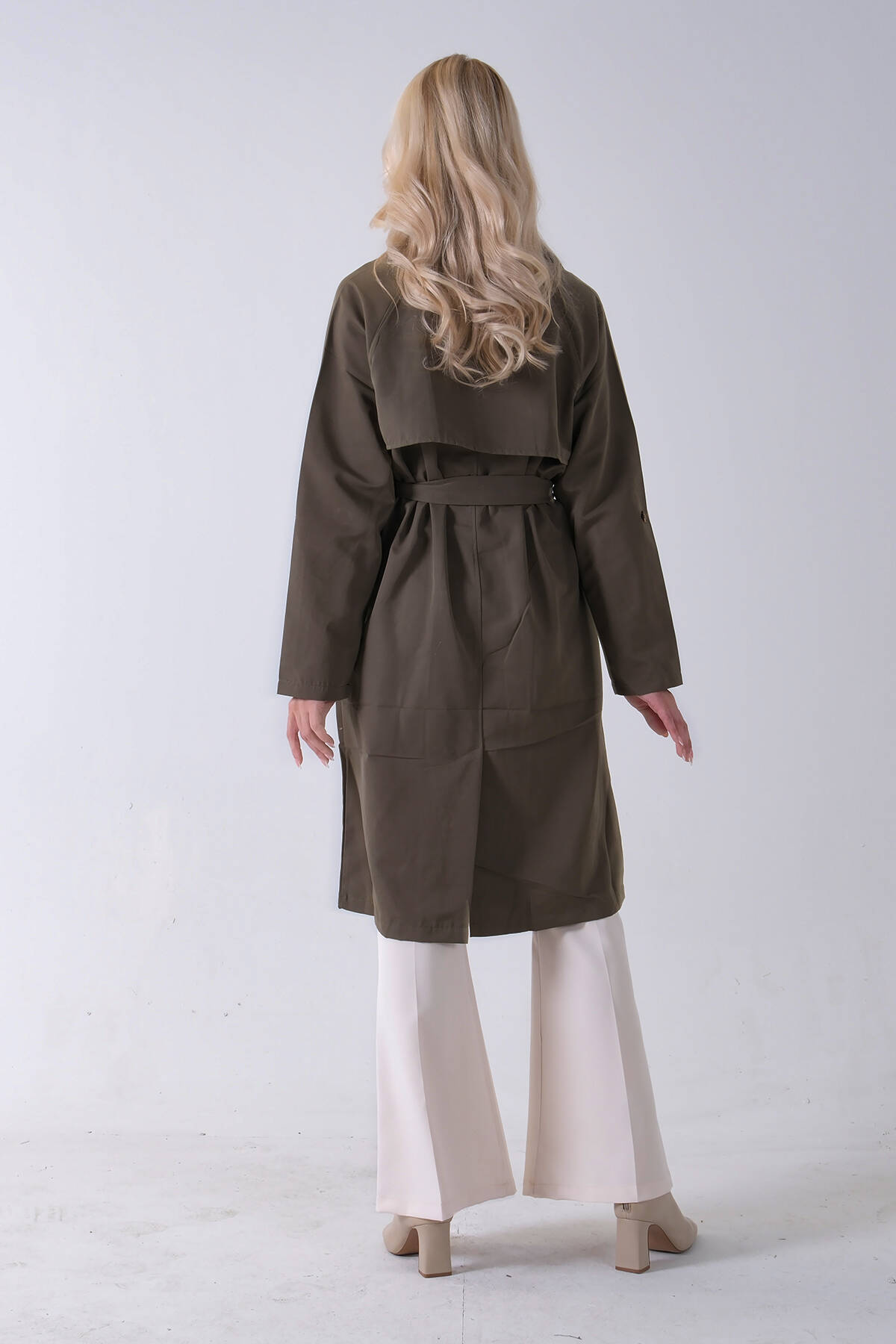 Haki Önden Düğme Kapamalı Yandan Cepli Kuşaklı Uzun Trenç 4200823.23