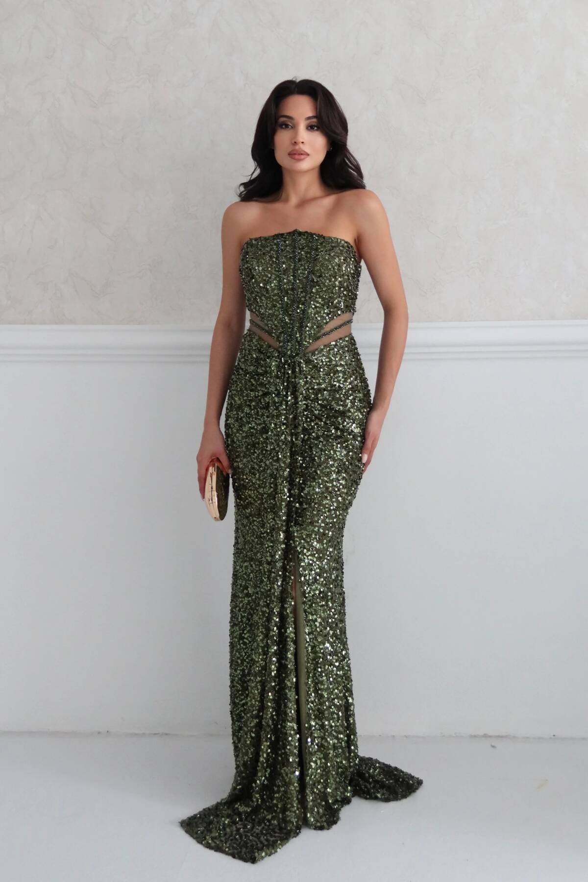 Haki Önü Taş Detaylı Yırtmaçlı Pul Payet Straplez Abiye 0801163.23