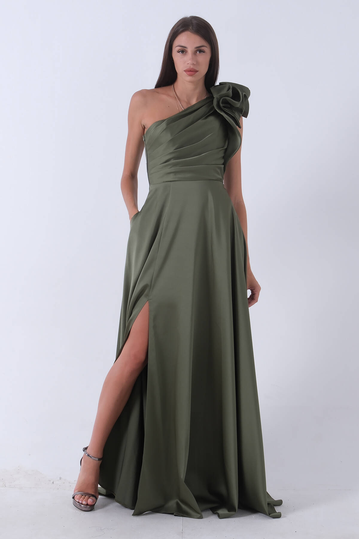 Haki Saten Omuz Fiyonklu Abiye Elbise 1302192.23
