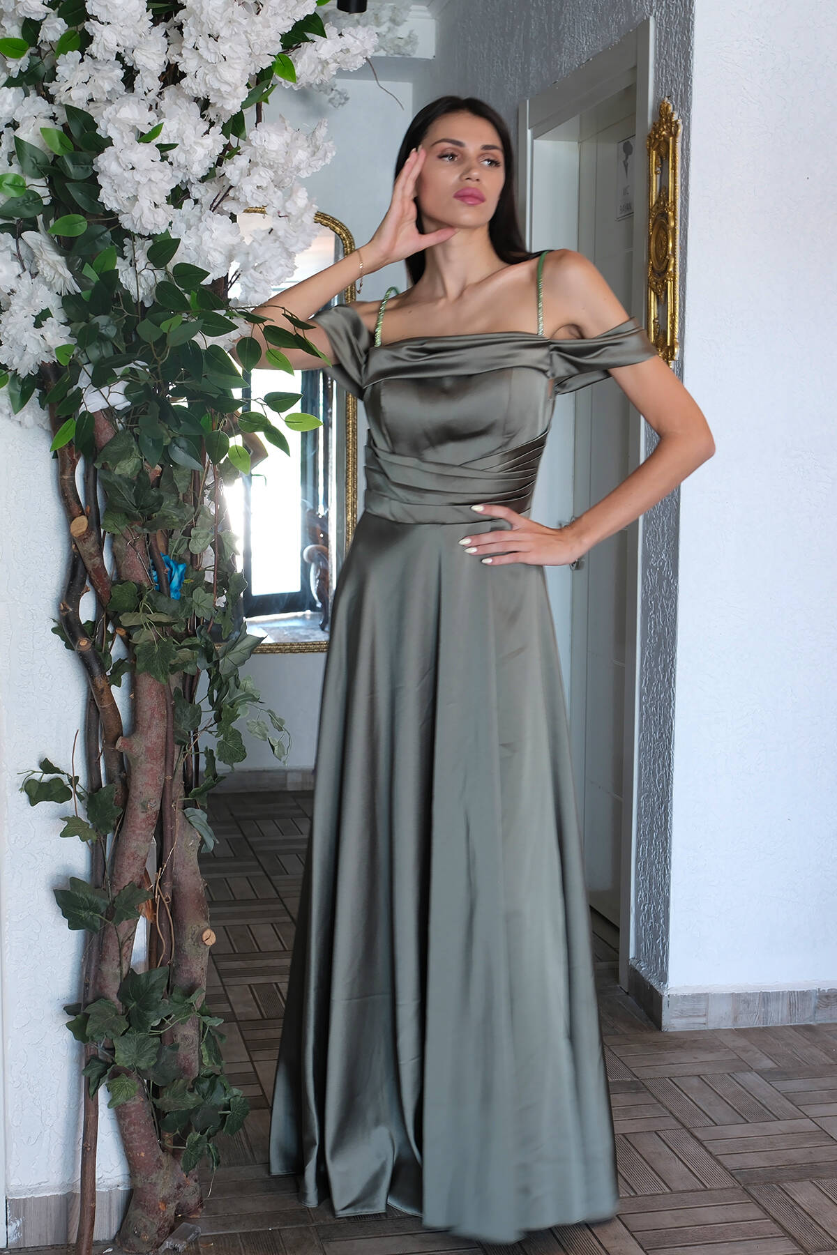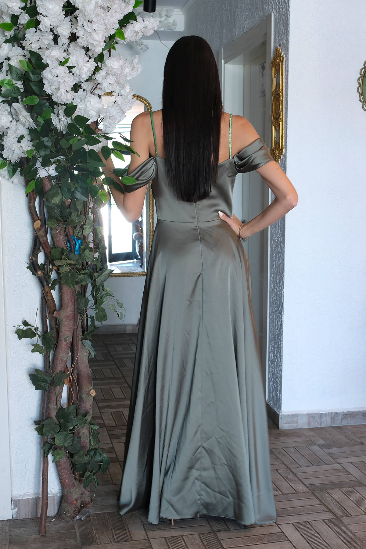 Haki Taş Askılı Düşük Kol Saten Abiye 0806118.23