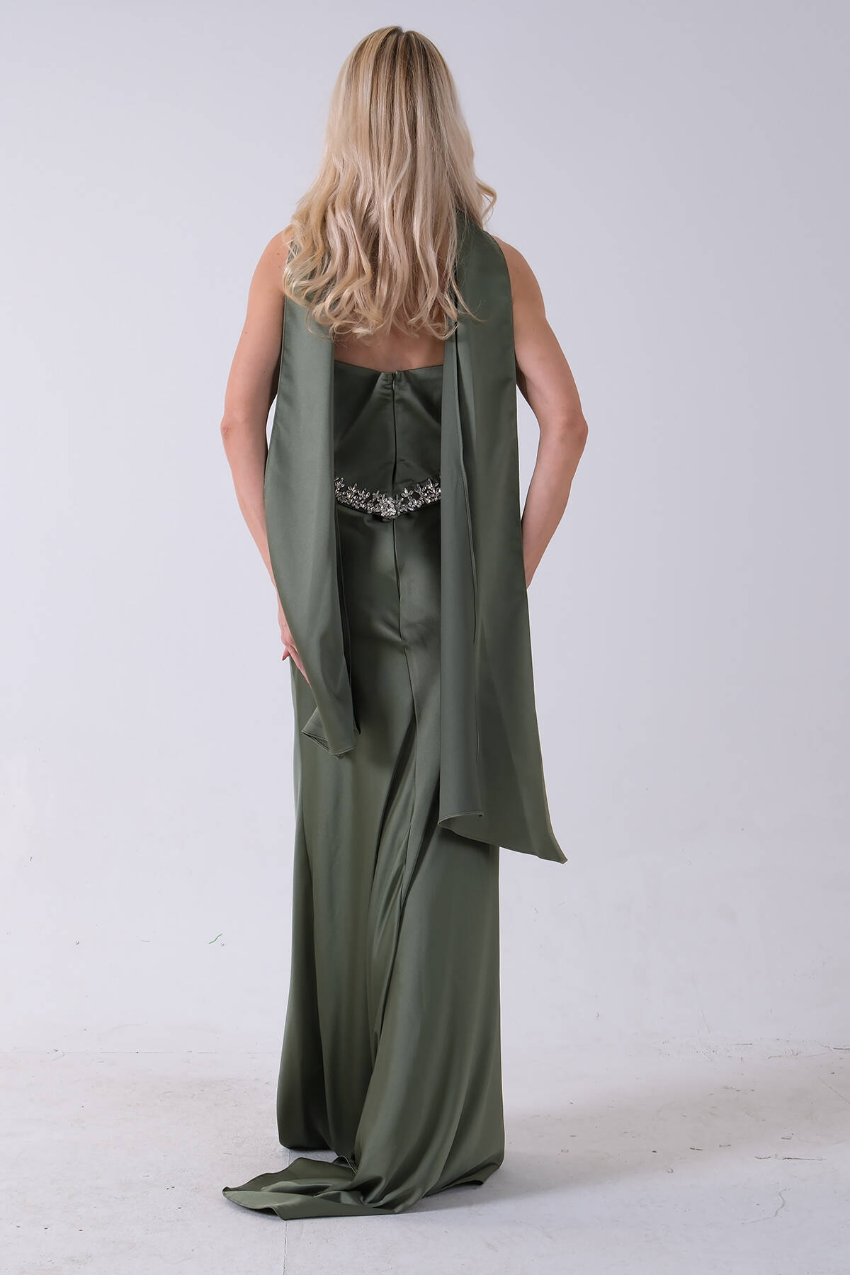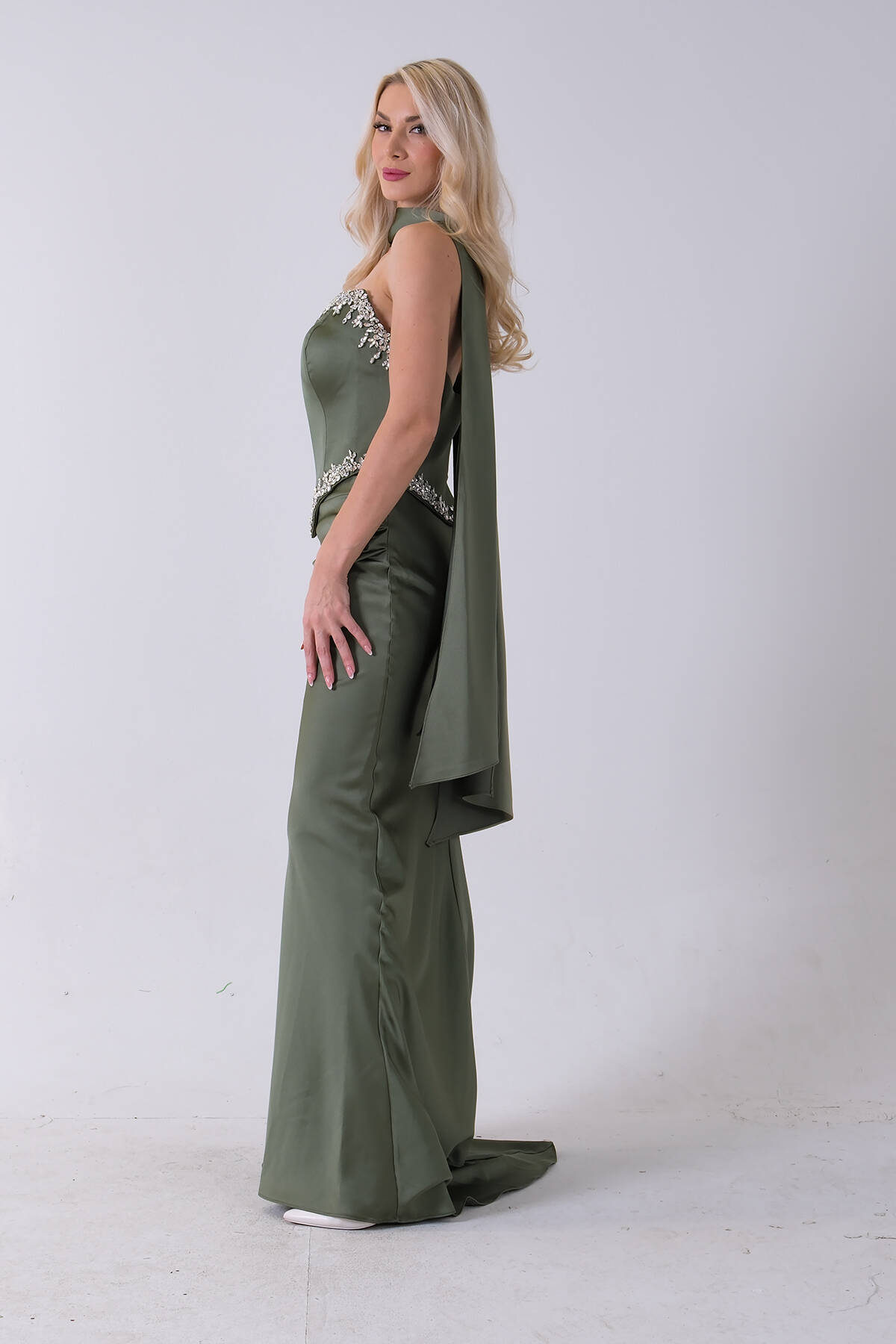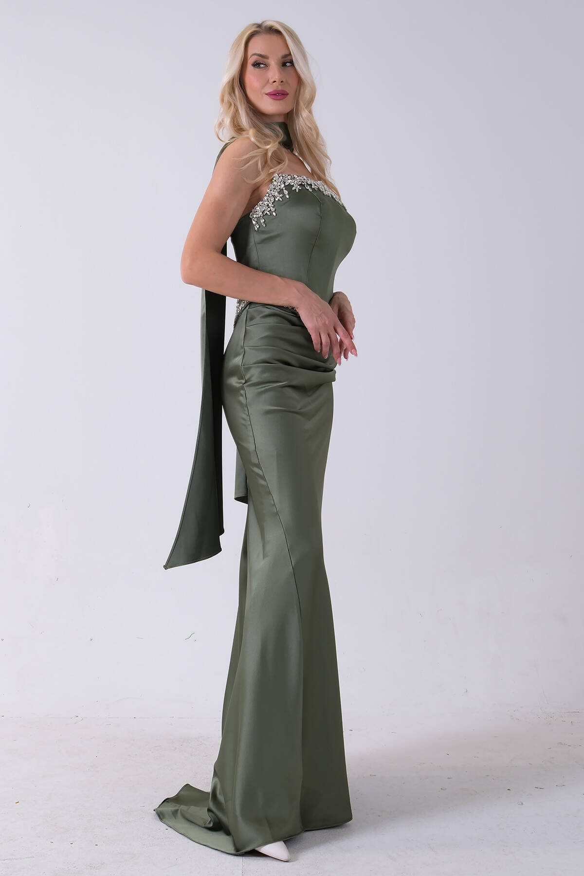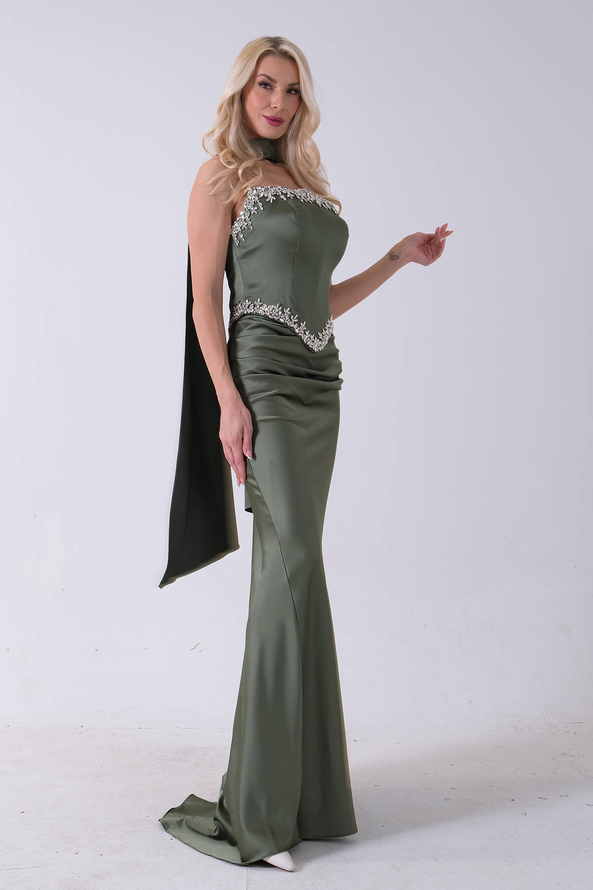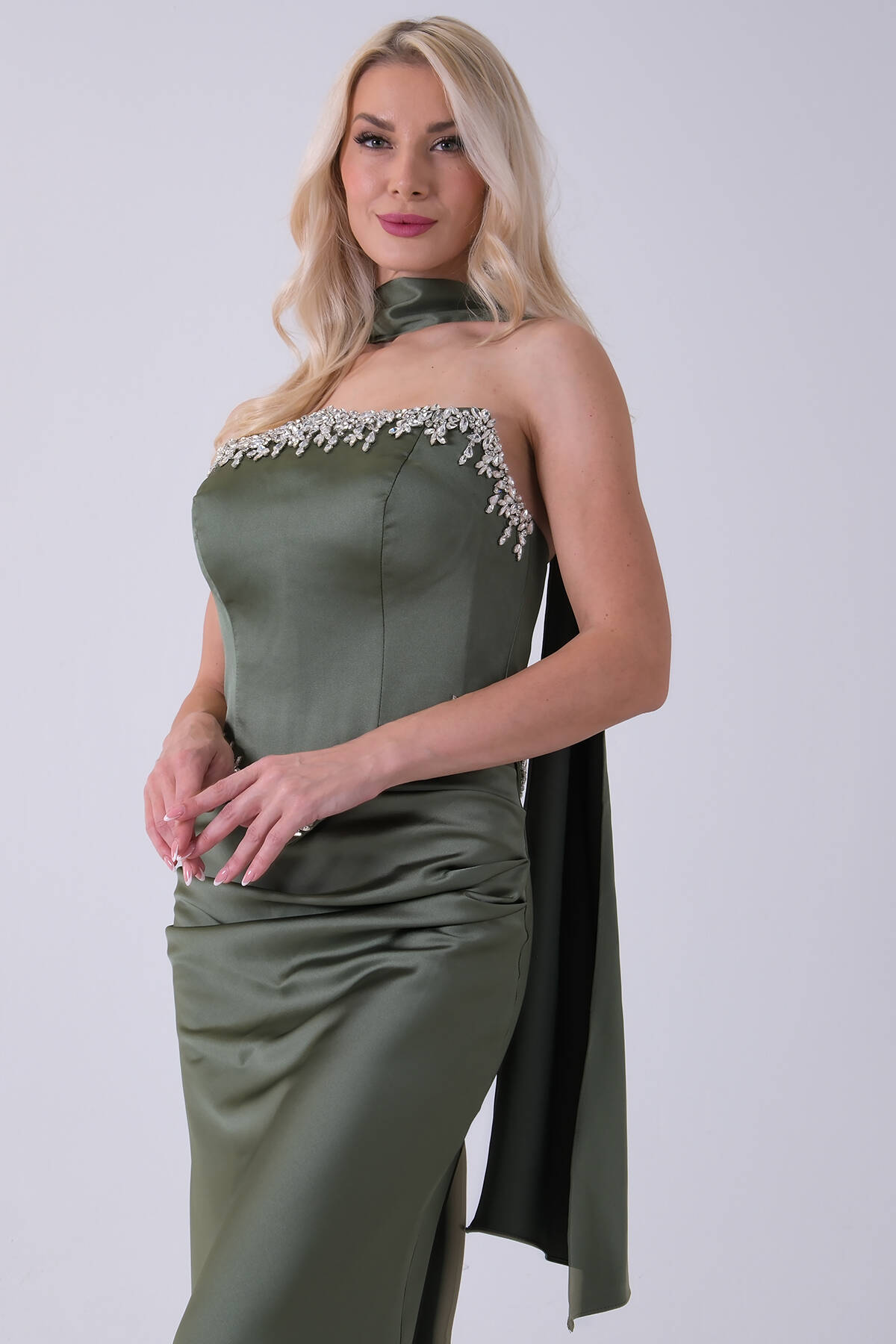 Haki Üzeri Taş İşleme Detaylı Kuşak Bağlama Detaylı Straplez Abiye 08011801.23