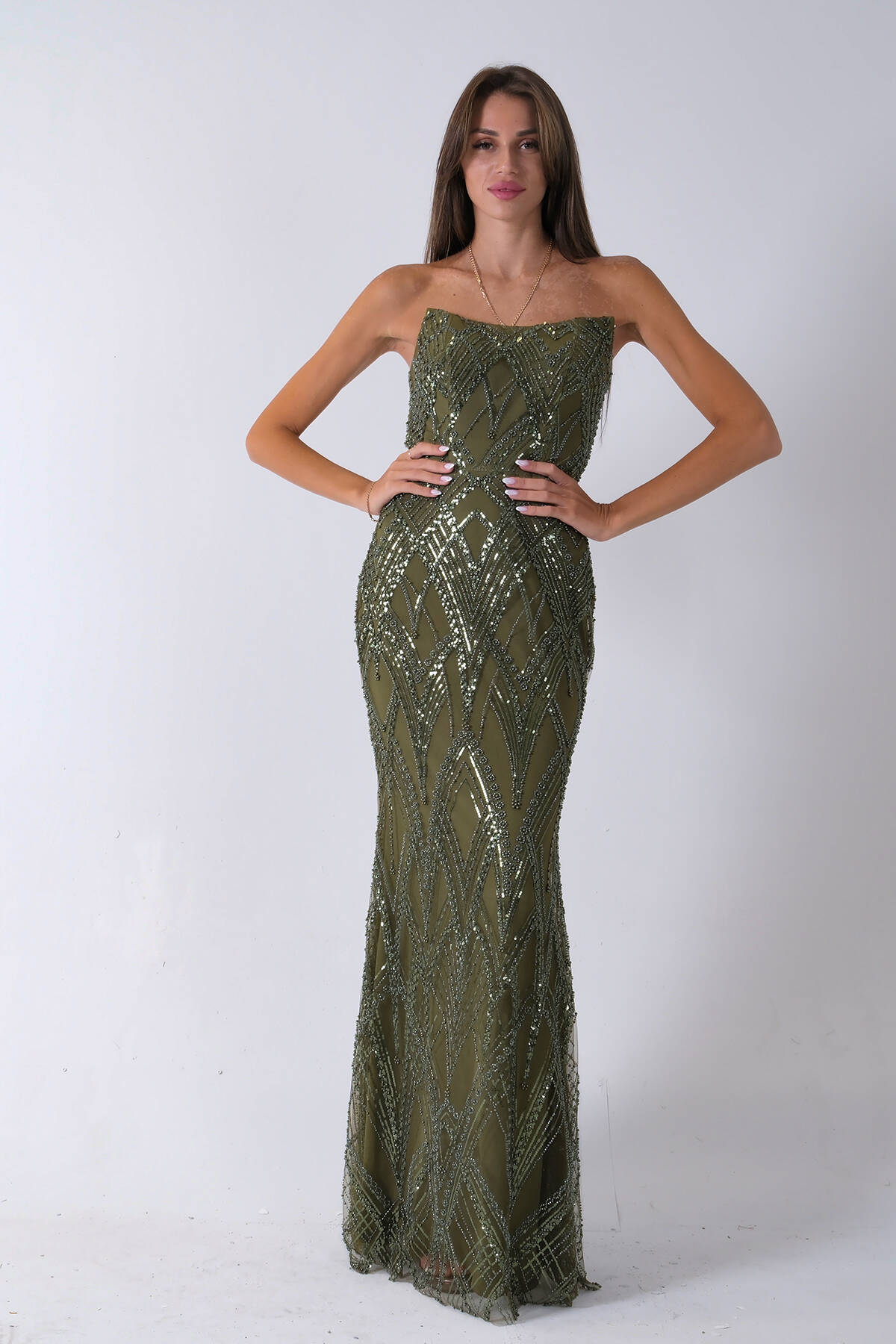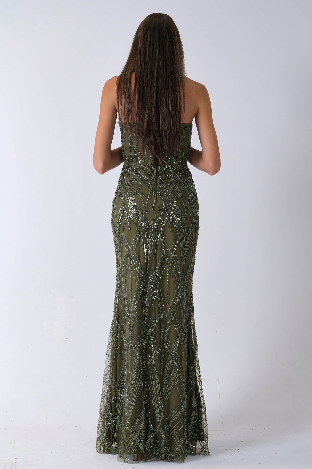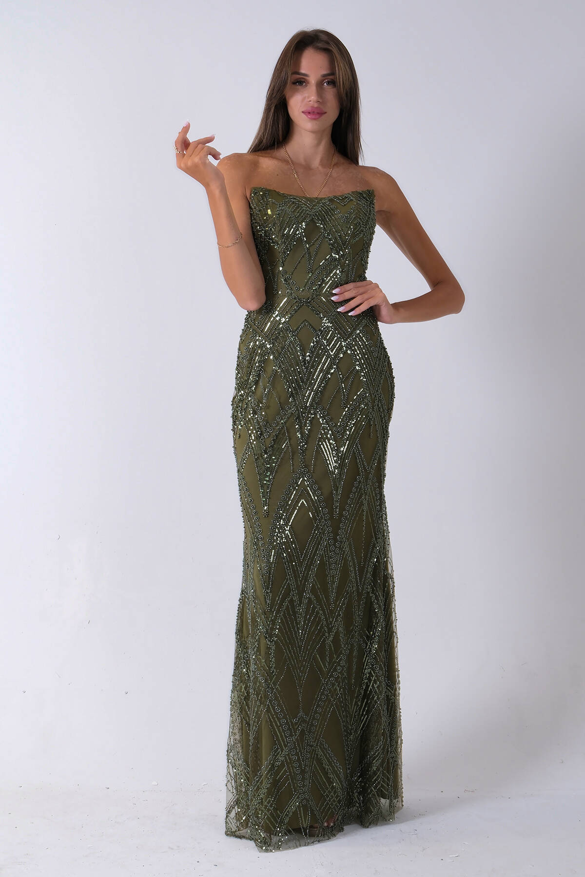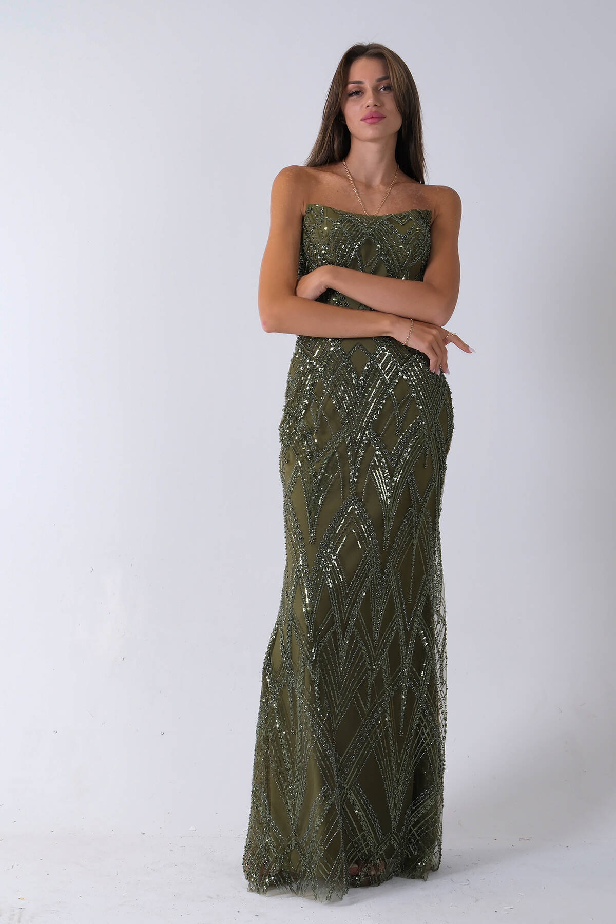 Haki Üzeri Taş İşlemeli Sırt Bağlamalı Straplez Abiye 9705498.23