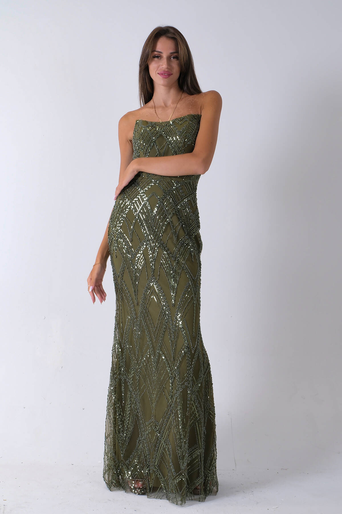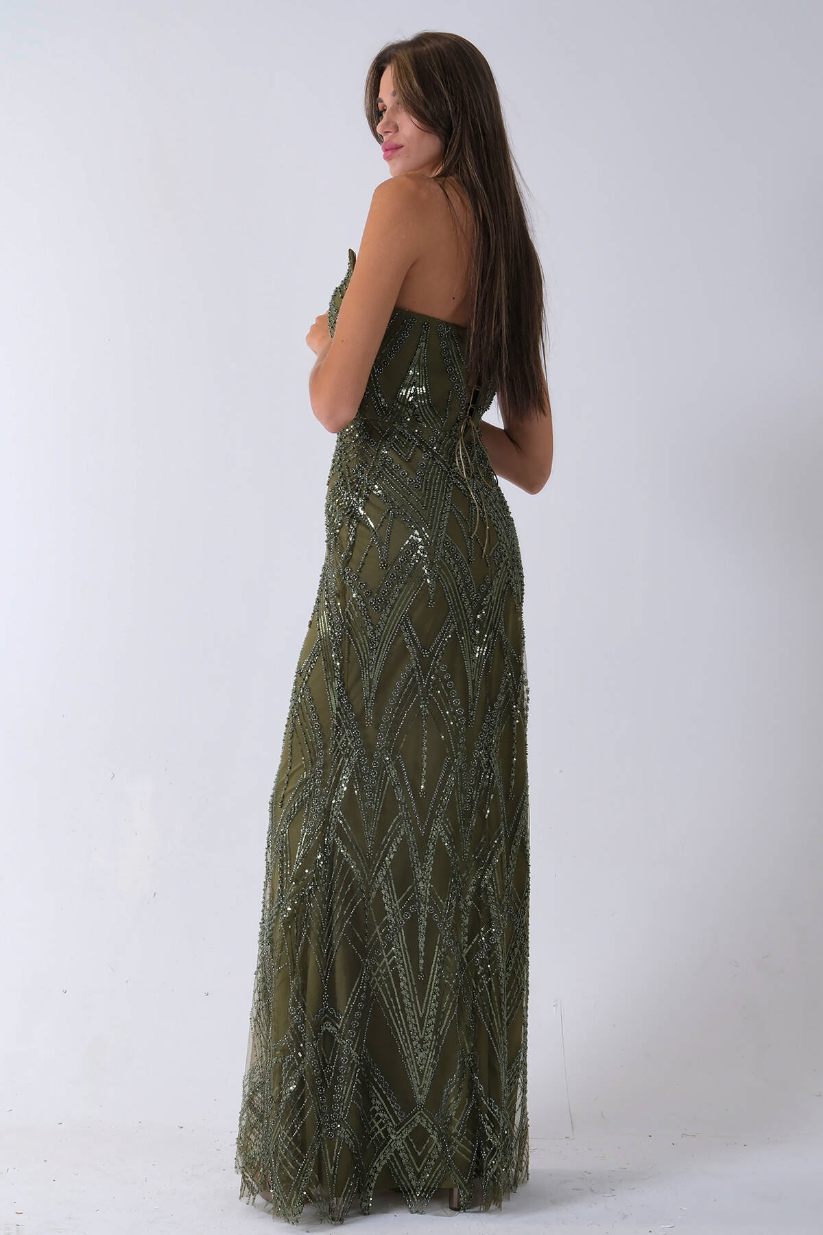 Haki Önü Taş Detaylı Yırtmaçlı Pul Payet Straplez Abiye 0801163.23