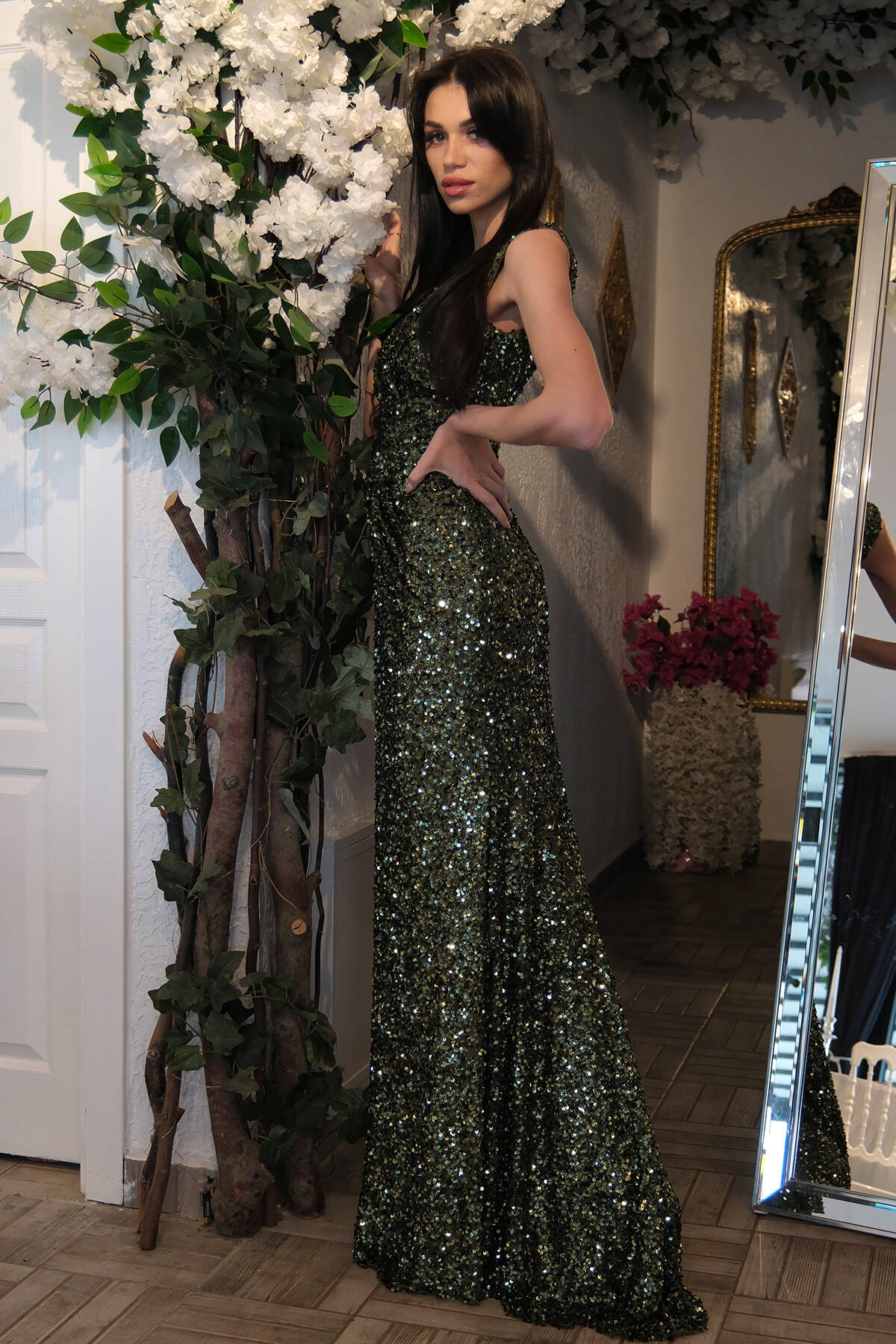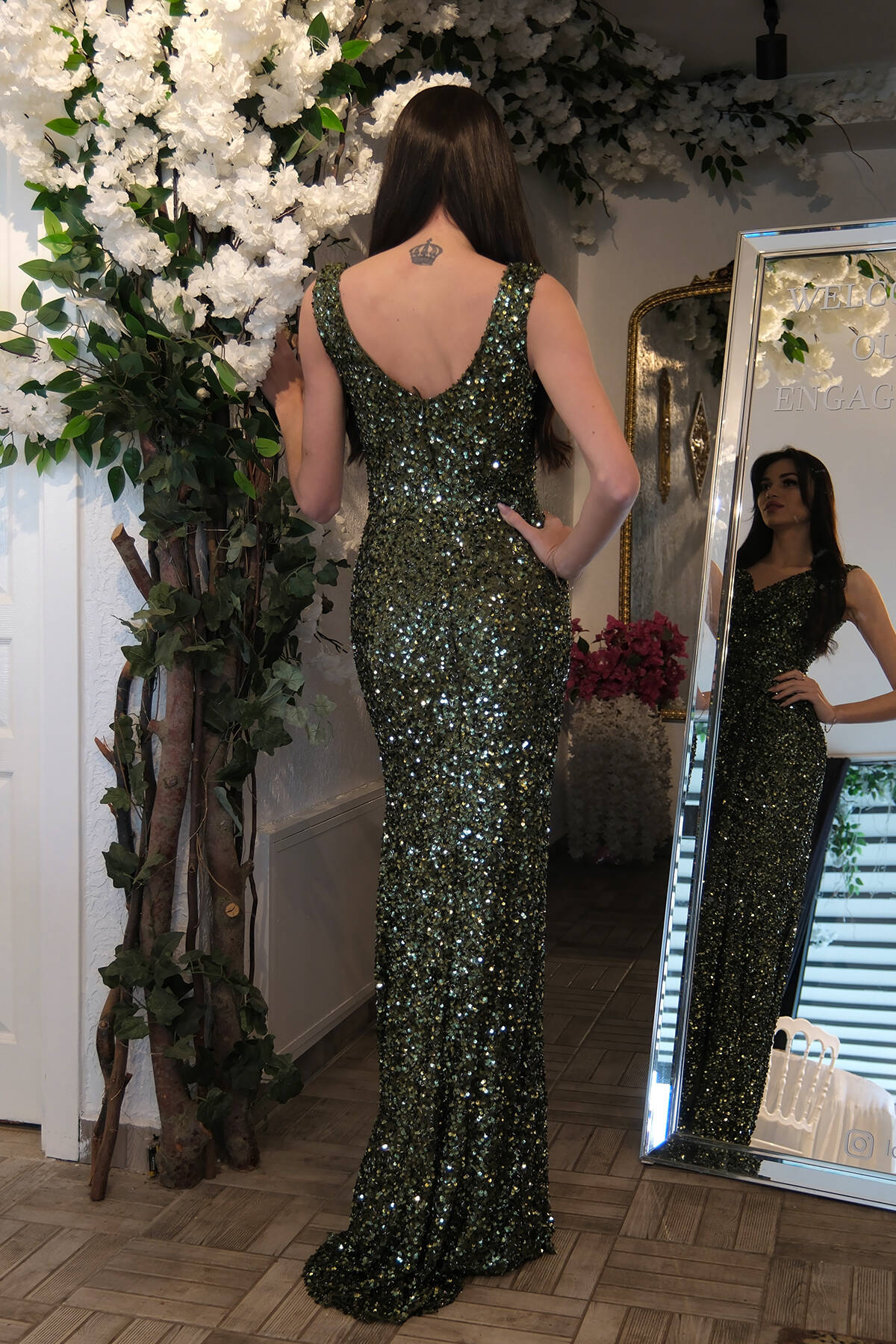 Haki V Yaka Payetli Işıltılı Uzun Abiye 9705495.23