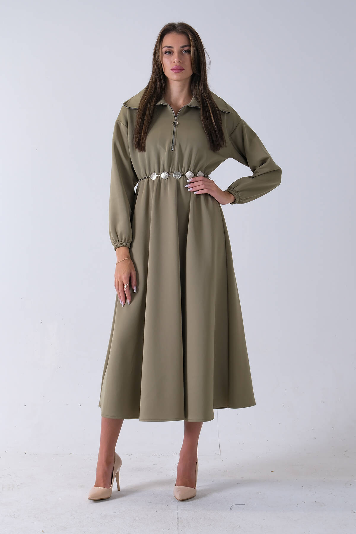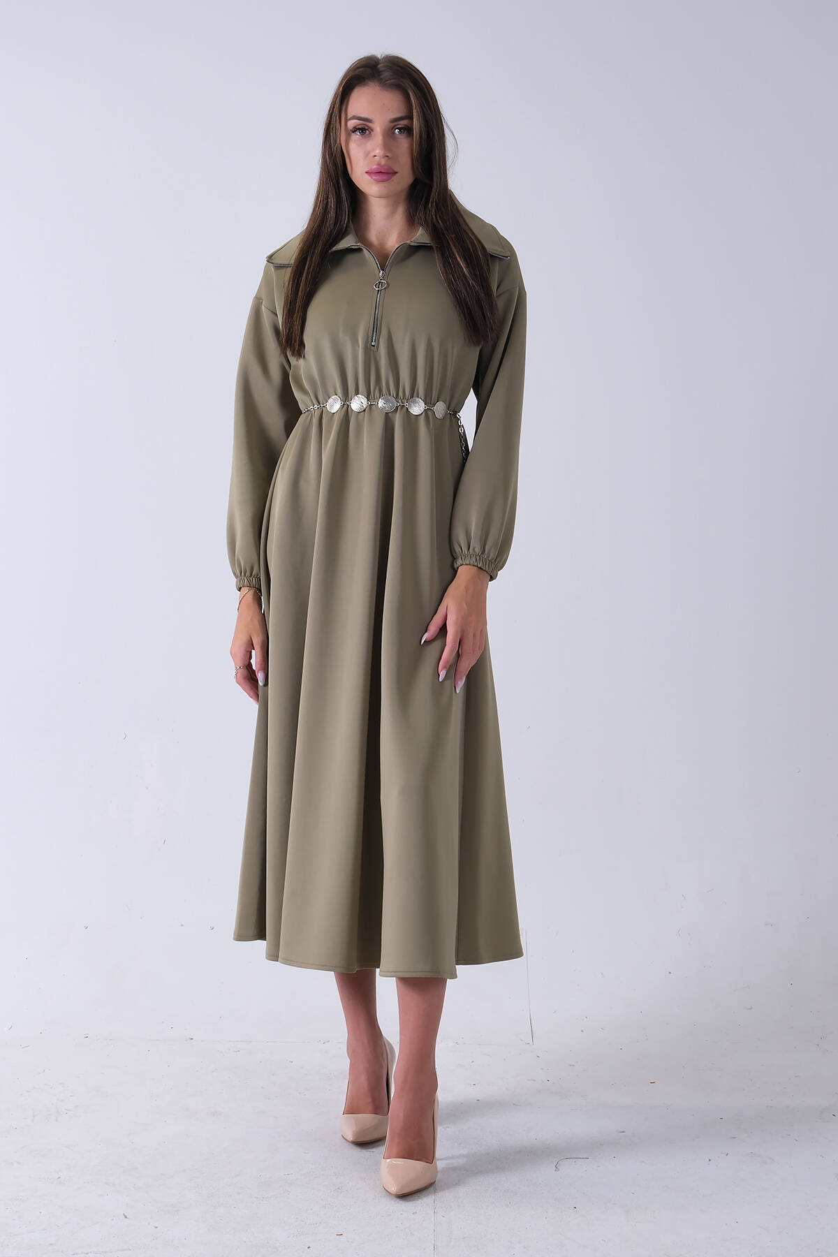 Haki Yaka Fermuar Detaylı Bel ve Bileği Lastikli Kemerli Scuba Elbise 4593455.23