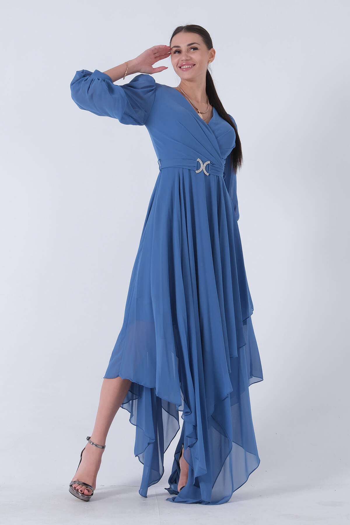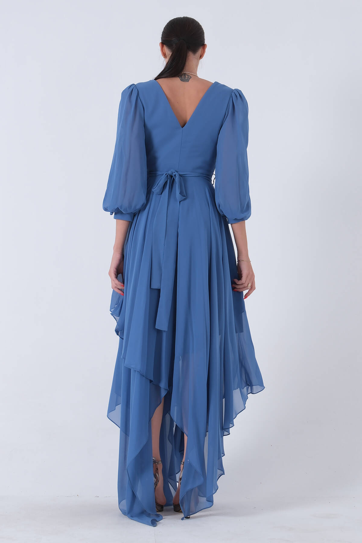 İndigo Balon Kol Kruvaze Yaka Asimetrik Kesim Abiye Elbise 6502417.98